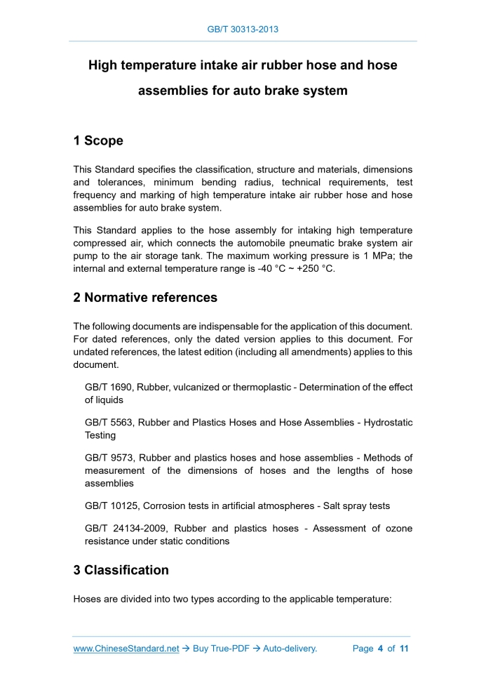 Similar standardsGB/T 30313-2013: High temperature intake air rubber hose and hose assemblies for auto brake system---This is an excerpt. Full copy of true-PDF in English version (including equations, symbols, images, flow-chart, tables, and figures etc.), auto-downloaded/delivered in 9 seconds, can be purchased online: https://www.ChineseStandard.net/PDF.aspx/GBT30313-2013 GB NATIONAL STANDARD OF THE PEOPLE’S REPUBLIC OF CHINA ICS 43.040.40; 83.140.40 G 42 High temperature intake air rubber hose and hose assemblies for auto brake system ISSUED ON: DECEMBER 31, 2013 IMPLEMENTED ON: SEPTEMBER 01, 2014 Issued by: General Administration of Quality Supervision, Inspection and Quarantine; Standardization Administration of the People’s Republic of China. Table of ContentsForeword ... 3 1 Scope ... 4 2 Normative references ... 4 3 Classification ... 4 4 Structure and materials ... 5 5 Dimensions and tolerances ... 5 6 Minimum bending radius ... 5 7 Technical requirements ... 6 8 Test frequency ... 8 9 Marking ... 8 Appendix A (Normative) Type test and routine test ... 10 Appendix B (Informative) Production acceptance test ... 11 High temperature intake air rubber hose and hose assemblies for auto brake system1 ScopeThis Standard specifies the classification, structure and materials, dimensions and tolerances, minimum bending radius, technical requirements, test frequency and marking of high temperature intake air rubber hose and hose assemblies for auto brake system. This Standard applies to the hose assembly for intaking high temperature compressed air, which connects the automobile pneumatic brake system air pump to the air storage tank. The maximum working pressure is 1 MPa; the internal and external temperature range is -40 °C ~ +250 °C.2 Normative referencesThe following documents are indispensable for the application of this document. For dated references, only the dated version applies to this document. For undated references, the latest edition (including all amendments) applies to this document. GB/T 1690, Rubber, vulcanized or thermoplastic - Determination of the effect of liquids GB/T 5563, Rubber and Plastics Hoses and Hose Assemblies - Hydrostatic Testing GB/T 9573, Rubber and plastics hoses and hose assemblies - Methods of measurement of the dimensions of hoses and the lengths of hose assemblies GB/T 10125, Corrosion tests in artificial atmospheres - Salt spray tests GB/T 24134-2009, Rubber and plastics hoses - Assessment of ozone resistance under static conditions3 ClassificationHoses are divided into two types according to the applicable temperature: Take a 450 mm long hose or hose assembly and stretch it longitudinally at a rate of 25 mm/min ± 2.5 mm/min until the hose is separated from the joint or the hose is broken. The load shall not be less than 1 100 N when the nominal inner diameter is 6.3 mm and below; the load shall not be less than 1 500 N when the nominal inner diameter is above 6.3 mm. 7.5 Temperature resistance 7.5.1 High temperature resistance The hose assembly after the verification pressure test in 7.2 is subjected to 72 h ± 2 h hot air aging according to the following environmental conditions: -- Type 1, 200 °C; -- Type 2, 250 °C; Park the sample in the experimental environment for 2 h; then, perform the test according to 7.2; there shall be no leakage. 7.5.2 Low temperature resistance The hose assembly through the verification pressure test in 7.2 shall be frozen for 72 h ± 2 h in a -40 °C environment, and then parked in the experimental environment for 2 h, and then tested according to 7.2. There shall be no leakage. 7.6 Environmental resistance 7.6.1 Oil Test according to GB/T 1690; prepare the sample from the inner lining layer; immerse in ASTM IRM 903 oil at 100 °C ± 2 d for 72 h ± 2 h; take it out; then, perform the measurement. The volume expansion shall not exceed 100%. 7.6.2 Ozone Take out the inner lining layer of the hose assembly; test it under the conditions where the ozone pressure is (100 ± 10) MPa according to Method 1 of GB/T 24134-2009; use a 7x magnifying glass to observe. The hose shall not be cracked. 7.6.3 Salt spray test Perform the test according to GB/T 10125. Support or hang the hose assembly at an angle of 15° ~ 30° from the vertical to expose it to the salt spray for 24 h ± 1 h. After this exposure, the joint shall have no metal corrosion except for the red rust in the marking embossing and wrinkle deformation parts. White rust products are acceptable.8 Test frequencyInspection is divided into type test, production acceptance test and routine test. Type test and routine test shall be carried out in accordance with Appendix A. Type tests are those tests that confirm that the design of a specific hose produced by a specific method meets the requirements of this Standard. The test shall be carried out at most every other year or whenever the manufacturing method or material used changes. The type test shall include all types of hoses of all specifications. Routine tests are those tests required for each finished hose before leaving the factory. Production acceptance tests are those tests that are recommended to control manufacturing quality (see Appendix B). The number of tests specified in Appendix B is for guidance only.9 Marking9.1 The surface of the hose shall have the following obvious marks that are not easy to fall off: a) identification of the hose manufacturer; b) hose name; c) number of this national standard; d) type of the hose; e) nominal inner diameter of the hose; f) date of manufacture (year and month). Example: ......Source: Above contents are excerpted from the full-copy PDF -- translated/reviewed by: www.ChineseStandard.net / Wayne Zheng et al. Tips & Frequently Asked Questions:Question 1: How long will the true-PDF of English version of GB/T 30313-2013 be delivered?Answer: The full copy PDF of English version of GB/T 30313-2013 can be downloaded in 9 seconds, and it will also be emailed to you in 9