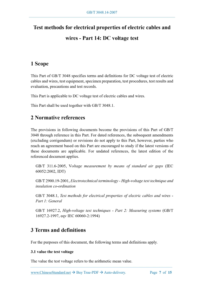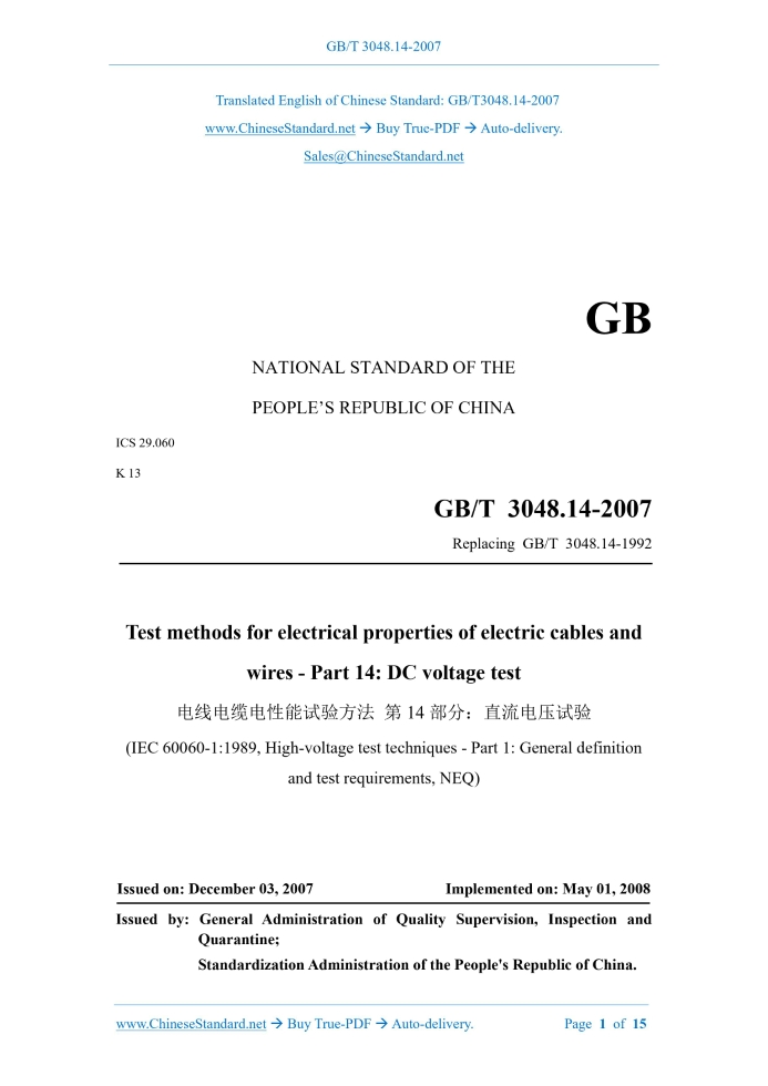 Similar standardsGB/T 3048.14-2007: Test methods for electrical properties of electric cables and wires -- Part 14: DC voltage test---This is an excerpt. Full copy of true-PDF in English version (including equations, symbols, images, flow-chart, tables, and figures etc.), auto-downloaded/delivered in 9 seconds, can be purchased online: https://www.ChineseStandard.net/PDF.aspx/GBT3048.14-2007 NATIONAL STANDARD OF THE PEOPLE’S REPUBLIC OF CHINA ICS 29.060 K 13 Replacing GB/T 3048.14-1992 Test methods for electrical properties of electric cables and wires - Part 14: DC voltage test (IEC 60060-1:1989, High-voltage test techniques - Part 1: General definition and test requirements, NEQ) ISSUED ON: DECEMBER 03, 2007 IMPLEMENTED ON: MAY 01, 2008 Issued by: General Administration of Quality Supervision, Inspection and Quarantine; Standardization Administration of the People's Republic of China. Table of ContentsForeword ... 3 1 Scope ... 7 2 Normative references ... 7 3 Terms and definitions ... 7 4 Test equipment ... 8 5 Specimen preparation ... 10 6 Test procedures ... 11 7 Test results and evaluation ... 14 8 Precautions ... 14 9 Test records ... 15 Test methods for electrical properties of electric cables and wires - Part 14: DC voltage test1 ScopeThis Part of GB/T 3048 specifies terms and definitions for DC voltage test of electric cables and wires, test equipment, specimen preparation, test procedures, test results and evaluation, precautions and test records. This Part is applicable to DC voltage test of electric cables and wires. This Part shall be used together with GB/T 3048.1.2 Normative referencesThe provisions in following documents become the provisions of this Part of GB/T 3048 through reference in this Part. For dated references, the subsequent amendments (excluding corrigendum) or revisions do not apply to this Part, however, parties who reach an agreement based on this Part are encouraged to study if the latest versions of these documents are applicable. For undated references, the latest edition of the referenced document applies. GB/T 311.6-2005, Voltage measurement by means of standard air gaps (IEC 60052:2002, IDT) GB/T 2900.19-2001, Electrotechnical terminology - High-voltage test technique and insulation co-ordination GB/T 3048.1, Test methods for electrical properties of electric cables and wires - Part 1: General GB/T 16927.2, High-voltage test techniques - Part 2: Measuring systems (GB/T 16927.2-1997, eqv IEC 60060-2:1994)3 Terms and definitionsFor the purposes of this document, the following terms and definitions apply. 3.1 value the test voltage The value the test voltage refers to the arithmetic mean value. composed of a voltage regulator (or pulse width modulation, frequency conversion device), a rectifier transformer, a rectifier element, a filter capacitor, a polarity conversion device and a discharge resistor. 4.2.3 The rated output current of the power supply shall charge the specimen capacitor in a relatively short time. However, charging times of up to several minutes are also allowed when the specimen capacitance is large. The power supply (including the storage capacitor) shall also be able to supply leakage current and sink current, as well as any internal and external non-destructive discharge current. Its voltage drop shall not exceed 10%. 4.3 Measurement of test voltage 4.3.1 Use the measurement device that meets GB/T 16927.2 to measure Usually, use the measurement device that is approved by the specified programs in GB/T 16927.2 to measure arithmetic mean, maximum value, ripple factor and instantaneous voltage drop of test voltage. When measuring ripple, transient voltage or voltage stability, the response characteristics of the measurement device shall meet the requirements. The general requirement is that the overall uncertainty of the measurement of the arithmetic mean of the test voltage shall not exceed ±3%. 4.3.2 Use approved measurement device to calibrate unapproved measurement device This method is usually to establish a relationship between the displayed value of some instrument related to the test voltage and the measurement of the same voltage. The measurement of its voltage can be carried out according to 4.3 or use the ball gap in accordance with GB/T 311.6-2005. This relationship may be related to factors such as the specimen, the access to the spherical gap, the amount of rainfall in the wet test. Therefore, these conditions shall remain the same during calibration and actual testing. To prevent spark discharge, the distance of the ball gap shall be wide enough. It shall be noted that the relationship between supply voltage and output voltage may not be reliable enough for measurement. Resistive voltage dividers are currently used. The voltage divider ratio error shall not exceed ±1%. The measuring current of the voltage divider shall be greater than 0.5mA under the rated voltage. The low-voltage arm of the voltage divider is connected to a low-voltage readout instrument with an error of no more than ±0.5% through the measuring coaxial cable. When using ball gap to measure the DC voltage, precautions must be taken because the fibers can cause discharges at lower voltages. The voltage shall be applied several times. The highest voltage value shall be used as the actual measurement value. NOTE 1: The influence of fibers can be eliminated by blowing air with a speed of not less than 3m/s through the spherical gap. NOTE 2: When ripple is present, the ball gap cannot measure the arithmetic mean of the DC voltage. During calibration, extrapolation of the test voltage value of not less than 50% can usually be used. If the current in the test loop does not vary linearly with the applied voltage, the extrapolation method may have large errors. 4.4 Measurement of test current When measuring the current flowing through the specimen, several independent components can be distinguished. For the same specimen and the same test voltage, the magni