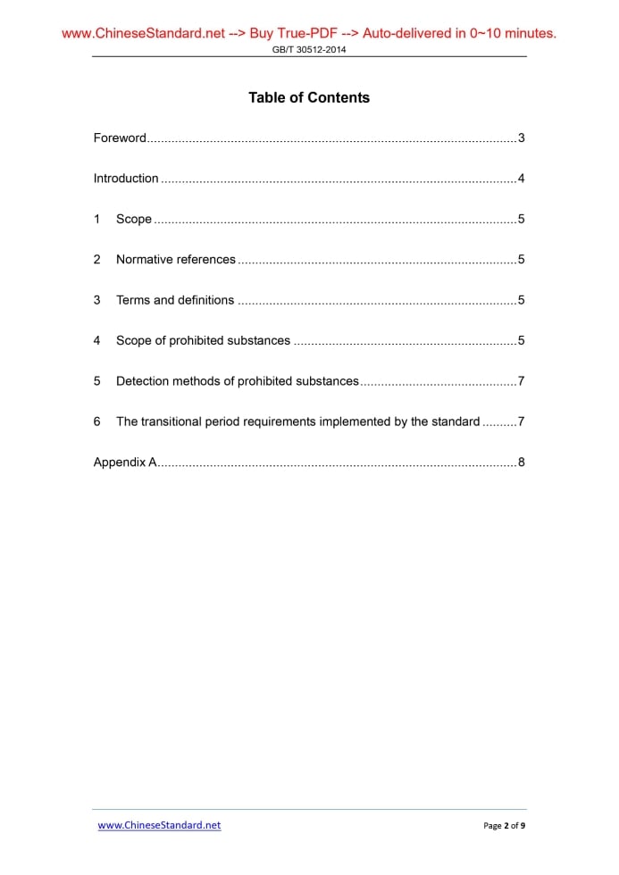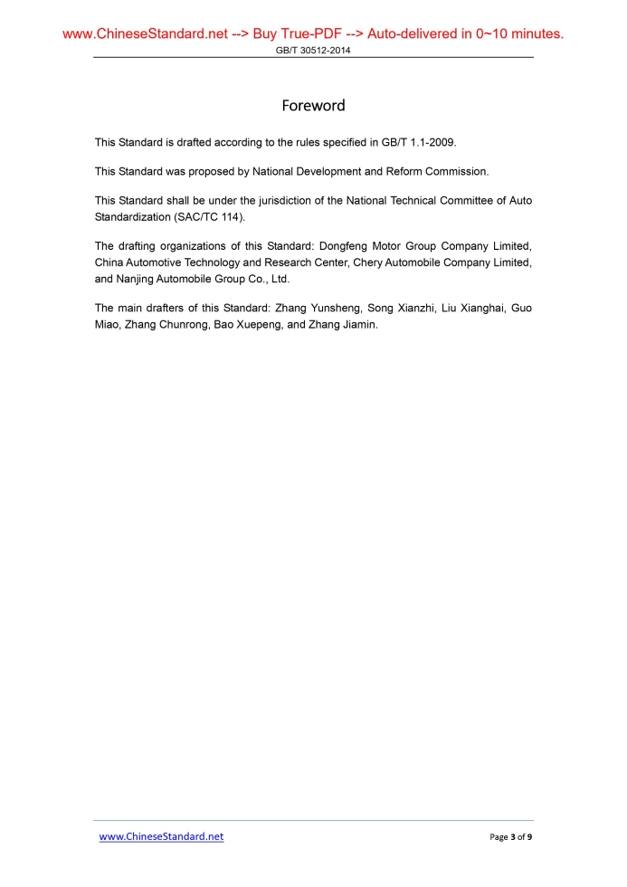 Similar standardsGB/T 30512-2014: Requirements for prohibited substances on automobiles---This is an excerpt. Full copy of true-PDF in English version (including equations, symbols, images, flow-chart, tables, and figures etc.), auto-downloaded/delivered in 9 seconds, can be purchased online: https://www.ChineseStandard.net/PDF.aspx/GBT30512-2014GB ICS 43.020 T 40 NATIONAL STANDARD Requirements for prohibited substances on automobiles Issued on: FEBRUARY 19, 2014 Implemented on: JUNE 1, 2014 Issued by. General Administration of Quality Supervision, Inspection and Quarantine of the People’s Republic of China; Standardization Administration of the People’s Republic of China. Table of ContentsForeword... 3 Introduction... 4 1 Scope... 5 2 Normative references... 5 3 Terms and definitions... 5 4 Scope of prohibited substances... 5 5 Detection methods of prohibited substances... 7 6 The transitional period requirements implemented by the standard... 7 Appendix A... 8ForewordThis Standard is drafted according to the rules specified in GB/T 1.1-2009. This Standard was proposed by National Development and Reform Commission. This Standard shall be under the jurisdiction of the National Technical Committee of Auto Standardization (SAC/TC 114). The drafting organizations of this Standard. Dongfeng Motor Group Company Limited, China Automotive Technology and Research Center, Chery Automobile Company Limited, and Nanjing Automobile Group Co., Ltd. The main drafters of this Standard. Zhang Yunsheng, Song Xianzhi, Liu Xianghai, Guo Miao, Zhang Chunrong, Bao Xuepeng, and Zhang Jiamin.IntroductionIn order to adapt to develop the circular economy of our nation, to protect the environment and human health, to meet the demands of building a resource-saving and environment-friendly society, and to improve the technical level of domestic sales of vehicles, this Standard is hereby formulated. This Standard is intended to enable the domestic automobile manufacturers and automobile import agents to prohibit the use of lead, mercury, cadmium, hexavalent chromium, polybrominated biphenyls, and poly brominated diphenyl ethers in the research and development, production, importation, marketing and other channels of automobile products. Restriction requirements on other hazardous substances in this Standard are not specified. This Standard has fully considered the technical capacity and feasibility on implementing the standard of automobile industry in the formulation process, as well as the supervision and inspection capacity of domestic related institutions, based on the standard to automobile products. The technical provisions and requirements of the standard shall be consistent with China’s recycling technical policy and related management methods as much as possible and close to the internationally acceptable technical regulations. At the same time, when determining the technical requirements, technical indicators and the exemption deadline of the standard, it shall fully considered China’s economic development level and production level, technical capacity and product status of automobile industry. Limit indicators of prohibited substances and exempt automotive materials and parts list at a given period are formed and based on the sampling inspection and verification of domestic automobile parts products. National Technical Committee of Auto Standardization will timely modify and adjust the scope, content requirements, exemption scope and deadline of prohibited substances in the list according to the requirements of development situation of China’s automobile industry, technical progress of automobile products, protecting environment of nation and human health. The maintenance accessories of automobiles sold after implementation time of the standard shall be in accordance with the requirements for prohibited substances on automobiles, as same as the new models. Before the stipulated implementation time, automobile models which have been noticed or imported for sales can continue to use the spare parts of raw materials for maintenance, but it is encouraged that the maintenance parts shall be the same materials as new models. Requirements for prohibited substances on automobiles1 ScopeThis Standard specifies the prohibited substances of automobile and its parts products. This Standard applies to the automobile and parts products used in China.2 Normative referencesThe following documents are essential to the application of this document. For the dated documents, only the versions with the dates indicated are applicable to this document; for the undated documents, only the latest version (including all the amendments) are applicable to this document. QC/T 941-2013 Test methods of mercury in automobiles materials QC/T 942-2013 Test methods of hexavalent chromium in automotive materials QC/T 943-2013 Test methods of lead and cadmium in automotive materials QC/T 944-2013 Test methods of polybrominated biphenyls and polybrominated diphenyl ethers in automotive materials3 Terms and definitionsFor the purpose of this document, the following terms and definitions apply. 3.1 Homogeneous materials Parts or modules (such as unscrewing, cutting, rolling, scraping, and grinding) which can not be further split by mechanical methods, and the composition of each part is of the same material.4 Scope of prohibited substances4.1 Scope of prohibited substances In particular, the prohibited substances required in this Standard refer to the following 6 substances. 4.2 Content limits of prohibited substances In addition to the automobile parts and materials exempted within a certain period stipulated in Appendix A, the mass percentage of lead, mercury, hexavalent chromium, polybrominated biphenyls (PBBs), polybrominated diphenyl ethers (PBDEs) in each homogeneous materials of automobiles and parts products shall not exceed 0.1% and the mass percentage of cadmium shall not exceed 0.01%. 4.3 Exemption requirements for prohibite