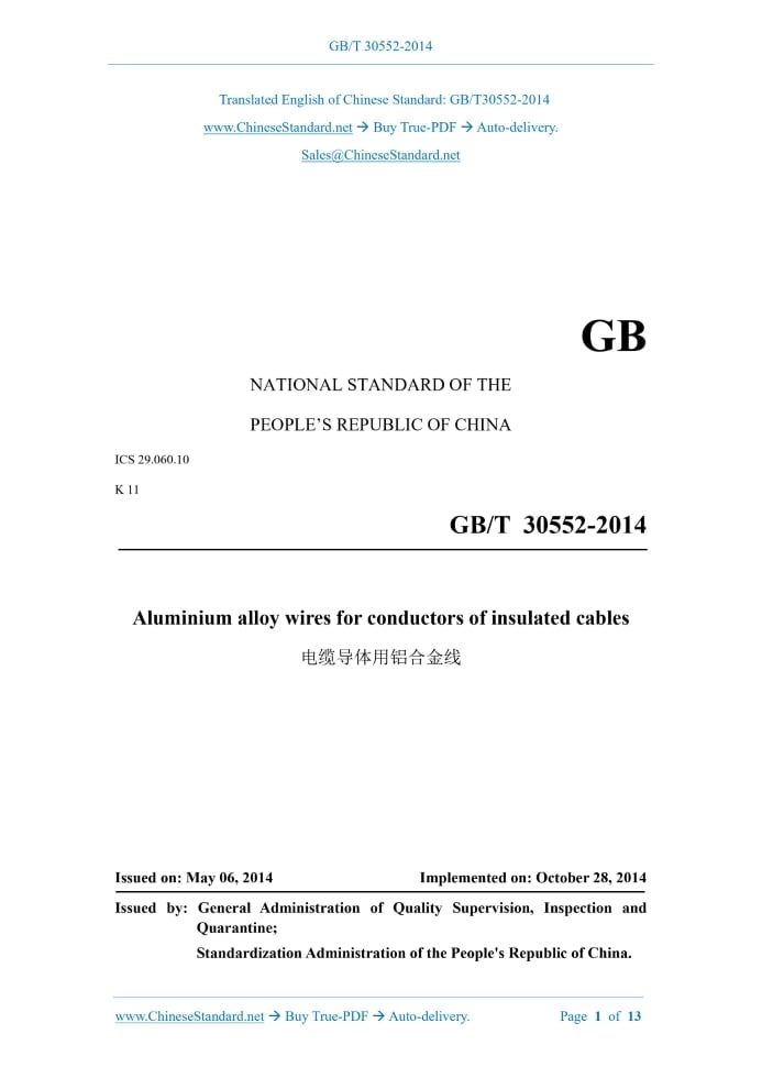 GB/T 30552-2014: Aluminium alloy wires for conductors of insulated cables Delivery: 9 seconds. True-PDF full-copy in English & invoice will be downloaded + auto-delivered via email. See step-by-step procedure Status: Valid