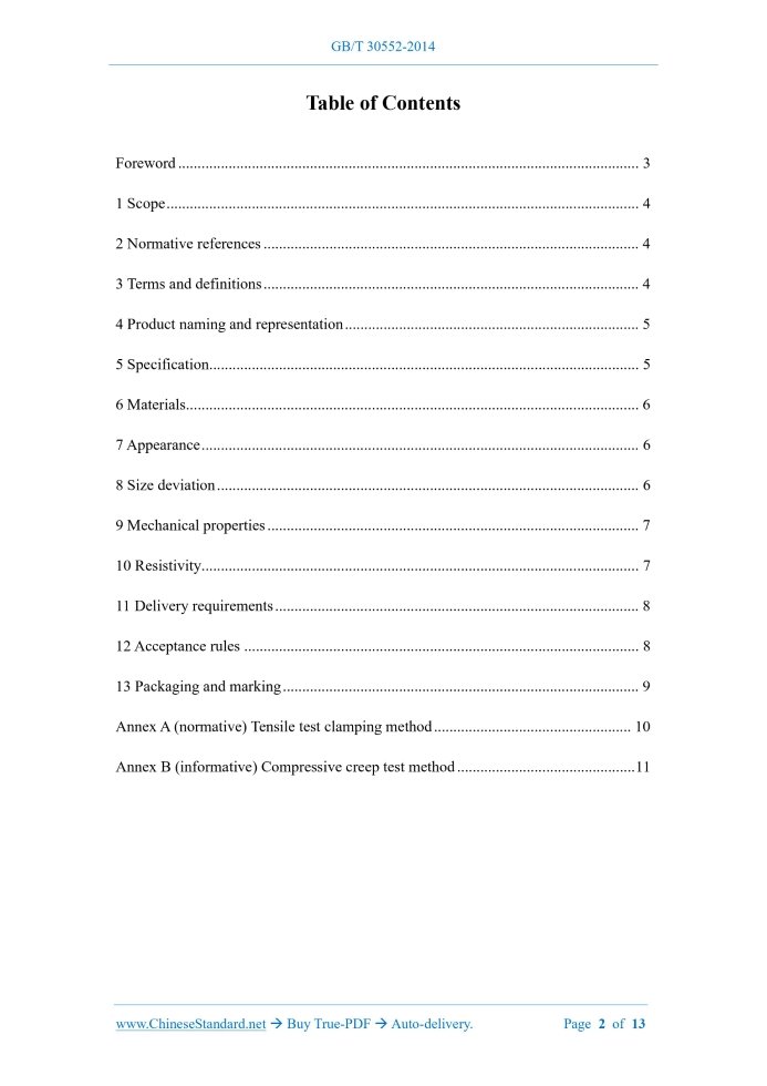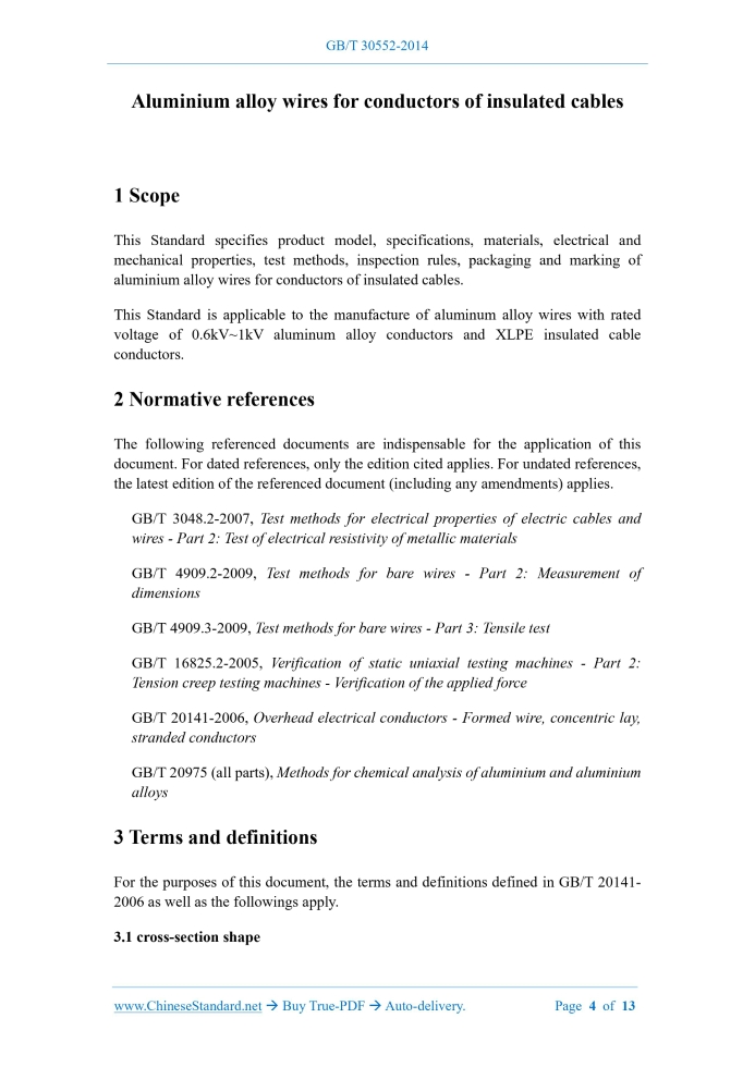 Similar standardsGB/T 30552-2014: Aluminium alloy wires for conductors of insulated cables---This is an excerpt. Full copy of true-PDF in English version (including equations, symbols, images, flow-chart, tables, and figures etc.), auto-downloaded/delivered in 9 seconds, can be purchased online: https://www.ChineseStandard.net/PDF.aspx/GBT30552-2014NATIONAL STANDARD OF THE PEOPLE’S REPUBLIC OF CHINA ICS 29.060.10 K 11 Aluminium alloy wires for conductors of insulated cables ISSUED ON: MAY 06, 2014 IMPLEMENTED ON: OCTOBER 28, 2014 Issued by: General Administration of Quality Supervision, Inspection and Quarantine; Standardization Administration of the People's Republic of China. Table of ContentsForeword ... 3 1 Scope ... 4 2 Normative references ... 4 3 Terms and definitions ... 4 4 Product naming and representation ... 5 5 Specification ... 5 6 Materials ... 6 7 Appearance ... 6 8 Size deviation ... 6 9 Mechanical properties ... 7 10 Resistivity ... 7 11 Delivery requirements ... 8 12 Acceptance rules ... 8 13 Packaging and marking ... 9 Annex A (normative) Tensile test clamping method ... 10 Annex B (informative) Compressive creep test method ... 11 Aluminium alloy wires for conductors of insulated cables1 ScopeThis Standard specifies product model, specifications, materials, electrical and mechanical properties, test methods, inspection rules, packaging and marking of aluminium alloy wires for conductors of insulated cables. This Standard is applicable to the manufacture of aluminum alloy wires with rated voltage of 0.6kV~1kV aluminum alloy conductors and XLPE insulated cable conductors.2 Normative referencesThe following referenced documents are indispensable for the application of this document. For dated references, only the edition cited applies. For undated references, the latest edition of the referenced document (including any amendments) applies. GB/T 3048.2-2007, Test methods for electrical properties of electric cables and wires - Part 2: Test of electrical resistivity of metallic materials GB/T 4909.2-2009, Test methods for bare wires - Part 2: Measurement of dimensions GB/T 4909.3-2009, Test methods for bare wires - Part 3: Tensile test GB/T 16825.2-2005, Verification of static uniaxial testing machines - Part 2: Tension creep testing machines - Verification of the applied force GB/T 20141-2006, Overhead electrical conductors - Formed wire, concentric lay, stranded conductors GB/T 20975 (all parts), Methods for chemical analysis of aluminium and aluminium alloys3 Terms and definitionsFor the purposes of this document, the terms and definitions defined in GB/T 20141- 2006 as well as the followings apply. 3.1 cross-section shape The shape of a single wire cross section. The cross-section shape of aluminium alloy wires for conductors of insulated cables is divided into two types: circular cross-section and special-shaped cross-section. 3.2 nominal value A nominal or flag value of a measurable performance, used to mark a single line and give a tolerance. 3.3 equivalent wire diameter The diameter of a circular single wire with the same cross-section area, mass and resistance as the profiled wire of the same material and condition. [GB/T 20141-2006, definition 3.5]4 Product naming and representationAluminium alloy wires for conductors of insulated cables are indicated by model, state, specification and serial number of this Standard. The representation method is as follows: Example: The aluminium alloy wire for conductors of insulated cables, of which the nominal equivalent wire diameter is 3.000mm, the composition code is 1, the state is soft, is expressed as: DLH1/R-3.000 GB/T 30552-20145 SpecificationThe specification of aluminium alloy wires for conductors of insulated cables is expressed by nominal diameter or nominal equivalent wire diameter. The range shall comply with the provisions of Table 1. Table 1 -- Model specifications of aluminium alloy wires for conductors of Reference to this Standard Specification [□ is the nominal diameter or the nominal equivalent wire diameter, in millimeters (mm)] State (□ is soft state R or hard state Y) Model (DLH means the aluminium alloy wires for conductors of insulated cables, □ means component code of 1, 2, 3, 4, 5, 6) B.2.3 Use a heating device to heat the specimen to the specified temperature for the test. The allowable deviation between the specified temperature and the displayed temperature shall not be greater than ±3℃. The maximum allowable temperature deviation in the length direction of the specimen is 3°C. The resolution of the temperature display device shall be at least 0.5℃. The accuracy of the temperature measuring device shall be equal to or better than 1°C. The temperature drift of the thermocouple during the calibration period shall not exceed ±1°C. B.2.4 The working surfaces of the upper and lower platens of the testing machine shall be parallel. The parallelism within 100mm of the specimen installation area shall not be less than 1:0.0002mm/mm. During the test, there shall be no lateral relative displacement and rotation between the upper and lower pressing plates. The hardness of the pressing plate shall not be lower than 55HRC. B.3 Test method B.3.1 The temperature of compressive creep test shall be 50℃~120℃. The test compressive stress shall not be greater than the yield strength of the specimen. The compressive stress shall not be less than 70% of the yield strength. B.3.2 Place the specimen vertically between the upper and lower pressing plates of the creep endurance testing machine. When the specimen is installed, adjust the specimen to make its longitudinal axis coincide with the longitudinal axis of the pressure plate. Close the environmental chamber. Heat the specimen to the specified test temperature. To thermally equilibrate the specimen, gripping device, and extensometer, the specimen shall be held at least 30min before the test force is applied. When testing with an installed exten