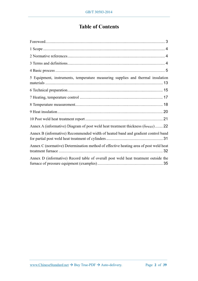 Similar standardsGB/T 30583-2014: Specification for post weld heat treatment of pressure equipment---This is an excerpt. Full copy of true-PDF in English version (including equations, symbols, images, flow-chart, tables, and figures etc.), auto-downloaded/delivered in 9 seconds, can be purchased online: https://www.ChineseStandard.net/PDF.aspx/GBT30583-2014NATIONAL STANDARD OF THE PEOPLE’S REPUBLIC OF CHINA ICS 25.200 J 36 Specification for post weld heat treatment of pressure equipment Issued on. MAY 06, 2014 Implemented on. DECEMBER 01, 2014 Issued by. General Administration of Quality Supervision, Inspection and Quarantine; Standardization Administration of the People's Republic of China. Table of ContentsForeword... 3 1 Scope... 4 2 Normative references... 4 3 Terms and definitions... 4 4 Basic process... 5 5 Equipment, instruments, temperature measuring supplies and thermal insulation materials... 13 6 Technical preparation... 15 7 Heating, temperature control... 17 8 Temperature measurement... 18 9 Heat insulation... 20 10 Post weld heat treatment report... 21 Annex A (informative) Diagram of post weld heat treatment thickness (δPWHT)... 22 Annex B (informative) Recommended width of heated band and gradient control band for partial post weld heat treatment of cylinders... 31 Annex C (normative) Determination method of effective heating area of post weld heat treatment furnace... 32 Annex D (informative) Record table of overall post weld heat treatment outside the furnace of pressure equipment (examples)... 351 ScopeThis document specifies general basic technical requirements for post weld heat treatment of steel pressure equipment. This document applies to post weld heat treatment of boilers and pressure vessels (excluding gas cylinders).2 Normative referencesThe following referenced documents are indispensable for the application of this document. For dated references, only the edition cited applies. For undated references, the latest edition of the referenced document (including any amendments) applies. GB/T 3375, Welding terminology GB/T 9452, Testing method for working zone of heat treatment furnace NB/T 47014, Welding procedure qualification for pressure equipment3 Terms and definitionsFor the purposes of this document, the terms and definitions defined in GB/T 3375, GB/T 9452 as well as the followings apply. 3.1 weldment Welded pressure equipment or parts thereof. 3.2 post weld heat treatment The process that, to eliminate the welding residual stress and improve the structure and performance of the welded joint, the weldment is uniformly heated to a sufficiently high temperature below the phase transition point of the metal, kept for a certain period of time, and then uniformly cooled. 3.3 soak band During partial post weld heat treatment, the area that the volume range over which the weldment reaches the specified temperature is on its surface. The soak band includes the weld zone, fusion zone, heat-affected zone and its adjacent base metal. 3.5 gradient control band The area that during partial post weld heat treatment, to prevent heat dissipation in the temperature range and heating range of the weldment, a thermal insulation material is laid on its surface. 3.7 holding time The time during which the indicated volume range of the weldment or its local soak band is maintained at the holding temperature. The holding time is calculated from the time when the temperature of all temperature measuring points reaches the minimum holding temperature.4 Basic process4.1 General provisions 4.1.1 In addition to complying with this Standard, the post weld heat treatment of pressure equipment shall also comply with the requirements of product standards, design documents and contracts. 4.1.4 The constructer of pressure equipment shall have technical personnel, who have certain professional knowledge and sufficient practical experience, after they master the following basic conditions, prepare "Process specifications for post weld heat treatment" for each (piece) weldment. 4.1.5 The welding process evaluation items used for weldments shall include all important factors and supplementary factors that may occur during the implementation of the "Process specifications for post weld heat treatment". 4.2 Post weld heat treatment thickness δPWHT 4.2.1 The δPWHT of equal thickness full penetration butt joint is the weld thickness (excess height is not counted). At this time, δPWHT is the same as the base metal thickness. 4.2.4 The values of δPWHT when welding pressure components with different thicknesses are as follows (see Annex A). 4.2.5 Thickness of post weld heat treatment calculation holding time. 4.3 Post weld heat treatment methods 4.3.3 Partial post weld heat treatment 4.4 Specification parameters of post weld heat treatment 4.4.1 The specification parameters of post weld heat treatment are shown in Table 1. 4.4.1.1 For Fe-1 and Fe-3 steel weldments, when the post weld heat treatment is performed below the minimum holding temperature in Table 1, the holding time can be extended as specified in Table 2.The holding temperature of Fe-9B steel weldments shall not exceed 635℃. When the post weld heat treatment is performed below the minimum holding temperature in Table 1 (up to 55°C reduction is allowed), the holding time can be extended according to the provisions of Table 2. 4.4.1.5 Limits of post weld heat treatment temperature for Fe-5B-2 steel weldments under the following conditions. 4.4.2 The holding time of post weld heat treatment can be completed in one heat treatment process. It can also be the accumulation of multiple heat treatment processes at the same holding temperature. 4.4.3 Unless otherwise specified, the temperature of each temperature measurement point is allowed to be within ±20°C of the specified temperature of the heat treatment process but cannot exceed the specified limit.5 Equipment, instruments, temperature measuring suppliesand thermal insulation mate