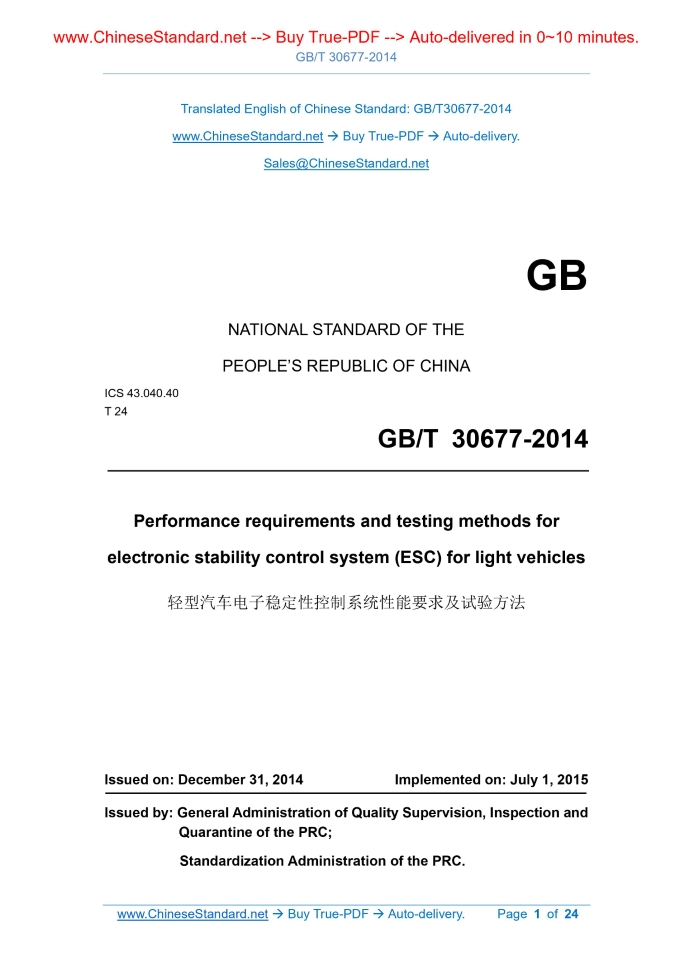GB/T 30677-2014: Performance requirements and testing methods for electronic stability control system (ESC) for light vehicles Delivery: 9 seconds. True-PDF full-copy in English & invoice will be downloaded + auto-delivered via email. See step-by-step procedure Status: Valid
