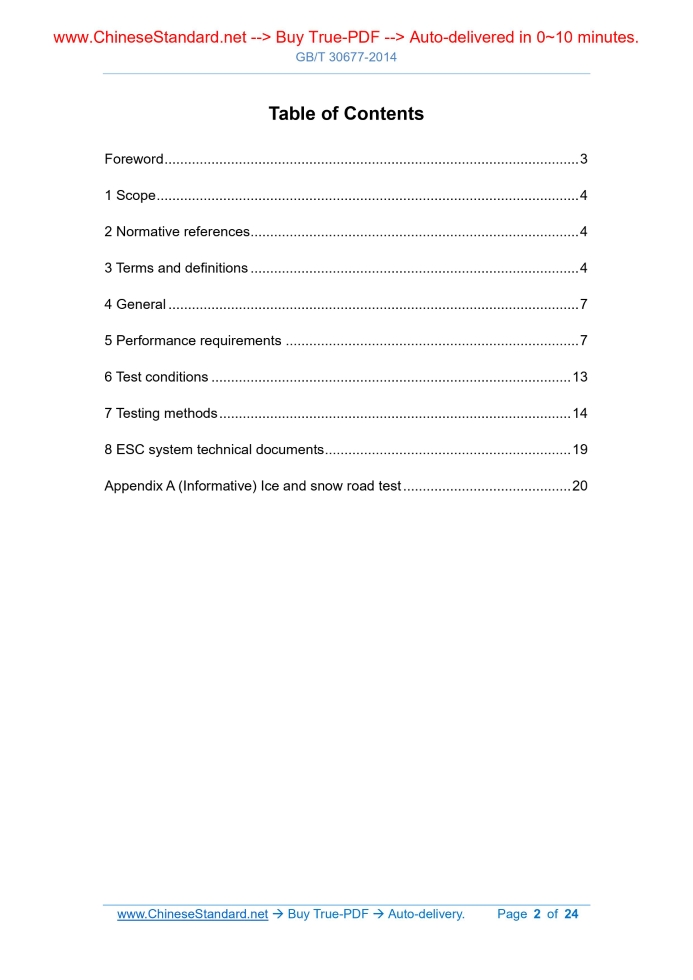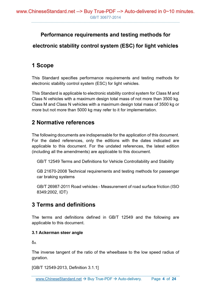 Similar standardsGB/T 30677-2014: Performance requirements and testing methods for electronic stability control system (ESC) for light vehicles---This is an excerpt. Full copy of true-PDF in English version (including equations, symbols, images, flow-chart, tables, and figures etc.), auto-downloaded/delivered in 9 seconds, can be purchased online: https://www.ChineseStandard.net/PDF.aspx/GBT30677-2014 GB NATIONAL STANDARD OF THE PEOPLE’S REPUBLIC OF CHINA ICS 43.040.40 T 24 Performance requirements and testing methods for electronic stability control system (ESC) for light vehicles Issued on: DECEMBER 31, 2014 Implemented on: JULY 1, 2015 Issued by. General Administration of Quality Supervision, Inspection and Quarantine of the PRC; Standardization Administration of the PRC. Table of ContentsForeword ... 3 1 Scope ... 4 2 Normative references ... 4 3 Terms and definitions ... 4 4 General ... 7 5 Performance requirements ... 7 6 Test conditions ... 13 7 Testing methods ... 14 8 ESC system technical documents ... 19 Appendix A (Informative) Ice and snow road test ... 20 Performance requirements and testing methods for electronic stability control system (ESC) for light vehicles1 ScopeThis Standard specifies performance requirements and testing methods for electronic stability control system (ESC) for light vehicles. This Standard is applicable to electronic stability control system for Class M and Class N vehicles with a maximum design total mass of not more than 3500 kg. Class M and Class N vehicles with a maximum design total mass of 3500 kg or more but not more than 5000 kg may refer to it for implementation.2 Normative referencesThe following documents are indispensable for the application of this document. For the dated references, only the editions with the dates indicated are applicable to this document. For the undated references, the latest edition (including all the amendments) are applicable to this document. GB/T 12549 Terms and Definitions for Vehicle Controllability and Stability GB 21670-2008 Technical requirements and testing methods for passenger car braking systems GB/T 26987-2011 Road vehicles - Measurement of road surface friction (ISO 8349.2002, IDT)3 Terms and definitionsThe terms and definitions defined in GB/T 12549 and the following are applicable to this document. 3.1 Ackerman steer angle δA The inverse tangent of the ratio of the wheelbase to the low speed radius of gyration. [GB/T 12549-2013, Definition 3.1.1] [GB/T 12549-2013, Definition 6.4.16] 3.6 Oversteer The actual yaw rate of the vehicle at a certain speed is greater than the yaw rate produced by the Ackerman steer angle. [GB/T 12549-2013, Definition 7.3.3] 3.7 Understeer The actual yaw rate of the vehicle at a certain speed is less than the yaw rate produced by the Ackerman steer angle. [GB/T 12549-2013, Definition 7.3.2] 3.8 Peak braking coefficient; PBC Peak friction coefficient; PFC The measured value of the friction coefficient of the maximum deceleration which can be produced by the tire and the road surface under rolling state of the tire. 3.9 Common space An area with more than one but not simultaneously displayed alarm signal, indicator, identifier, or other information. 3.10 Static stability factor; SSF The geometric parameter which characterizes the static stability characteristics of a vehicle. SSF=T/2H Where. SSF - Static stability factor; T - Tread2), in meters (m); 2) For vehicles with different axle treads, the average shall be used. For axles using combined wheels, it shall be calculated according to the outer wheel. mode which the driver selected in the previous travel, the ESC has more than one control mode which can meet the requirements of 5.1.2 and 5.1.3; then after the ignition system is restarted, the ESC shall be restored to the initial default mode set by the manufacturer for the drive mode. 5.3.3 If the ESC control device is only to set the ESC to a control mode which no longer satisfies the requirements of 5.1.1, 5.1.2, 5.1.3, and 5.1.4, it shall be indicated by the identification symbol shown in Figure 3 or the word “ESC OFF”. Figure 3 -- Identification symbol for ESC shutoff control 5.3.4 If the ESC control device can set the ESC to different control modes, and at least one of the modes no longer satisfies the performance requirements of 5.1.1, 5.1.2, 5.1.3, and 5.1.4, it shall be indicated by the identification symbol shown in Figure 2; and at a position close to this control mode, the word “OFF” shall be marked. For vehicles with ESC control mode controlled by a multi-function control device, when the control device is in this mode, through the driver information display system, it shall use the identification symbol specified in 5.3.3 or the word “ESC OFF” to clearly display the control device being in this mode. 5.3.5 If the control device of other systems can also place the ESC in a mode which no longer meets the performance requirements of 5.1.1, 5.1.2, 5.1.3, and 5.1.4, it is not necessary to use the method in 5.3.3 to indicate it. 5.4 ESC shutoff signaling device 5.4.1 If the manufacturer, in accordance with 5.3, installs a control device to shut off or reduce the performance of the ESC, the signaling device requirements of 5.4.2~5.4.5 shall be met, to alert the driver when the ESC function is degraded. This requirement does not apply to the mode selected by the driver as described in 5.3.2.b). 5.4.2 If the vehicle manufacturer sets a control mode in which the ESC does not meet the requirements of 5.1.1, 5.1.2, 5.1.3, and 5.1.4, an alarm device shall be set to indicate when the ESC is in this control mode. 5.4.3 The signaling device shall meet the following requirements.6 Test conditions6.1 Environmental conditions 6.1.1 The ambient temperature is 0 °C~45 °C. 6.1.2 For vehicles with a static stability factor greater than 1.25, the maximum wind speed is not greater than 10 m/s. For vehicles with a static stability factor not greater than 1.25, the maxi