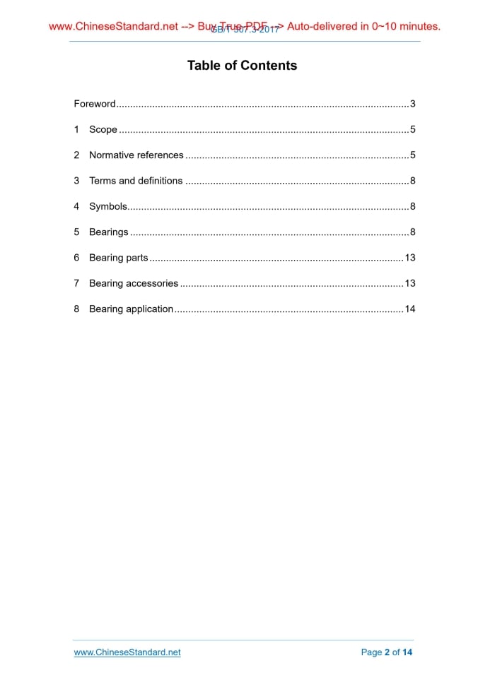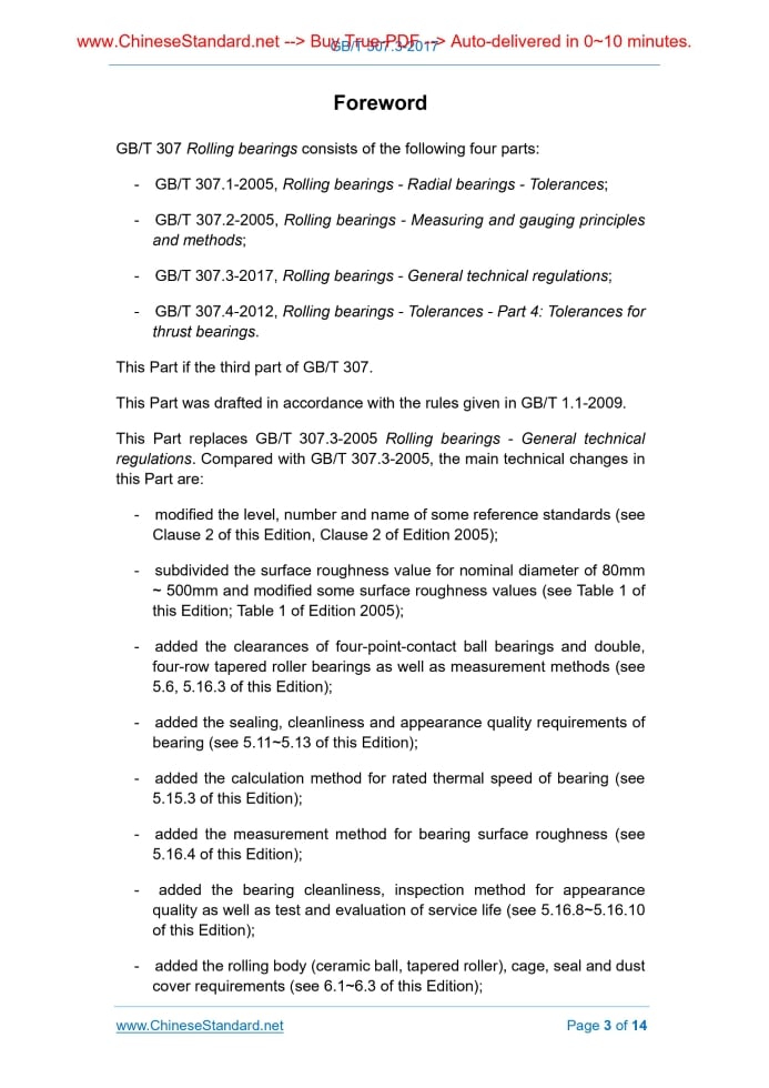 Similar standardsGB/T 307.3-2017: Rolling bearings - General technical regulations---This is an excerpt. Full copy of true-PDF in English version (including equations, symbols, images, flow-chart, tables, and figures etc.), auto-downloaded/delivered in 9 seconds, can be purchased online: https://www.ChineseStandard.net/PDF.aspx/GBT307.3-2017GB NATIONAL STANDARD OF THE PEOPLE’S REPUBLIC OF CHINA ICS 21.100.20 J 11 Replacing GB/T 307.3-2005 Rolling bearings - General technical regulations Issued on: MAY 12, 2017 Implemented on: DECEMBER 1, 2017 Issued by. General Administration of Quality Supervision, Inspection and Quarantine; Standardization Administration Committee. 3. No action is required - Full-copy of this standard will be automatically & immediately delivered to your EMAIL address in 0~60 minutes. Table of ContentsForeword ... 3 1 Scope ... 5 2 Normative references ... 5 3 Terms and definitions ... 8 4 Symbols... 8 5 Bearings ... 8 6 Bearing parts ... 13 7 Bearing accessories ... 13 8 Bearing application ... 14ForewordGB/T 307 Rolling bearings consists of the following four parts. - GB/T 307.1-2005, Rolling bearings - Radial bearings - Tolerances; - GB/T 307.2-2005, Rolling bearings - Measuring and gauging principles and methods; - GB/T 307.3-2017, Rolling bearings - General technical regulations; - GB/T 307.4-2012, Rolling bearings - Tolerances - Part 4. Tolerances for thrust bearings. This Part if the third part of GB/T 307. This Part was drafted in accordance with the rules given in GB/T 1.1-2009. This Part replaces GB/T 307.3-2005 Rolling bearings - General technical regulations. Compared with GB/T 307.3-2005, the main technical changes in this Part are. - modified the level, number and name of some reference standards (see Clause 2 of this Edition, Clause 2 of Edition 2005); - subdivided the surface roughness value for nominal diameter of 80mm ~ 500mm and modified some surface roughness values (see Table 1 of this Edition; Table 1 of Edition 2005); - added the clearances of four-point-contact ball bearings and double, four-row tapered roller bearings as well as measurement methods (see 5.6, 5.16.3 of this Edition); - added the sealing, cleanliness and appearance quality requirements of bearing (see 5.11~5.13 of this Edition); - added the calculation method for rated thermal speed of bearing (see 5.15.3 of this Edition); - added the measurement method for bearing surface roughness (see 5.16.4 of this Edition); - added the bearing cleanliness, inspection method for appearance quality as well as test and evaluation of service life (see 5.16.8~5.16.10 of this Edition); - added the rolling body (ceramic ball, tapered roller), cage, seal and dust cover requirements (see 6.1~6.3 of this Edition); Rolling bearings - General technical regulations1 ScopeThis Part of GB/T 307 specifies the general technical regulations for rolling bearings. This Part is applicable to rolling bearings of general purpose. For special-purpose bearings, additional technical conditions may be formulated.2 Normative referencesThe following referenced documents are indispensable for the application of this document. For dated references, only the edition cited applies. For undated references, the latest edition of the referenced document (including any amendments) applies. GB/T 271, Rolling bearings - Classification GB/T 272, Rolling bearing - Identification code GB/T 273.1, Rolling bearings - Tapered roller bearing - Plan of boundary dimensions GB/T 273.2, Rolling bearings - Thrust bearings - Boundary dimensions, general plan GB/T 273.3, Rolling bearings - Boundary dimensions, general plan - Part 3. Radial bearings GB/T 274, Rolling bearings - Chamfer dimension - Maximum values GB/T 275, Rolling bearings - Fits GB/T 305, Rolling bearings - Snap ring groove and snap ring on outer ring - Dimensions and tolerances GB/T 307.1, Rolling bearings - Radial bearings - Tolerances GB/T 307.2, Rolling bearings - Measuring and gauging principles and methods GB/T 307.4, Rolling bearings - Tolerances - Part 4. Tolerances for thrust bearings GB/T 308.1, Rolling bearings - Balls - Part 1. Steel balls GB/T 308.2, Rolling bearings - Balls - Part 2. Ceramic balls GB/T 309, Rolling bearings - Needle rollers GB/T 4604.1, Rolling bearings - Internal clearance - Part 1. Radial internal clearance for radial bearings GB/T 4604.2, Rolling bearings - Internal clearance - Part 2. Axial internal clearance for four-point-contact ball bearings GB/T 4661, Rolling bearings - Cylindrical rollers GB/T 4662, Rolling bearings - Static load ratings GB/T 5868, Rolling bearings - Mounting dimensions GB/T 6391, Rolling bearings - Dynamic load ratings and rating life GB/T 6930, Rolling bearings - Vocabulary GB/T 7811, Rolling bearings - Symbols for physical quantities GB/T 7813, Rolling bearings - Split type plummer block housings - Boundary dimensions GB/T 8597, Rolling bearings - Rust proof packaging GB/T 9160.1, Rolling bearings - Accessories - Part 1. Adapter sleeve assemblies and withdrawal sleeves GB/T 9160.2, Rolling bearings - Accessories - Part 2. Locknuts and locking devices GB/T 18254, High-carbon chromium bearing steel GB/T 24605, Rolling bearings - Marking for products GB/T 24607, Rolling bearings - Test and assessment for life and reliability GB/T 24608, Inspection rules for rolling bearings and commercial parts GB/T 24609, Rolling bearings - Thermal speed rating - Calculation and coefficients GB/T 24610.2, Rolling bearings - Measuring methods for vibration - Part 2. Radial ball bearings with cylindrical bore and outside surface GB/T 24610.3, Rolling bearings - Measuring methods for vibration - Part 3. Radial spherical and tapered roller bearings with cylindrical bore and outside surface GB/T 24610.4, Bearings - Measuring methods for vibration - Part 4. Radial cylindrical roller bearings with cylindrical bore and outside surface GB/T 24611, Rolling bearings - Damage and failures - Terms, characteristics and causes GB/T 25767, Rolling be