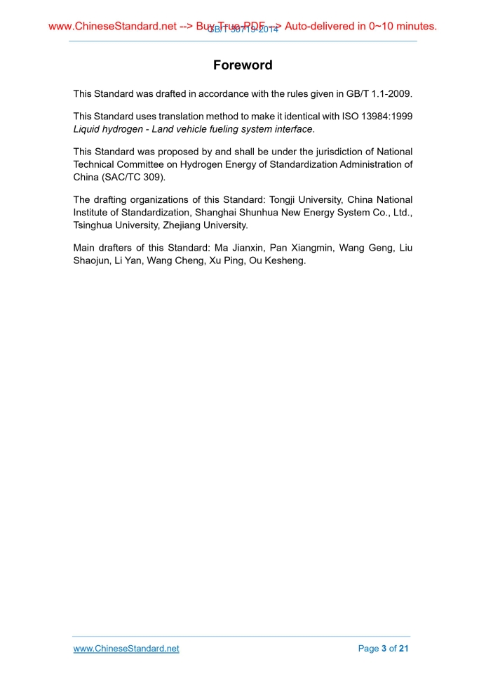 Similar standardsGB/T 30719-2014: Liquid hydrogen land vehicle fueling system interface---This is an excerpt. Full copy of true-PDF in English version (including equations, symbols, images, flow-chart, tables, and figures etc.), auto-downloaded/delivered in 9 seconds, can be purchased online: https://www.ChineseStandard.net/PDF.aspx/GBT30719-2014GB NATIONAL STANDARD OF THE PEOPLE’S REPUBLIC OF CHINA ICS 27.010 F 19 GB/T 30719-2014 / ISO 13984.1999 Liquid hydrogen land vehicle fueling system interface (ISO 13984.1999, Liquid hydrogen – Land vehicle fueling system interface, IDT) Issued on: JUNE 9, 2014 Implemented on: OCTOBER 1, 2014 Issued by. General Administration of Quality Supervision, Inspection and Quarantine; Standardization Administration Committee. Table of ContentsForeword ... 3 1 Scope ... 4 2 Normative references ... 4 3 Terms and definitions ... 5 4 Requirements ... 6 5 Testing and inspection methods ... 16 6 Qualification of personnel ... 19 7 Security and safety ... 20 8 Maintenance ... 21ForewordThis Standard was drafted in accordance with the rules given in GB/T 1.1-2009. This Standard uses translation method to make it identical with ISO 13984.1999 Liquid hydrogen - Land vehicle fueling system interface. This Standard was proposed by and shall be under the jurisdiction of National Technical Committee on Hydrogen Energy of Standardization Administration of China (SAC/TC 309). The drafting organizations of this Standard. Tongji University, China National Institute of Standardization, Shanghai Shunhua New Energy System Co., Ltd., Tsinghua University, Zhejiang University. Main drafters of this Standard. Ma Jianxin, Pan Xiangmin, Wang Geng, Liu Shaojun, Li Yan, Wang Cheng, Xu Ping, Ou Kesheng. Liquid hydrogen land vehicle fueling system interface1 ScopeThis Standard specifies the characteristics of liquid hydrogen refueling and dispensing systems on land vehicles of all types. This Standard is applicable to the design and installation of liquid hydrogen (LH2) fueling and dispensing systems.2 Normative referencesThe following referenced documents are indispensable for the application of this document. For dated references, only the edition cited applies. For undated references, the latest edition of the referenced document (including any amendments) applies. ISO 1106-3 Recommended practice for radiographic examination of fusion welded joints - Part 3. Fusion welded circumferential joints in steel pipes of up to 50 mm wall thickness. ISO 1182 Reaction to fire tests for building products - Non-combustibility test. ISO 9303 Seamless and welded (except submerged arc-welded) steel tubes for pressure purposes - Full peripheral ultrasonic testing for the detection of longitudinal imperfections. ISO 10286 Gas cylinders - Terminology. ISO 11484 Steel tubes for pressure purposes - Qualification and certification of non-destructive testing (NDT) personnel. ISO 12095 Seamless and welded steel tubes for pressure purposes - Liquid penetrant testing. ISO 13663 Welded steel tubes for pressure purposes - Ultrasonic testing of the area adjacent to the weld seam for the detection of laminar imperfections. ISO 13664 Seamless and welded steel tubes for pressure purposes - Magnetic particle inspection of the tube ends for the detection of laminar imperfections. ......Source: Above contents are excerpted from the full-copy PDF -- translated/reviewed by: www.ChineseStandard.net / Wayne Zheng et al. Tips & Frequently Asked Questions:Question 1: How long will the true-PDF of English version of GB/T 30719-2014 be delivered?Answer: The full copy PDF of English version of GB/T 30719-2014 can be downloaded in 9 seconds, and it will also be emailed to you in 9 seconds (double mechanisms to ensure the delivery reliably), with PDF-invoice.Question 2: Can I share the purchased PDF of GB/T 30719-2014_English with my colleagues?Answer: Yes. The purchased PDF of GB/T 30719-2014_English will be deemed to be sold to your employer/organization who actually paid for it, including your colleagues and your employer's intranet.Question 3: Does the price include tax/VAT?Answer: Yes. Our tax invoice, downloaded/delivered in 9 seconds, includes all tax/VAT and complies with 100+ countries' tax regulations (tax exempted in 100+ countries) -- See Avoidance of Double Taxation Agreements (DTAs): List of DTAs signed between Singapore and 100+ countriesQuestion 4: Do you accept my currency other than USD?Answer: Yes. www.ChineseStandard.us -- GB/T 30719-2014 -- Click this link and select your country/currency to pay, the exact amount in your currency will be printed on the invoice. Full PDF will also be downloaded/emailed in 9 seconds.How to buy and download a true PDF of English version of GB/T 30719-2014?A step-by-step guide to download PDF of GB/T 30719-2014_EnglishStep 1: Visit website https://www.ChineseStandard.net (Pay in USD), or https://www.ChineseStandard.us (Pay in any currencies such as Euro, KRW, JPY, AUD).Step 2: Search keyword "GB/T 30719-2014". Step 3: Click "Add to Cart". If multiple PDFs are required, repeat steps 2 and 3 to add up to 12 PDFs to cart. Step 4: Select payment option (Via payment agents Stripe or PayPal). Step 5: Customize Tax Invoice -- Fill up your email etc. Step 6: Click "Checkout". Step 7: Make payment by credit card, PayPal, Google Pay etc. After the payment is completed and in 9 seconds, you will receive 2 emails attached with the purchased PDFs and PDF-invoice, respectively. Step 8: Optional -- Go to download PDF. Step 9: Optional -- Click Open/Download PDF to download PDFs and invoice. See screenshots for above steps: Steps 1~3 Steps 4~6 Step 7 Step 8 Step 9 |