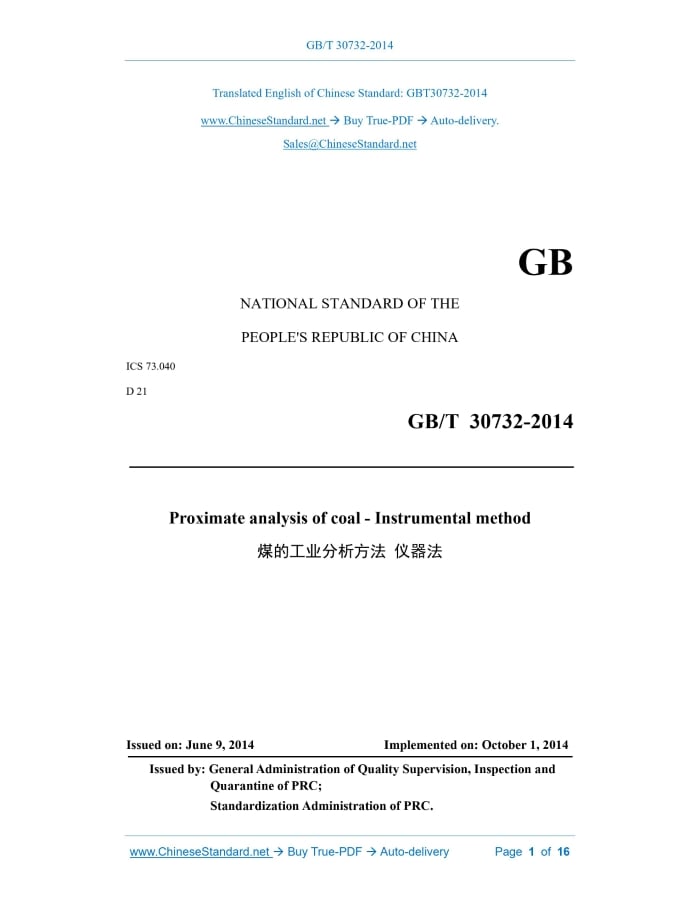 GB/T 30732-2014: Proximate analysis of coal - Instrumental method Delivery: 9 seconds. True-PDF full-copy in English & invoice will be downloaded + auto-delivered via email. See step-by-step procedure Status: Valid