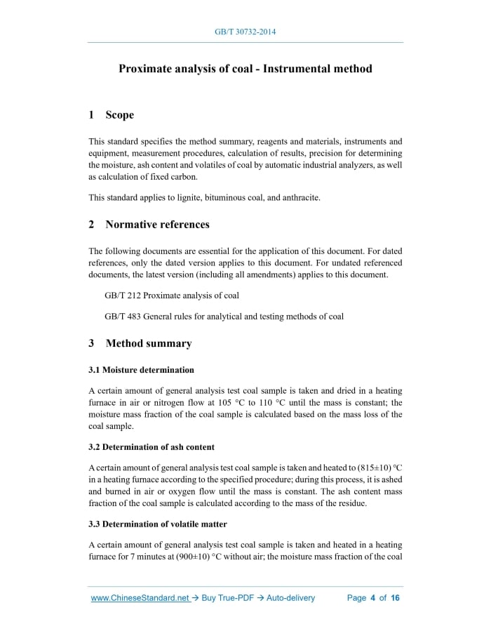 Similar standardsGB/T 30732-2014: Proximate analysis of coal - Instrumental method---This is an excerpt. Full copy of true-PDF in English version (including equations, symbols, images, flow-chart, tables, and figures etc.), auto-downloaded/delivered in 9 seconds, can be purchased online: https://www.ChineseStandard.net/PDF.aspx/GBT30732-2014GB NATIONAL STANDARD OF THE PEOPLE'S REPUBLIC OF CHINA ICS 73.040 D 21 Proximate analysis of coal - Instrumental method ISSUED ON: JUNE 9, 2014 IMPLEMENTED ON: OCTOBER 1, 2014 Issued by: General Administration of Quality Supervision, Inspection and Quarantine of PRC; Standardization Administration of PRC. Table of ContentsForeword ... 3 1 Scope ... 4 2 Normative references ... 4 3 Method summary ... 4 4 Reagents and materials ... 5 5 Instruments and Equipment ... 5 6 Measurement procedures ... 7 7 Result calculation ... 8 8 Method precision ... 10 9 Test report ... 11 Appendix A (Informative) Structural schematic diagram of several automatic industrial analyzers ... 12 Appendix B (Informative) Correction for buoyancy effects ... 16 Proximate analysis of coal - Instrumental method1 ScopeThis standard specifies the method summary, reagents and materials, instruments and equipment, measurement procedures, calculation of results, precision for determining the moisture, ash content and volatiles of coal by automatic industrial analyzers, as well as calculation of fixed carbon. This standard applies to lignite, bituminous coal, and anthracite.2 Normative referencesThe following documents are essential for the application of this document. For dated references, only the dated version applies to this document. For undated referenced documents, the latest version (including all amendments) applies to this document. GB/T 212 Proximate analysis of coal GB/T 483 General rules for analytical and testing methods of coal3 Method summary3.1 Moisture determination A certain amount of general analysis test coal sample is taken and dried in a heating furnace in air or nitrogen flow at 105 °C to 110 °C until the mass is constant; the moisture mass fraction of the coal sample is calculated based on the mass loss of the coal sample. 3.2 Determination of ash content A certain amount of general analysis test coal sample is taken and heated to (815±10) ℃ in a heating furnace according to the specified procedure; during this process, it is ashed and burned in air or oxygen flow until the mass is constant. The ash content mass fraction of the coal sample is calculated according to the mass of the residue. 3.3 Determination of volatile matter A certain amount of general analysis test coal sample is taken and heated in a heating furnace for 7 minutes at (900±10) °C without air; the moisture mass fraction of the coal sample is subtracted from the mass fraction of the decrease mass in the mass of the coal sample, the remaining is taken as the volatile mass fraction of the coal sample.4 Reagents and materials4.1 Nitrogen: with a purity of 99.9%. 4.2 Oxygen: 99.9%, no hydrogen. 4.3 Anhydrous calcium chloride: chemically pure, granular. 4.4 Color-changing silica gel: industrial supplies. 4.5 Crucible: It is used for measuring moisture and ash content, made of porcelain or quartz, with sufficient bottom area to ensure that the mass of the coal sample per square centimeter does not exceed 0.15 g after the coal sample is spread out. 4.6 Volatile matter crucible: It is made of porcelain or quartz, and equipped with a tight cover, the shape and size comply with the requirements of GB/T 212. 4.7 Certified coal reference materials: national first-class coal physical property and chemical composition analysis reference materials.5 Instruments and Equipment5.1 Automatic industrial analyzer 5.1.1 General The automatic industrial analyzer shall include a high-temperature furnace, a built-in balance, a sample receiving and conveying device, a temperature measurement and control and display system, a furnace atmosphere control system, a result display and printing device, etc. Appendix A gives the structural schematic diagrams of several automatic industrial analyzers. The automatic industrial analyzer shall record and provide detailed information such as empty crucible mass, coal sample mass, hot crucible mass, and buoyancy effect correction value in each test by printing or other means. 5.1.2 High-temperature furnace 5.1.2.1 Moisture determination furnace: It can control the temperature between 105 °C and 110 °C, has a sufficient constant temperature zone, a small free space in the furnace, and ventilation and exhaust ports. The constant temperature zone is measured at least once a year.6 Measurement procedures6.1 General 6.1.1 Moisture and ash content can be measured continuously with the same sample in the same heating furnace, or two samples can be measured separately; volatile matter shall be weighed and measured separately. 6.1.2 Each measurement shall use one or more empty crucibles at the same time to correct the buoyancy effect of the thermal mass of the crucible. NOTE: See Appendix B for buoyancy effect correction calculation. 6.1.3 All weighings during the test shall be accurate to 0.0002 g. 6.1.4 The instrument shall be operated according to the instrument instruction manual. 6.1.5 The instrument shall be inspected from time to time by using certified coal reference materials based on actual usage conditions. 6.2 Moisture determination 6.2.1 In the measuring instrument, accurately weigh the crucible that has been pre-dried to a constant mass, add (1±0.1) g general analysis test coal sample to the crucible, flatten it, and weigh it accurately. 6.2.2 According to the provisions of 5.1.4, air or nitrogen must be introduced into the heating furnace in advance (nitrogen must be introduced for lignite samples). The furnace temperature slowly rises to 105 ℃~110 ℃ and remains constant. The instrument automatically weighs according to the set time interval until the mass is const