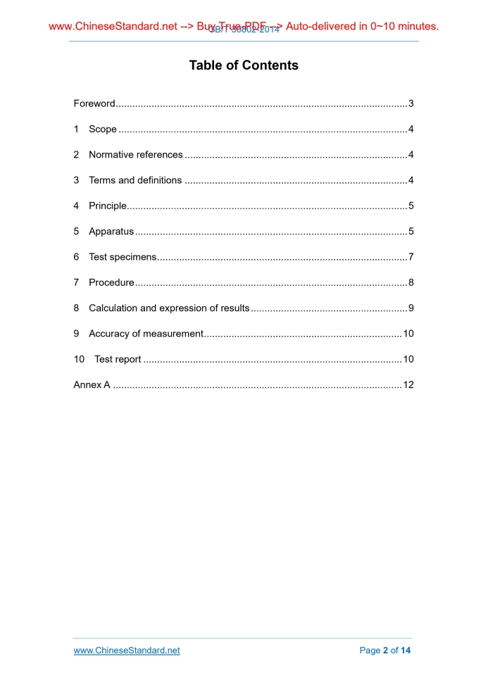 Similar standardsGB/T 30802-2014: Thermal insulating products for building applications -- Determination of behaviour under point load---This is an excerpt. Full copy of true-PDF in English version (including equations, symbols, images, flow-chart, tables, and figures etc.), auto-downloaded/delivered in 9 seconds, can be purchased online: https://www.ChineseStandard.net/PDF.aspx/GBT30802-2014 GB NATIONAL STANDARD OF THE PEOPLE’S REPUBLIC OF CHINA ICS 91.120.10 Q 25 GB/T 30802-2014 / ISO 29769.2008 Thermal insulating products for building applications - Determination of behaviour under point load (ISO 29769.2008, IDT) Issued on: JUNE 24, 2014 Implemented on: FEBRUARY 1, 2015 Issued by. General Administration of Quality Supervision, Inspection and Quarantine; Standardization Administration Committee. Table of ContentsForeword ... 3 1 Scope ... 4 2 Normative references ... 4 3 Terms and definitions ... 4 4 Principle... 5 5 Apparatus ... 5 6 Test specimens ... 7 7 Procedure ... 8 8 Calculation and expression of results ... 9 9 Accuracy of measurement ... 10 10 Test report ... 10 Annex A ... 12ForewordThis Standard was drafted in accordance with the rules given in GB/T 1.1-2009. This Standard uses translation method to make it identical with ISO 29769.2008 Thermal insulating products for building applications - Determination of behaviour under point load. This Standard shall be under the jurisdiction of National Technical Committee on Insulation Material of Standardization Administration of China (SAC/TC 191). The drafting organizations of this Standard. Nanjing Glass Fiber Research & Design Institute Co., Ltd., National Glass Fiber Products Quality Supervision and Inspection Center. Main drafters of this Standard. Hao Zhengtao, Fang Yunwei, Ma Dan, Cui Jun, Xu Qi, Chen Jianming, Huang Ying, Xu Min, Li Junguang. Thermal insulating products for building applications - Determination of behaviour under point load1 ScopeThis Standard specifies equipment and procedures for determining the behaviour of products under a force applied to a small area of a test specimen at a given speed. This Standard is applicable to thermal insulating products. This Standard can be used to determine whether the products have sufficient strength to withstand the forces applied directly to them either during installation or during application, mainly caused by pedestrian traffic. NOTE The test methods given in the main body of this Standard and in Annex A are reported and interpreted in different ways. The similarities that exist between the methods are not sufficient to permit reasonable comparisons to be made.2 Normative referencesThe following referenced documents are indispensable for the application of this document. For dated references, only the edition cited applies. For undated references, the latest edition of the referenced document (including any amendments) applies. ISO 5725-2 Accuracy (trueness and precision) of measurement methods and results - Part 2. Basic method for the determination of repeatability and reproducibility of a standard measurement method ISO 2976 Thermal insulating products for building applications - Determination of linear dimensions of test specimens3 Terms and definitionsFor the purposes of this document, the following terms and definitions apply. 3.1 point load compressive force applied to a test specimen by a circular indenter with a circular cross section of 50 cm2, equivalent to a diameter of 79.8 mm 3.2 critical point The deformation, Pd, of the test specimen at the thickness, d, measured in accordance with 7.2, is the largest of the two average values determined for the two faces, expressed in mm. The test result is the average value obtained from three test specimens. ......Source: Above contents are excerpted from the full-copy PDF -- translated/reviewed by: www.ChineseStandard.net / Wayne Zheng et al. Tips & Frequently Asked Questions:Question 1: How long will the true-PDF of English version of GB/T 30802-2014 be delivered?Answer: The full copy PDF of English version of GB/T 30802-2014 can be downloaded in 9 seconds, and it will also be emailed to you in 9 seconds (double mechanisms to ensure the delivery reliably), with PDF-invoice.Question 2: Can I share the purchased PDF of GB/T 30802-2014_English with my colleagues?Answer: Yes. The purchased PDF of GB/T 30802-2014_English will be deemed to be sold to your employer/organization who actually paid for it, including your colleagues and your employer's intranet.Question 3: Does the price include tax/VAT?Answer: Yes. Our tax invoice, downloaded/delivered in 9 seconds, includes all tax/VAT and complies with 100+ countries' tax regulations (tax exempted in 100+ countries) -- See Avoidance of Double Taxation Agreements (DTAs): List of DTAs signed between Singapore and 100+ countriesQuestion 4: Do you accept my currency other than USD?Answer: Yes. www.ChineseStandard.us -- GB/T 30802-2014 -- Click this link and select your country/currency to pay, the exact amount in your currency will be printed on the invoice. Full PDF will also be downloaded/emailed in 9 seconds.How to buy and download a true PDF of English version of GB/T 30802-2014?A step-by-step guide to download PDF of GB/T 30802-2014_EnglishStep 1: Visit website https://www.ChineseStandard.net (Pay in USD), or https://www.ChineseStandard.us (Pay in any currencies such as Euro, KRW, JPY, AUD).Step 2: Search keyword "GB/T 30802-2014". Step 3: Click "Add to Cart". If multiple PDFs are required, repeat steps 2 and 3 to add up to 12 PDFs to cart. Step 4: Select payment option (Via payment agents Stripe or PayPal). Step 5: Customize Tax Invoice -- Fill up your email etc. Step 6: Click "Checkout". Step 7: Make payment by credit card, PayPal, Google Pay etc. After the payment is completed and in 9 seconds, you will receive 2 emails attached with the purchased PDFs and PDF-invoice, respectively. Step 8: Optional -- Go to download PDF. Step 9: Optional -- Click Open/Download PDF