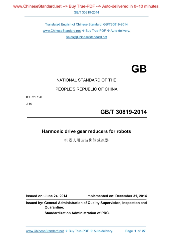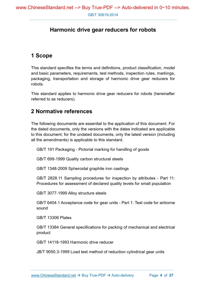 Similar standardsGB/T 30819-2014: Harmonic drive gear reducers for robots---This is an excerpt. Full copy of true-PDF in English version (including equations, symbols, images, flow-chart, tables, and figures etc.), auto-downloaded/delivered in 9 seconds, can be purchased online: https://www.ChineseStandard.net/PDF.aspx/GBT30819-2014GB NATIONAL STANDARD OF THE PEOPLE’S REPUBLIC OF CHINA ICS 21.120 J 19 Harmonic drive gear reducers for robots Issued on: JUNE 24, 2014 Implemented on: DECEMBER 31, 2014 Issued by. General Administration of Quality Supervision, Inspection and Quarantine; Standardization Administration of PRC. Table of ContentsForeword... 3 1 Scope... 4 2 Normative references... 4 3 Terms and definitions... 5 4 Product classification, model and basic parameters... 7 5 Requirements... 19 6 Test method... 23 7 Inspection rules... 25 8 Marking, packaging, transportation and storage... 26 Harmonic drive gear reducers for robots1 ScopeThis standard specifies the terms and definitions, product classification, model and basic parameters, requirements, test methods, inspection rules, markings, packaging, transportation and storage of harmonic drive gear reducers for robots. This standard applies to harmonic drive gear reducers for robots (hereinafter referred to as reducers).2 Normative referencesThe following documents are essential to the application of this document. For the dated documents, only the versions with the dates indicated are applicable to this document; for the undated documents, only the latest version (including all the amendments) is applicable to this standard. GB/T 191 Packaging - Pictorial marking for handling of goods GB/T 699-1999 Quality carbon structural steels GB/T 1348-2009 Spheroidal graphite iron castings GB/T 2828.11 Sampling procedures for inspection by attributes - Part 11. Procedures for assessment of declared quality levels for small population GB/T 3077-1999 Alloy structure steels GB/T 6404.1 Acceptance code for gear units - Part 1.Test code for airborne sound GB/T 13306 Plates GB/T 13384 General specifications for packing of mechanical and electrical product GB/T 14118-1993 Harmonic drive reducer JB/T 9050.3-1999 Load test method of reduction cylindrical gear units Under the action of torsional moment, the ability of the component to resist torsional deformation, or the ratio of the rated load torque to the tangential elastic deformation angle. 3.7 Starting torque The torque to be applied when starting at no load. 3.8 Transmission accuracy In the working state, when the input shaft rotates in one direction, the degree of closeness of the actual rotation angle of the output shaft to the relative theoretical rotation angle. Note. The level of transmission accuracy is measured by the size of the transmission error. The smaller the transmission error, the larger the accuracy; the larger the transmission error, the smaller the accuracy. 3.9 Lost motion In the working state, when the input shaft changes from forward to reverse rotation, the lag of the output shaft on the angle of rotation. 3.10 Backlash When the output end and the reducer housing are both fixed, a ±2% rated torque is applied to the input end to rotate clockwise and counterclockwise, a slight angular displacement as generated at the input end of the reducer. 3.11 Transmission error In the working state, when the input shaft rotates in one direction, the difference between the actual rotation angle and the theoretical rotation angle of the output shaft. 3.12 Length of flexspline the load is evenly increased to 4 times the rated load within 30 s and then run for 2 minutes. 6.4 Maximum allowable temperature of housing Use a verified/calibrated thermocouple or other temperature sensor and other primary instruments and their matching secondary instruments for testing. Fix the primary instrument close to the surface of the prototype. After starting up and running, collect and record the temperature value at the time interval required by the test. 6.5 Transmission efficiency The test of transmission efficiency is carried out according to JB/T 9050.3-1999. 6.6 Starting torque The starting torque test shall be carried out after the no-load test. The load measuring device with constant torque loading function is connected to the output end of the reducer. The torque is applied slowly and evenly until the input shaft of the reducer has an angular displacement. Collect and record the instantaneous torque value. Carry out 5 tests with different phase intervals in the forward and reverse directions. Take the maximum value of 10 tests as the starting torque. 6.7 Torsional stiffness The torsional stiffness test is carried out according to 6.2.5 of GB/T 14118-1993. 6.8 Lost motion and backlash 6.8.1 Lost motion The lost motion test is carried out according to the dynamic measurement method in 6.2.6.1 of GB/T 14118-1993. 6.8.2 Backlash The backlash test shall be performed after the lost motion test. The measurement adopts optical indexing head, collimating light tube, optical polygonal prism, etc. When measuring, the optical indexing head is installed on the input shaft of the reducer. The polyhedral prism is fixed on the output shaft. One surface of the collimating light tube is adjusted to be perpendicular to the polyhedral prism. Fix the output end. Rotate the input end clockwise and counterclockwise, to make the input end produce a torque of ±4% of the rated torque. Measure the angular displacement value of the reducer input end, which is the backlash. The measurement sampling points are not less than 72 points. c) The maximum allowable temperature of housing; d) Noise. 7.2 Type inspection 7.2.1 Inspection scope Type inspection shall be carried out in any of the following situations. a) In case of type finalization of new product's trial production and the trial production of old product after trans-plant; b) When the product has major changes in design, technology, materials, etc., which are suffic