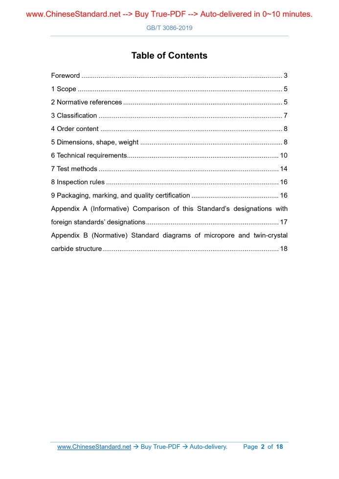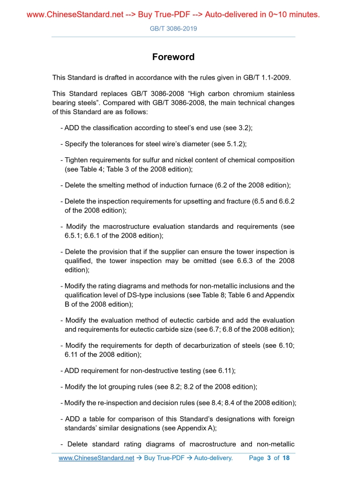 GB/T 3086-2019: High carbon chromium stainless bearing steels---This is an excerpt. Full copy of true-PDF in English version (including equations, symbols, images, flow-chart, tables, and figures etc.), auto-downloaded/delivered in 9 seconds, can be purchased online: https://www.ChineseStandard.net/PDF.aspx/GBT3086-2019NATIONAL STANDARD OF THE PEOPLE’S REPUBLIC OF CHINA ICS 77.140.20 H 40 Replacing GB/T 3086-2008 High carbon chromium stainless bearing steels Issued on. JUNE 04, 2019 Implemented on. MAY 01, 2020 Issued by. State Administration for Market Regulation; Standardization Administration of the PRC. Table of ContentsForeword... 3 1 Scope... 5 2 Normative references... 5 3 Classification... 7 4 Order content... 8 5 Dimensions, shape, weight... 8 6 Technical requirements... 10 7 Test methods... 14 8 Inspection rules... 16 9 Packaging, marking, and quality certification... 16 Appendix A (Informative) Comparison of this Standard’s designations with foreign standards’ designations... 17 Appendix B (Normative) Standard diagrams of micropore and twin-crystal carbide structure... 18ForewordThis Standard is drafted in accordance with the rules given in GB/T 1.1-2009. This Standard replaces GB/T 3086-2008 “High carbon chromium stainless bearing steels”. Compared with GB/T 3086-2008, the main technical changes of this Standard are as follows. - ADD the classification according to steel’s end use (see 3.2); - Specify the tolerances for steel wire’s diameter (see 5.1.2); - Tighten requirements for sulfur and nickel content of chemical composition (see Table 4; Table 3 of the 2008 edition); - Delete the smelting method of induction furnace (6.2 of the 2008 edition); - Delete the inspection requirements for upsetting and fracture (6.5 and 6.6.2 of the 2008 edition); - Modify the macrostructure evaluation standards and requirements (see 6.5.1; 6.6.1 of the 2008 edition); - Delete the provision that if the supplier can ensure the tower inspection is qualified, the tower inspection may be omitted (see 6.6.3 of the 2008 edition); - Modify the rating diagrams and methods for non-metallic inclusions and the qualification level of DS-type inclusions (see Table 8; Table 6 and Appendix B of the 2008 edition); - Modify the evaluation method of eutectic carbide and add the evaluation and requirements for eutectic carbide size (see 6.7; 6.8 of the 2008 edition); - Modify the requirements for depth of decarburization of steels (see 6.10; 6.11 of the 2008 edition); - ADD requirement for non-destructive testing (see 6.11); - Modify the lot grouping rules (see 8.2; 8.2 of the 2008 edition); - Modify the re-inspection and decision rules (see 8.4; 8.4 of the 2008 edition); - ADD a table for comparison of this Standard’s designations with foreign standards’ similar designations (see Appendix A); - Delete standard rating diagrams of macrostructure and non-metallic inclusions (see A.1~A.6 of the 2008 edition). This Standard was proposed by China Iron and Steel Association. This Standard shall be under the jurisdiction of National Technical Committee 183 on Steel of Standardization Administration of China (SAC/TC 183). Drafting organizations of this Standard. Dongbei Special Steel Group Co., Ltd., China Metallurgical Information and Standardization Institute, Pangang Group Jiangyou Changcheng Special Steel Co., Ltd., Jiangsu Shenyuan Group Co., Ltd., Heye Special Steel Co., Ltd. Main drafters of this Standard. Kang Ge, Gong Chunlin, Luan Yan, Li Peng, Hu Jin, Tu Yuguo, Zhang Beibei, Zhang Guofu, Wang Xinhe. The previous editions of the standard replaced by this Standard were released as follows. - GB/T 3086-1982, GB/T 3086-2008. High carbon chromium stainless bearing steels1 ScopeThis Standard specifies the order content, dimensions, shape, weight, technical requirements, test methods, inspection rules, packaging, marking, and quality certification of high carbon chromium stainless bearing steels. This Standard applies to hot-rolled (forged), cold-drawn, peeled, and polished round steels with a nominal diameter of 5 mm~160 mm, round wire rods with a nominal diameter of 5 mm~40 mm, and round steel wires with a nominal diameter of 1 mm~16 mm (hereinafter referred to as “steels”).2 Normative referencesThe following documents are indispensable for the application of this document. For the dated references, only the editions with the dates indicated are applicable to this document. For the undated references, the latest edition (including all the amendments) are applicable to this document. GB/T 222 Permissible Tolerances for Chemical Composition of Steel Products GB/T 223.5 Steel and iron - Determination of acid-soluble silicon and total silicon content - Reduced molybdosilicate spectrophotometric method GB/T 223.11 Iron, steel and alloy - Determination of chromium content - Visual titration or potentiometric titration method GB/T 223.18 Methods for Chemical Analysis of Iron, Steel and Alloy - The Sodium Thiosulfate Separation Iodimetric Method for the Determination of Copper Content GB/T 223.23 Iron, Steel and Alloy - Determination of Nickel Content - The Dimethylglyoxime Spectrophotometric Method GB/T 223.26 Iron, steel and alloy - Determination of molybdenum content - The thiocyanate spectrophotometric method3 Classification3.1 Steel, according to the processing method used, is divided into the following two categories. The processing method used for steel shall be indicated in the contract. If not indicated, it shall be supplied according to the steel for cut work. 3.2 Steel, according to the end use, is divided into the following two categories. The end use of steel shall be indicated in the contract. If not indicated, it shall be supplied according to the steel for ferrule.4 Order contentThe contract or order for ordering in accordance with this Standard shall include the following.5 Dimensions, shape, weight5.1 Dimensions, shape, and tolerances 5.1.1 The dimensions, shape, and tolerances of 