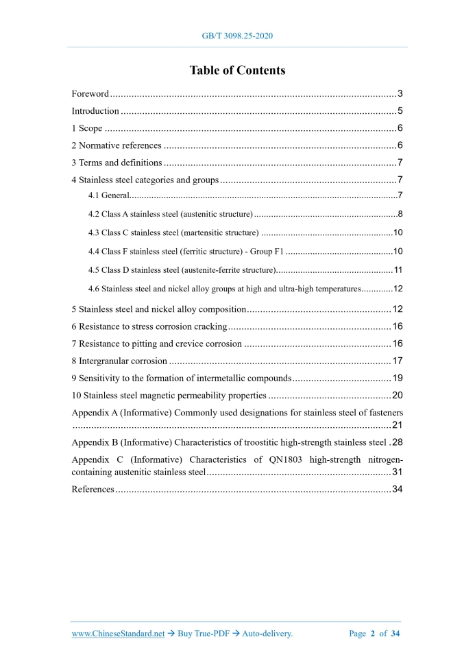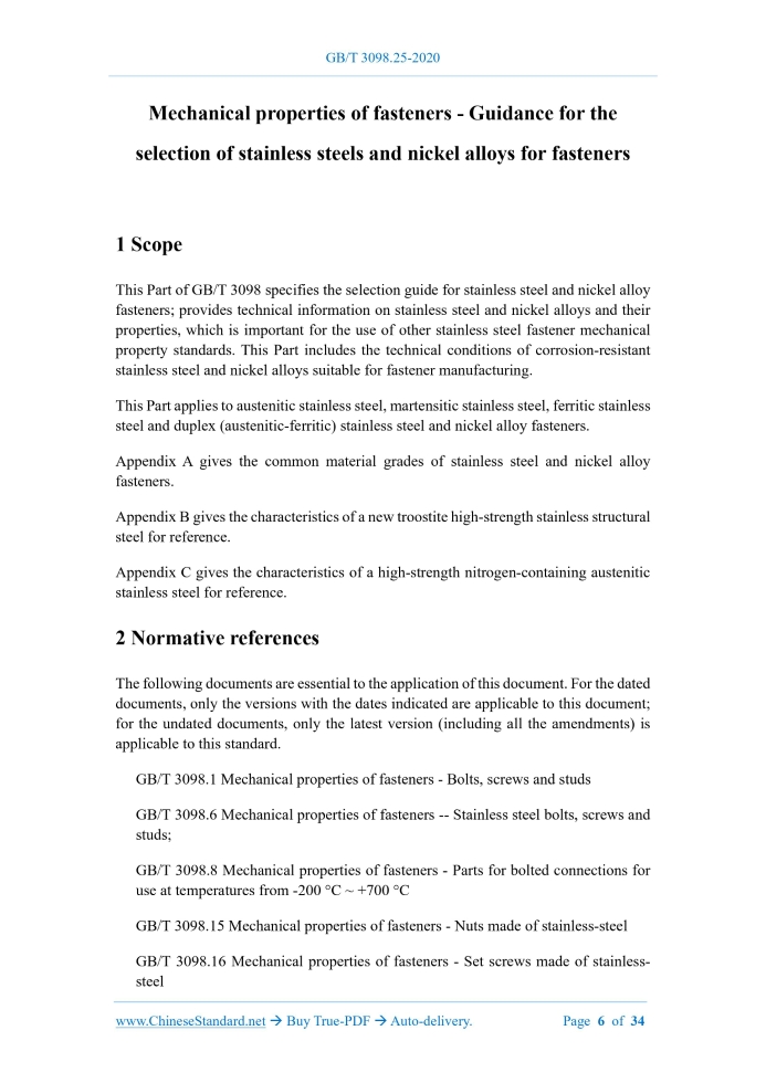 Similar standardsGB/T 3098.25-2020: Mechanical properties of fasteners - Guidance for the selection of stainless steels and nickel alloys for fasteners---This is an excerpt. Full copy of true-PDF in English version (including equations, symbols, images, flow-chart, tables, and figures etc.), auto-downloaded/delivered in 9 seconds, can be purchased online: https://www.ChineseStandard.net/PDF.aspx/GBT3098.25-2020 GB NATIONAL STANDARD OF THE PEOPLE’S REPUBLIC OF CHINA ICS 21.060.01 J 13 Mechanical properties of fasteners - Guidance for the selection of stainless steels and nickel alloys for fasteners ISSUED ON: NOVEMBER 19, 2020 IMPLEMENTED ON: JUNE 01, 2021 Issued by: State Administration for Market Regulation; National Standardization Administration. Table of ContentsForeword ... 3 Introduction ... 5 1 Scope ... 6 2 Normative references ... 6 3 Terms and definitions ... 7 4 Stainless steel categories and groups ... 7 4.1 General... 7 4.2 Class A stainless steel (austenitic structure) ... 8 4.3 Class C stainless steel (martensitic structure) ... 10 4.4 Class F stainless steel (ferritic structure) - Group F1 ... 10 4.5 Class D stainless steel (austenite-ferrite structure)... 11 4.6 Stainless steel and nickel alloy groups at high and ultra-high temperatures ... 12 5 Stainless steel and nickel alloy composition ... 12 6 Resistance to stress corrosion cracking ... 16 7 Resistance to pitting and crevice corrosion ... 16 8 Intergranular corrosion ... 17 9 Sensitivity to the formation of intermetallic compounds ... 19 10 Stainless steel magnetic permeability properties ... 20 Appendix A (Informative) Commonly used designations for stainless steel of fasteners ... 21 Appendix B (Informative) Characteristics of troostitic high-strength stainless steel . 28 Appendix C (Informative) Characteristics of QN1803 high-strength nitrogen- containing austenitic stainless steel ... 31 References ... 34 Mechanical properties of fasteners - Guidance for the selection of stainless steels and nickel alloys for fasteners1 ScopeThis Part of GB/T 3098 specifies the selection guide for stainless steel and nickel alloy fasteners; provides technical information on stainless steel and nickel alloys and their properties, which is important for the use of other stainless steel fastener mechanical property standards. This Part includes the technical conditions of corrosion-resistant stainless steel and nickel alloys suitable for fastener manufacturing. This Part applies to austenitic stainless steel, martensitic stainless steel, ferritic stainless steel and duplex (austenitic-ferritic) stainless steel and nickel alloy fasteners. Appendix A gives the common material grades of stainless steel and nickel alloy fasteners. Appendix B gives the characteristics of a new troostite high-strength stainless structural steel for reference. Appendix C gives the characteristics of a high-strength nitrogen-containing austenitic stainless steel for reference.2 Normative referencesThe following documents are essential to the application of this document. For the dated documents, only the versions with the dates indicated are applicable to this document; for the undated documents, only the latest version (including all the amendments) is applicable to this standard. GB/T 3098.1 Mechanical properties of fasteners - Bolts, screws and studs GB/T 3098.6 Mechanical properties of fasteners -- Stainless steel bolts, screws and studs; GB/T 3098.8 Mechanical properties of fasteners - Parts for bolted connections for use at temperatures from -200 °C ~ +700 °C GB/T 3098.15 Mechanical properties of fasteners - Nuts made of stainless-steel GB/T 3098.16 Mechanical properties of fasteners - Set screws made of stainless- steel GB/T 3098.21 Mechanical properties of fasteners - Part 21: Tapping screws of stainless-steel GB/T 3098.24 Mechanical properties of fasteners - Stainless steel and nickel alloys bolts, screws, studs and nuts for high temperature applications GB/T 4334-2020 Corrosion of metals and alloys - Test methods for intergranular corrosion of austenitic and ferritic-austenitic (duplex) stainless steels ASTM A923 Standard test methods for detecting detrimental intermetallic phase in duplex austenitic/ferritic stainless steels ASTM A1084 Standard test methods for detecting detrimental phases in lean duplex austenitic/ferritic stainless steels ASTM G48 Test methods for pitting and crevice corrosion resistance of stainless steels and related alloys by use ferric chloride solution3 Terms and definitionsThe terms and definitions defined in GB/T 3098.24 apply to this document.4 Stainless steel categories and groups4.1 General GB/T 3098 stainless steel mechanical properties series standard covers the following categories and groups: - Austenitic stainless steel A1 ~ A5 and A8; - Martensitic stainless steel C1, C3 and C4; - Ferritic stainless steel F1; - Duplex (austenitic-ferritic) stainless steel D2, D4, D6 and D8; - High temperature stainless steel and nickel alloys CH0, CH1, CH2, VH/VW, V, SD, SB, 718. Stainless steel covers a variety of materials, providing different corrosion resistance and functional properties. Special fasteners made of stainless steel shall be carefully selected considering the foreseeable working environment conditions of the bolted connection. A5. Austenitic steels are usually non-magnetic in the annealed state; however, some residual magnetism may be generated during cold heading, see Chapter 10. When low magnetic permeability is a critical factor, a stainless steel expert shall be consulted. 4.2.2 Group A1 Group A1 stainless steels are designed for machining. Due to the high sulfur content, the corrosion resistance is lower than that of the corresponding standard sulfur content stainless steels. This group of steels is not suitable for use in non-oxidizing acid media or environments with chloride components (such as swimming pools with chloride as a cleaning medium, or marine environments). 4.2.3 Group A2 Group A2 stainl