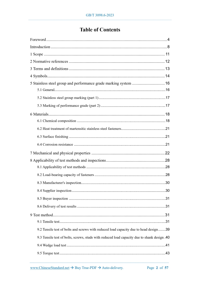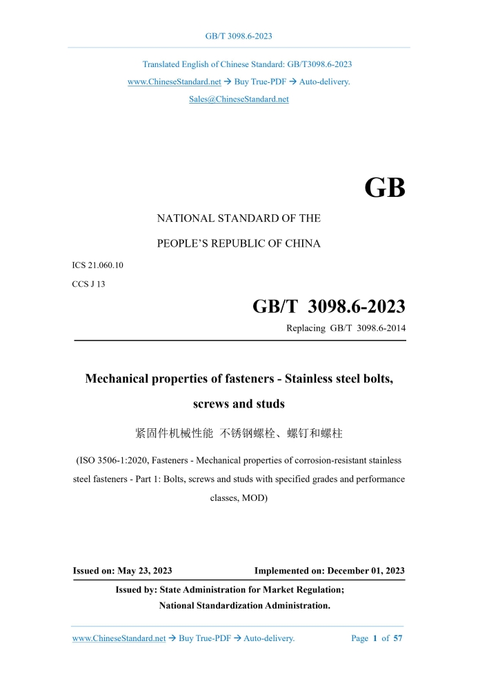 Similar standardsGB/T 3098.6-2023: Mechanical properties of fasteners - Stainless steel bolts, screws and studs---This is an excerpt. Full copy of true-PDF in English version (including equations, symbols, images, flow-chart, tables, and figures etc.), auto-downloaded/delivered in 9 seconds, can be purchased online: https://www.ChineseStandard.net/PDF.aspx/GBT3098.6-2023GB NATIONAL STANDARD OF THE PEOPLE’S REPUBLIC OF CHINA ICS 21.060.10 CCS J 13 Replacing GB/T 3098.6-2014 Mechanical properties of fasteners - Stainless steel bolts, screws and studs (ISO 3506-1.2020, Fasteners - Mechanical properties of corrosion-resistant stainless steel fasteners - Part 1.Bolts, screws and studs with specified grades and performance classes, MOD) Issued on. MAY 23, 2023 Implemented on. DECEMBER 01, 2023 Issued by. State Administration for Market Regulation; National Standardization Administration. Table of ContentsForeword... 4 Introduction... 8 1 Scope... 11 2 Normative references... 12 3 Terms and definitions... 13 4 Symbols... 14 5 Stainless steel group and performance grade marking system... 16 5.1 General... 16 5.2 Stainless steel group marking (part 1)... 17 5.3 Marking of performance grade (part 2)... 17 6 Materials... 18 6.1 Chemical composition... 18 6.2 Heat treatment of martensitic stainless steel fasteners... 21 6.3 Surface finishing... 21 6.4 Corrosion resistance... 21 7 Mechanical and physical properties... 22 8 Applicability of test methods and inspections... 28 8.1 Applicability of test methods... 28 8.2 Load-bearing capacity of fasteners... 28 8.3 Manufacturer's inspection... 30 8.4 Supplier inspection... 30 8.5 Buyer inspection... 31 8.6 Delivery of test results... 31 9 Test method... 31 9.1 Tensile test... 31 9.2 Tensile test of bolts and screws with reduced load capacity due to head design... 39 9.3 Tensile test of bolts, screws, studs with reduced load capacity due to shank design. 40 9.4 Wedge load test... 41 9.5 Torque test... 43 9.6 Hardness test... 45 10 Marking and labeling of fasteners... 46 10.1 Marking... 46 10.2 Manufacturer's identification mark... 48 10.3 Fastener marking... 48 10.4 Packaging marking (label)... 52 Appendix A (Informative) Mechanical properties at high temperatures and application at low temperatures... 54 References... 56ForewordThis document was drafted in accordance with the provisions of GB/T 1.1-2020 "Directives for standardization - Part 1.Rules for the structure and drafting of standardizing documents". This document is Part 6 of GB/T 3098 "Mechanical properties of fasteners". GB/T 3098 has published the following parts. - GB/T 3098.1 Mechanical properties of fasteners - Bolts, screws and studs; - GB/T 3098.2 Mechanical properties of fasteners - Nuts; - GB/T 3098.3 Mechanical properties of fasteners - Set screws; - GB/T 3098.5 Mechanical properties of fasteners - Tapping screws; - GB/T 3098.6 Mechanical properties of fasteners - Stainless steel bolts, screws and studs; - GB/T 3098.7 Mechanical properties of fasteners - Thread rolling screws; - GB/T 3098.8 Mechanical properties of fasteners - Parts for bolted connections for use at temperatures from-200 °C ~ +700 °C - GB/T 3098.9 Mechanical properties of fasteners - Prevailing torque type steel nuts; - GB/T 3098.10 Mechanical properties of fasteners - Bolts, screws, studs and nuts made of non-ferrous metals; - GB/T 3098.11 Mechanical properties of fasteners - Drilling screws with taping screw thread; - GB/T 3098.12 Mechanical properties of fasteners - Cone proof load test on nuts; - GB/T 3098.13 Mechanical properties of fasteners - Torsional test and minimum torques for bolts and screws with nominal diameters 1 mm to 10 mm; - GB/T 3098.14 Mechanical properties of fasteners - Widening test on nuts; - GB/T 3098.15 Mechanical properties of fasteners - Stainless steel nuts; - GB/T 3098.16 Mechanical properties of fasteners - Stainless steel set screws; - GB/T 3098.17 Mechanical properties of fasteners - Preloading test for the detection of hydrogen embrittlement-Parallel bearing surface method; - GB/T 3098.18 Mechanical properties of fasteners - Blind rivets testing; - GB/T 3098.19 Mechanical properties of fasteners - Blind rivets with break pull mandrel; - GB/T 3098.20 Mechanical properties of fasteners - Wing nuts with specified proof torque; - GB/T 3098.21 Mechanical properties of fasteners - Stainless steel tapping screws; - GB/T 3098.22 Mechanical properties of fasteners made of the fine grain non-heat treatment steel - Bolts, screws and studs; - GB/T 3098.23 Mechanical properties of fasteners - M42 ~ M72 bolts, screws and studs; - GB/T 3098.24 Mechanical properties of fasteners - Stainless steel and nickel alloys bolts, screws, studs and nuts for high temperature applications; - GB/T 3098.25 Mechanical properties of fasteners - Guidance for the selection of stainless steels and nickel alloys for fasteners; - GB/T 3098.26 Mechanical properties of fasteners - Flat washers. This document replaces GB/T 3098.6-2014 "Mechanical properties of fasteners - Stainless steel bolts, screws and studs". Compared with GB/T 3098.6-2014, in addition to structural adjustments and editorial changes, the main technical changes are as follows. a) ADD duplex (austenite-ferrite) stainless steel with performance grades of 70, 80, 100 (see Figure 1); b) ADD the austenitic stainless steel performance grade 100 and group A8 (see Figure 1); c) CHANGE the surface finishing (see 6.3; Chapter 4 of the 2014 edition); d) ADD the stainless steel bolt and nut group matching (see 6.4); e) ADD the minimum tensile load and minimum load calculation value when the specified plastic elongation is 0.2%, as well as the principle of numerical rounding (see Table 4 ~ Table 7); f) ADD the fasteners with reduced bearing capacity due to head structure or rod structure (see 8.2); g) ADD the inspection procedure requirements and guidance (see 8.3 ~ 8.6); h) ADD the applicability of full load capacity and reduced load capacity test methods (see 
