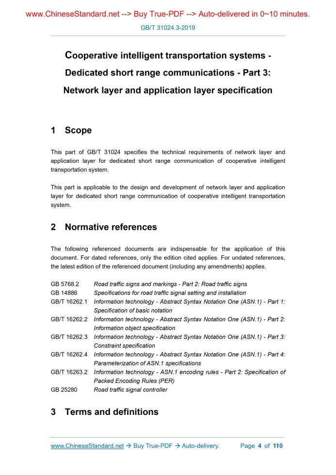 Similar standardsGB/T 31024.3-2019: Cooperative intelligent transportation systems -- Dedicated short range communications -- Part 3: Network layer and application layer specification---This is an excerpt. Full copy of true-PDF in English version (including equations, symbols, images, flow-chart, tables, and figures etc.), auto-downloaded/delivered in 9 seconds, can be purchased online: https://www.ChineseStandard.net/PDF.aspx/GBT31024.3-2019 NATIONAL STANDARD OF THE PEOPLE’S REPUBLIC OF CHINA ICS 35.100 L 79 Cooperative intelligent transportation systems - Dedicated short range communications - Part 3. Network layer and application layer specification Issued on. MAY 10, 2019 Implemented on. DECEMBER 1, 2009 Issued by. General Administration of Quality Supervision, Inspection and Quarantine; Standardization Administration of the People’s Republic of China. Table of ContentsForeword... 3 1 Scope... 4 2 Normative references... 4 3 Terms and definitions... 4 4 Abbreviations... 5 5 Technical requirements of network layer... 5 6 Interactive data set of application layer... 30 Annex A (Informative) Classification and value of Protocol Type... 104 Annex B (Informative) Preferred AID port number allocation... 105 Annex C (Informative) MIB message... 106 Annex D (Informative) Example of source/destination address design for adaptation layer... 108 Bibliography... 1101 ScopeThis part of GB/T 31024 specifies the technical requirements of network layer and application layer for dedicated short range communication of cooperative intelligent transportation system. This part is applicable to the design and development of network layer and application layer for dedicated short range communication of cooperative intelligent transportation system.2 Normative referencesThe following referenced documents are indispensable for the application of this document. For dated references, only the edition cited applies. For undated references, the latest edition of the referenced document (including any amendments) applies. GB 5768.2 Road traffic signs and markings - Part 2.Road traffic signs GB 14886 Specifications for road traffic signal setting and installation GB/T 16262.1 Information technology - Abstract Syntax Notation One (ASN.1) - Part 1. Specification of basic notation GB/T 16262.2 Information technology - Abstract Syntax Notation One (ASN.1) - Part 2. Information object specification GB/T 16262.3 Information technology - Abstract Syntax Notation One (ASN.1) - Part 3. Constraint specification GB/T 16262.4 Information technology - Abstract Syntax Notation One (ASN.1) - Part 4. Parameterization of ASN.1 specifications GB/T 16263.2 Information technology - ASN.1 encoding rules - Part 2.Specification of Packed Encoding Rules (PER) GB 25280 Road traffic signal controller3 Terms and definitionsFor the purposes of this document, the following terms and definitions apply. 3.1 dedicated short range communication wireless communication method for short range communication among traffic elements such as vehicles, infrastructures and pedestrians 3.2 dedicated short range communication management entity a universal set of dedicated short range communication management services that provides management interfaces for all data layer entities 3.3 management information base an entity used to store application configuration and status information4 AbbreviationsFor the purposes of this document, the following abbreviations apply. AID Application ID DME DSRC Management Entity DSA DSRC Service Advertisement DSM DSRC Short Message DSMP DSRC Short Message Protocol DSRC Dedicated Short Range Communication GNSS Global Navigation Satellite System IP Internet Protocol LLC Logical Link Control LTE Long Term Evolution LTE-V2X LTE Vehicle to Everything MAC Media Access Control MIB Management Information Base SAP Service Access Point TCP Transmission Control Protocol UDP User Data Protocol UPER Unaligned Packet Encoding Rules5 Technical requirements of network layer5.1 Network layer framework The DSRC network layer framework of cooperative intelligent transportation system is shown in Figure 1. 5.2 Technical requirements of data sublayer 5.2.1 General The data sublayer in the DSRC network layer of the cooperative intelligent transportation system comprises TCP/UDP, IP, DSMP and adaptation layer, wherein the IP protocol and the TCP/UDP protocol are not within the definition of this part. 5.2.2 Adaptation layer The adaptation layer provides the transmission adaptation function between the underlying access technology and the upper layer protocol stack. The adaptation layer receives the DSMP data packet, the IP data packet, or the DME data packet sent by the upper layer, distinguishes the underlying access technology used by the data packet to be sent, and delivers the corresponding data packet to the bottom layer in line with the corresponding access technology for transmission; 5.2.3 DSMP 5.2.3.1 DSM data frame format The layer-by-layer packaging process of DSM is shown in Figure 5. 5.3 Technical requirements of management sublayer 5.3.1 Application registration Before using management sublayer services, the application needs to be registered with the DME first. An application running on a DSRC device needs to be registered as a user application, so that the DME can send the received DSM to the corresponding application. 5.3.2 Service management Service management belongs to the internal operation of the device, and the corresponding functions are optional. When an application issues a service usage request to the DME, the DME will initialize the requested service. An example of the service management process is shown in Figure 7. 5.3.3 MIB maintenance The MIB operation process is shown in Figure 8.The MIB is responsible for management and maintenance of the application configuration and status information of the DSRC modules of the cooperative intelligent transportation system. The DME sets and queries the MIB information through 