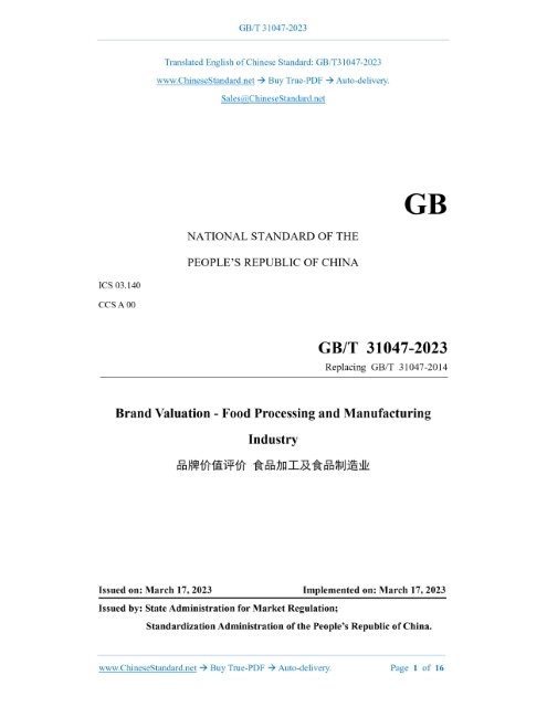 GB/T 31047-2023: Brand valuation - Food processing and manufacturing industry Delivery: 9 seconds. True-PDF full-copy in English & invoice will be downloaded + auto-delivered via email. See step-by-step procedure Status: Valid GB/T 31047: Historical versions