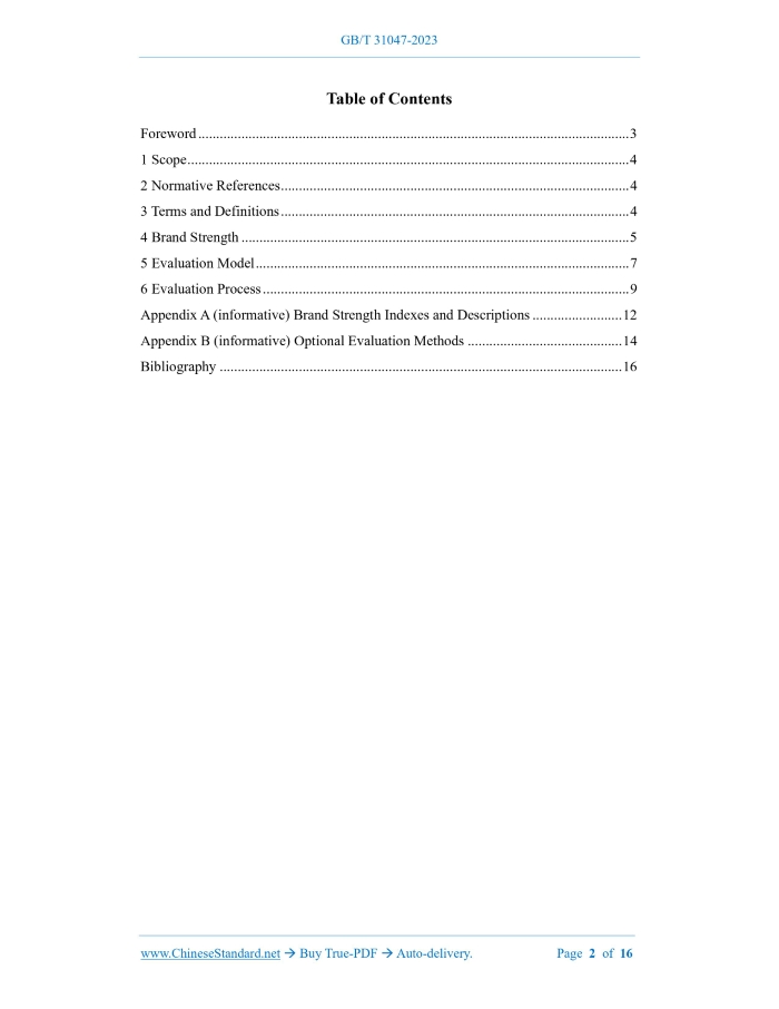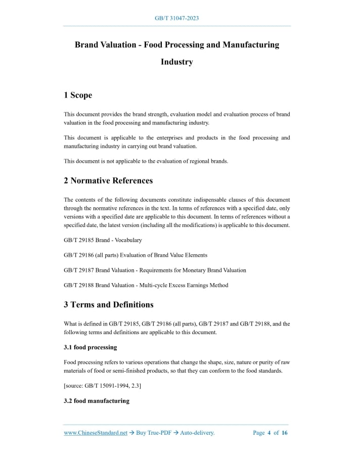 Similar standardsGB/T 31047-2023: Brand valuation - Food processing and manufacturing industry---This is an excerpt. Full copy of true-PDF in English version (including equations, symbols, images, flow-chart, tables, and figures etc.), auto-downloaded/delivered in 9 seconds, can be purchased online: https://www.ChineseStandard.net/PDF.aspx/GBT31047-2023GB NATIONAL STANDARD OF THE PEOPLE’S REPUBLIC OF CHINA ICS 03.140 CCS A 00 Replacing GB/T 31047-2014 Brand Valuation - Food Processing and Manufacturing Industry ISSUED ON: MARCH 17, 2023 IMPLEMENTED ON: MARCH 17, 2023 Issued by: State Administration for Market Regulation; Standardization Administration of the People’s Republic of China. Table of ContentsForeword ... 3 1 Scope ... 4 2 Normative References ... 4 3 Terms and Definitions ... 4 4 Brand Strength ... 5 5 Evaluation Model ... 7 6 Evaluation Process ... 9 Appendix A (informative) Brand Strength Indexes and Descriptions ... 12 Appendix B (informative) Optional Evaluation Methods ... 14 Bibliography ... 16 Brand Valuation - Food Processing and Manufacturing Industry1 ScopeThis document provides the brand strength, evaluation model and evaluation process of brand valuation in the food processing and manufacturing industry. This document is applicable to the enterprises and products in the food processing and manufacturing industry in carrying out brand valuation. This document is not applicable to the evaluation of regional brands.2 Normative ReferencesThe contents of the following documents constitute indispensable clauses of this document through the normative references in the text. In terms of references with a specified date, only versions with a specified date are applicable to this document. In terms of references without a specified date, the latest version (including all the modifications) is applicable to this document. GB/T 29185 Brand - Vocabulary GB/T 29186 (all parts) Evaluation of Brand Value Elements GB/T 29187 Brand Valuation - Requirements for Monetary Brand Valuation GB/T 29188 Brand Valuation - Multi-cycle Excess Earnings Method3 Terms and DefinitionsWhat is defined in GB/T 29185, GB/T 29186 (all parts), GB/T 29187 and GB/T 29188, and the following terms and definitions are applicable to this document. 3.1 food processing Food processing refers to various operations that change the shape, size, nature or purity of raw materials of food or semi-finished products, so that they can conform to the food standards. [source: GB/T 15091-1994, 2.3] 3.2 food manufacturing Food manufacturing refers to the entire process of processing raw materials of food or semi- finished products into substances that can be eaten or drunk by human beings. [source: GB/T 15091-1994, 2.2]4 Brand Strength4.1 Overview The forecasting and calculation indexes of brand strength of the food processing and manufacturing industry include: tangible element (K1), quality element (K2), innovation element (K3), service element (K4) and intangible element (K5). See Appendix A for the evaluation indexes and contents at all levels. 4.2 Tangible Element The evaluation indexes can include: ---market leadership; ---market development capability; ---profitability. 4.3 Quality Element The evaluation indexes can include: ---product quality and food safety level; ---product quality and food safety management level; ---food quality and food safety credit status. 4.4 Innovation Element The evaluation indexes can include: ---innovation capability; ---innovative achievements. 4.5 Service Element The evaluation indexes can include: ---service capability; ---customer relations. Different evaluation objectives will affect the evaluation procedures, evaluation accuracy and the form of results reporting. 6.2 Determine Evaluation Object and Scope Before the evaluation, the evaluation object shall be identified, defined and described, including the scope of its products or services, and the scope of brand valuation, etc. 6.3 Judge the Applicability of Evaluation Method In accordance with the characteristics of the brand being evaluated, judge the applicability of the evaluation method. When selecting an evaluation method, the following factors may be considered, but not limited to: a) Evaluation objective; b) Brand management status, for example, profitability; c) Availability of the data of various evaluation indexes involved in the method; d) Consistency requirements for evaluation results. 6.4 Determine Model Parameters In accordance with the relevant monetary policies and industry development policies of the country, region and industry where the brand is located, the economic conditions of the current market and the selected evaluation method, determine the following model parameters: a) Year and cycle of evaluation; b) Earnings forecasting method; c) Perpetual growth rate within the evaluation cycle; d) Industry average return on assets; e) Proportionality factor for the portion of the intangible asset income attributable to the brand. 6.5 Collect Evaluation Data Follow the principles of authenticity, accuracy and objectivity, collect all kinds of data needed for evaluation. The channels for obtaining evaluation data include, but are not limited to: ---Information and data publicly released or provided by the brand being evaluated;Appendix B(informative) Optional Evaluation Methods B.1 Cost Approach The cost approach is an evaluation approach of forecasting and calculating the brand value by deducting the depreciation caused by various losses on the basis of the replacement cost of brand building. When adopting this approach, the brand being evaluated should satisfy, but not limited to the following conditions: ---The brand being evaluated can continue to be used, that is, it can bring prospective earnings to its owner; ---There are cost information on brand establishment and maintenance, etc. B.2 Market Approach The market approach forecasts and calculates the value of the brand being evaluated by comparing the si