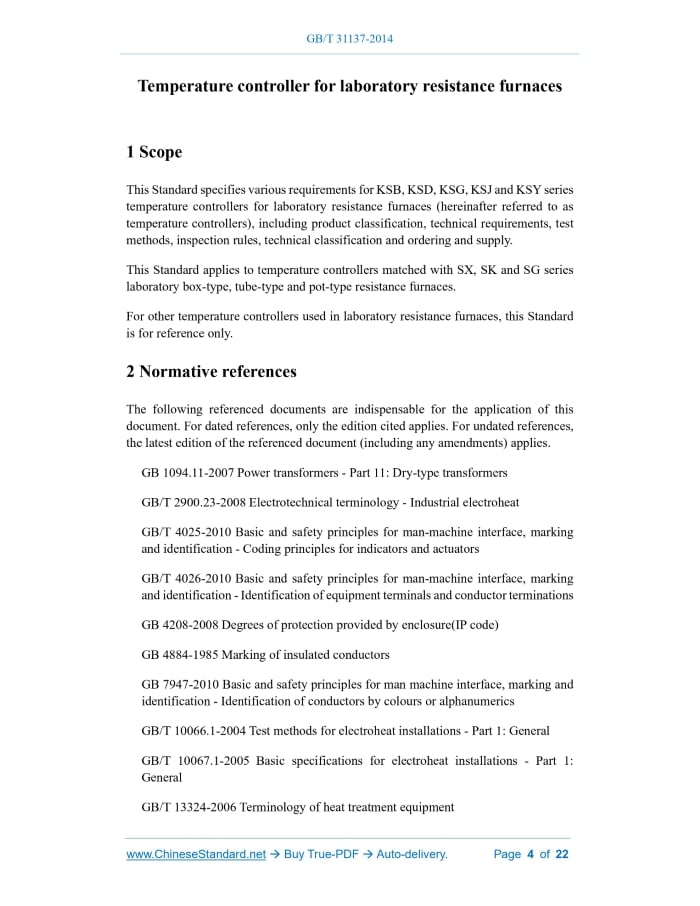 Similar standardsGB/T 31137-2014: Temperature controller for laboratory resistance furnaces---This is an excerpt. Full copy of true-PDF in English version (including equations, symbols, images, flow-chart, tables, and figures etc.), auto-downloaded/delivered in 9 seconds, can be purchased online: https://www.ChineseStandard.net/PDF.aspx/GBT31137-2014GB NATIONAL STANDARD OF THE PEOPLE’S REPUBLIC OF CHINA ICS 25.180.10 K 61 Temperature controller for laboratory resistance furnaces ISSUED ON: SEPTEMBER 3, 2014 IMPLEMENTED ON: FEBRUARY 1, 2015 Issued by: General Administration of Quality Supervision, Inspection and Quarantine of the People's Republic of China; Standardization Administration of the People’s Republic of China. Table of ContentsForeword ... 3 1 Scope ... 4 2 Normative references ... 4 3 Terms and definitions ... 5 4 Product classification ... 7 5 Technical requirements ... 10 6 Test methods ... 16 7 Inspection rules and technical classification ... 19 8 Marking, packaging, transportation and storage ... 20 9 Ordering and supply ... 21 Temperature controller for laboratory resistance furnaces1 ScopeThis Standard specifies various requirements for KSB, KSD, KSG, KSJ and KSY series temperature controllers for laboratory resistance furnaces (hereinafter referred to as temperature controllers), including product classification, technical requirements, test methods, inspection rules, technical classification and ordering and supply. This Standard applies to temperature controllers matched with SX, SK and SG series laboratory box-type, tube-type and pot-type resistance furnaces. For other temperature controllers used in laboratory resistance furnaces, this Standard is for reference only.2 Normative referencesThe following referenced documents are indispensable for the application of this document. For dated references, only the edition cited applies. For undated references, the latest edition of the referenced document (including any amendments) applies. GB 1094.11-2007 Power transformers - Part 11: Dry-type transformers GB/T 2900.23-2008 Electrotechnical terminology - Industrial electroheat GB/T 4025-2010 Basic and safety principles for man-machine interface, marking and identification - Coding principles for indicators and actuators GB/T 4026-2010 Basic and safety principles for man-machine interface, marking and identification - Identification of equipment terminals and conductor terminations GB 4208-2008 Degrees of protection provided by enclosure(IP code) GB 4884-1985 Marking of insulated conductors GB 7947-2010 Basic and safety principles for man machine interface, marking and identification - Identification of conductors by colours or alphanumerics GB/T 10066.1-2004 Test methods for electroheat installations - Part 1: General GB/T 10067.1-2005 Basic specifications for electroheat installations - Part 1: General GB/T 13324-2006 Terminology of heat treatment equipment h) temperature control accuracy, °C; i) overall dimensions of the control box (width × depth × height), mm; j) weight, kg.5 Technical requirements5.1 General requirements The temperature controller shall comply with the relevant provisions of Clause 5 of GB/T 10067.1-2005. When there is a difference between the provisions of that standard and this Standard, this Standard shall prevail. 5.2 Supplementary requirements for design and manufacturing 5.2.1 Overall design The temperature controller for laboratory resistance furnaces refers to the assembly of software and hardware units such as electrical control components and instruments that are centrally installed in the temperature control box to achieve heating temperature measurement, control and recording functions. Because the heating capacity of laboratory resistance furnaces is small and generally not partitioned, it is different from the temperature control cabinet for industrial resistance furnaces, and is called a temperature controller. The temperature controller can be in a separate box or integrated with the furnace. The temperature controller can be composed of a box (station) body, a frame and various electrical components, devices and instruments. The design of the temperature controller shall be able to ensure that the heat, arc, impact, vibration, magnetic field or electric field generated by the operation of each electrical component must not interfere with each other’s normal functioning. 5.2.2 Box (station) body The temperature controller is generally a separate box (station) body, connected to the heating body in the furnace through a cable, or it can be directly connected to the furnace body as a whole. The door or top cover of the temperature controller shall have hidden buckles or internal pins and shall be able to rotate flexibly. Its opening angle shall not be less than 90°. Electrical components and instruments shall not be impacted during the opening process. Separate holes shall be made on the box (station) body for signal wiring and lead-out wiring such as thermocouples, actuators, detection switches, etc. 5.2.3 Installation requirements All components, devices and instruments installed in the temperature controller must be inspected and qualified before installation. During installation, sufficient distance for disassembly and repair shall be left according to design requirements. The contactors and instruments in the temperature controller shall be equipped with appropriate anti-vibration measures (for example, adding spring washers or rubber pads) according to the actual working conditions. The wire outlet holes shall be equipped with insulating outlet rings. 5.2.4 Painting requirements The paint film surface of the temperature controller must not have defects such as wrinkles, flow marks, pinholes and blisters. The paint film on the outer surface of the temperature controller shall be uniform in color, flat and smooth, and no brush marks, scars, correction marks, obvious mechanical impurities, spots, etc. that can be seen wit