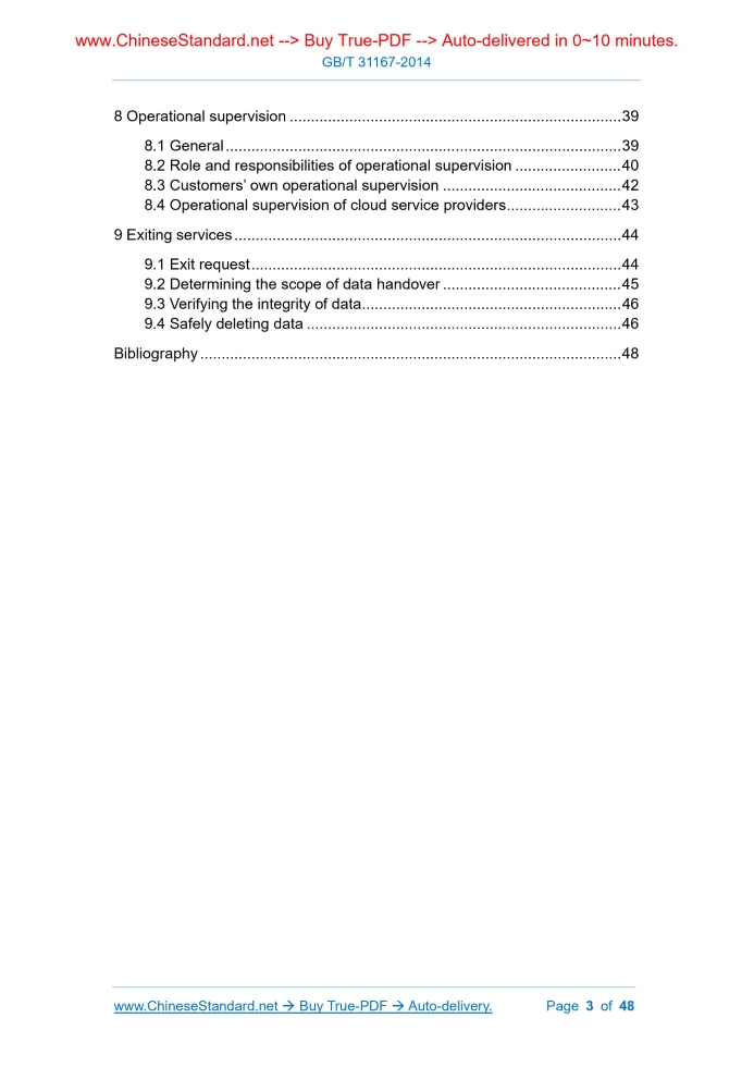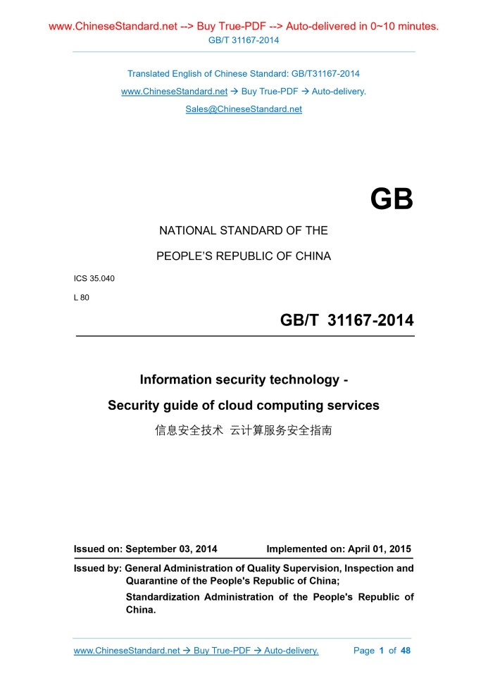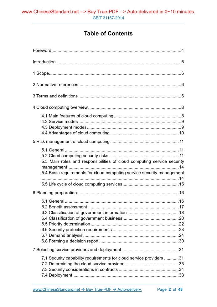 Similar standardsGB/T 31167-2014: Information security technology -- Security guide of cloud computing services---This is an excerpt. Full copy of true-PDF in English version (including equations, symbols, images, flow-chart, tables, and figures etc.), auto-downloaded/delivered in 9 seconds, can be purchased online: https://www.ChineseStandard.net/PDF.aspx/GBT31167-2014GB NATIONAL STANDARD OF THE PEOPLE’S REPUBLIC OF CHINA ICS 35.040 L 80 Information security technology - Security guide of cloud computing services Issued on: SEPTEMBER 03, 2014 Implemented on: APRIL 01, 2015 Issued by. General Administration of Quality Supervision, Inspection and Quarantine of the People's Republic of China; Standardization Administration of the People's Republic of China. Table of ContentsForeword... 4 Introduction... 5 1 Scope... 6 2 Normative references... 6 3 Terms and definitions... 6 4 Cloud computing overview... 8 4.1 Main features of cloud computing... 8 4.2 Service modes... 9 4.3 Deployment modes... 9 4.4 Advantages of cloud computing... 10 5 Risk management of cloud computing... 11 5.1 General... 11 5.2 Cloud computing security risks... 11 5.3 Main roles and responsibilities of cloud computing service security management... 14 5.4 Basic requirements for cloud computing service security management ... 14 5.5 Life cycle of cloud computing services... 15 6 Planning preparation... 16 6.1 General... 16 6.2 Benefit assessment... 17 6.3 Classification of government information... 18 6.4 Classification of government business... 20 6.5 Priority determination... 22 6.6 Security protection requirements... 23 6.7 Demand analysis... 24 6.8 Forming a decision report... 30 7 Selecting service providers and deployment... 31 7.1 Security capability requirements for cloud service providers... 31 7.2 Determining the cloud service provider... 33 7.3 Security considerations in contracts... 34 7.4 Deployment... 38 8 Operational supervision... 39 8.1 General... 39 8.2 Role and responsibilities of operational supervision... 40 8.3 Customers’ own operational supervision... 42 8.4 Operational supervision of cloud service providers... 43 9 Exiting services... 44 9.1 Exit request... 44 9.2 Determining the scope of data handover... 45 9.3 Verifying the integrity of data... 46 9.4 Safely deleting data... 46 Bibliography... 48 Information security technology - Security guide of cloud computing services1 ScopeThis Standard describes the main security risks that cloud computing may face, proposes the basic requirements for the security management of cloud computing services by government departments and the security management and technical requirements for each phase of the life cycle of cloud computing services. This Standard provides safety guidance throughout the life cycle for government departments to adopt cloud computing services, especially socialized cloud computing services. It is applicable for government departments to purchase and use cloud computing services, and can also be used for reference by key industries and other enterprises and institutions.2 Normative referencesThe following referenced documents are indispensable for the application of this document. For dated references, only the edition cited applies. For undated references, the latest edition of the referenced document (including any amendments) applies. GB/T 25069-2010 Information security technology glossary GB/T 31168-2014 Information security technology - Security capability requirements of cloud computing services3 Terms and definitionsFor the purpose of this document, the following terms and definitions and those defined in GB/T 25069-2010 apply. 3.1 cloud computing A mode of accessing scalable, flexible physical or virtual shared resource pools via network, and acquiring and managing resources as needed by the self. 4.2 Service modes According to the types of resources provided by the cloud service provider, cloud service modes can be divided into three main categories. a) Software as a Service (SaaS). In SaaS mode, the cloud service provider provides customers with applications running on the cloud computing infrastructure. Customers do not need to purchase or develop software. They can use the client (such as a web browser) or program interface on different devices to access and use the applications provided by the cloud service provider via internet, such as email system and collaborative office system. Customers usually cannot manage or control low-level resources, such as networks, servers, operating systems, storage, etc., that support the operation of applications, but they may have limited configuration management of applications. b) Platform as a Service (PaaS). In PaaS mode, the cloud service provider provides customers with software development and operation platforms running on the cloud computing infrastructure, such as standard languages and tools, data access, general interfaces, etc. Customers can use the platform to develop and deploy their own software. Customers usually cannot manage or control the low-level resources, such as networks, servers, operating systems, storage, etc., required to support the platform, but they can configure the application's operating environment and control the applications deployed by themselves. c) Infrastructure as a Service (IaaS). In IaaS mode, the cloud service provider provides computing resources such as virtual machines, storage, and networks to customers, and provides service interfaces to access the cloud computing infrastructure. Customers can deploy or run operating systems, middleware, databases and applications on these resources. Customers usually cannot manage or control the cloud computing infrastructure, but they can control the operating systems, storage, and applications deployed by themselves, as well as partially control the network components they use, such as host firewalls. 4.3 Deployment modes Depending on the range of customers using the cloud computing platform, c