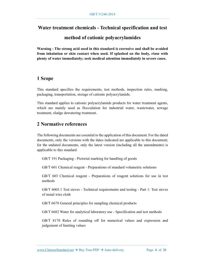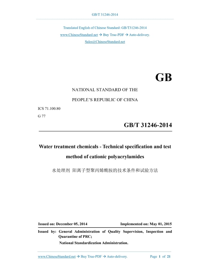 GB/T 31246-2014: Water treatment chemicals - Technical specification and test method of cationic polyacrylamides Delivery: 9 seconds. True-PDF full-copy in English & invoice will be downloaded + auto-delivered via email. See step-by-step procedure Status: Valid