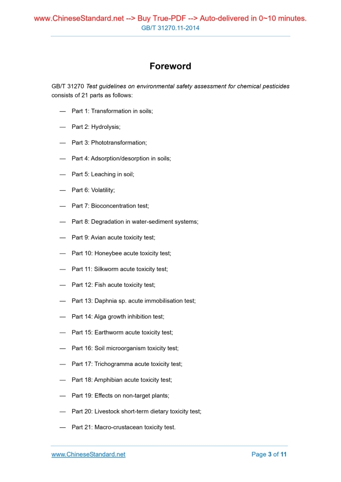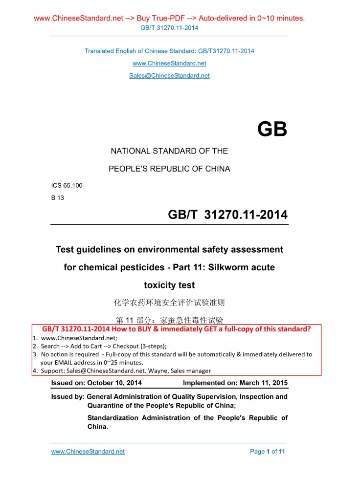 GB/T 31270.11-2014: Test guidelines on environmental safety assessment for chemical pesticides -- Part 11: Silkworm acute toxicity test Delivery: 9 seconds. True-PDF full-copy in English & invoice will be downloaded + auto-delivered via email. See step-by-step procedure Status: Valid GB/T 31270.11: Historical versions