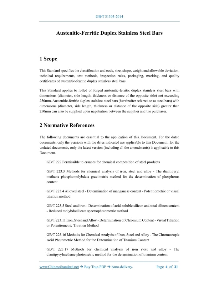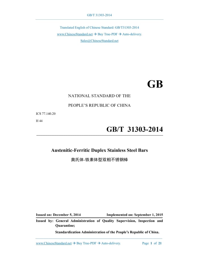 GB/T 31303-2014: Austenitic-Ferritic duplex stainless steel bars Delivery: 9 seconds. True-PDF full-copy in English & invoice will be downloaded + auto-delivered via email. See step-by-step procedure Status: Valid