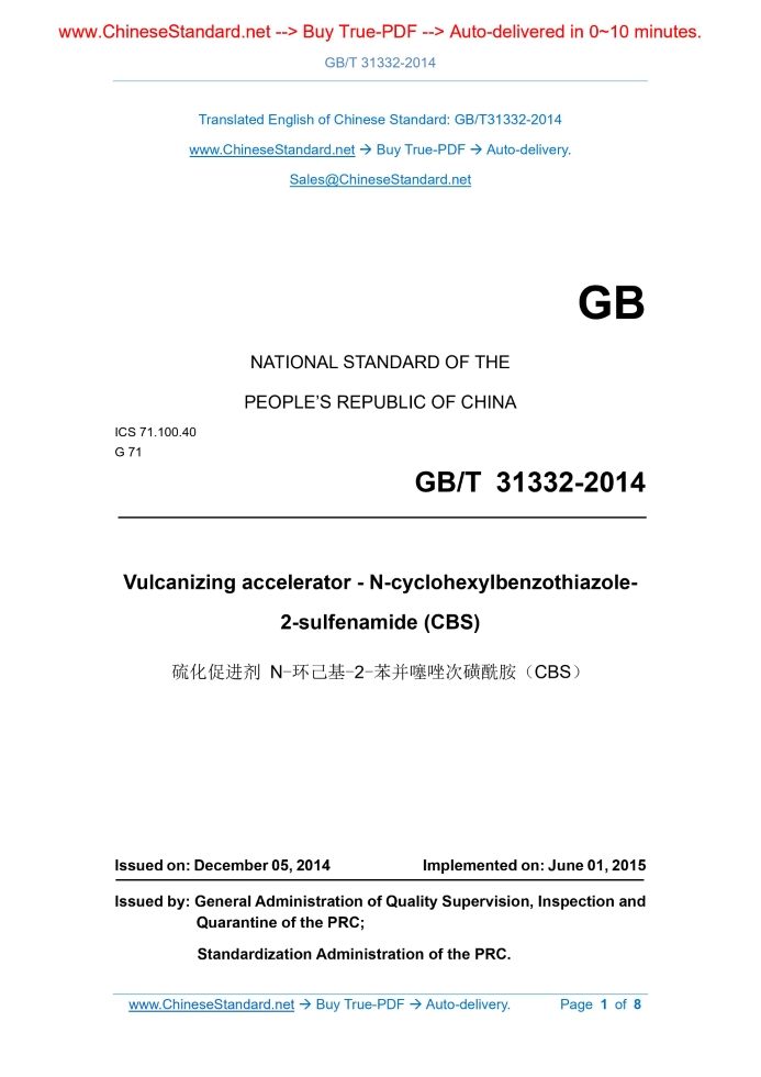 GB/T 31332-2014: Vulcanizing accelerator -- N-cyclohexylbenzothiazole-2-sulfenamide (CBS) Delivery: 9 seconds. True-PDF full-copy in English & invoice will be downloaded + auto-delivered via email. See step-by-step procedure Status: Valid