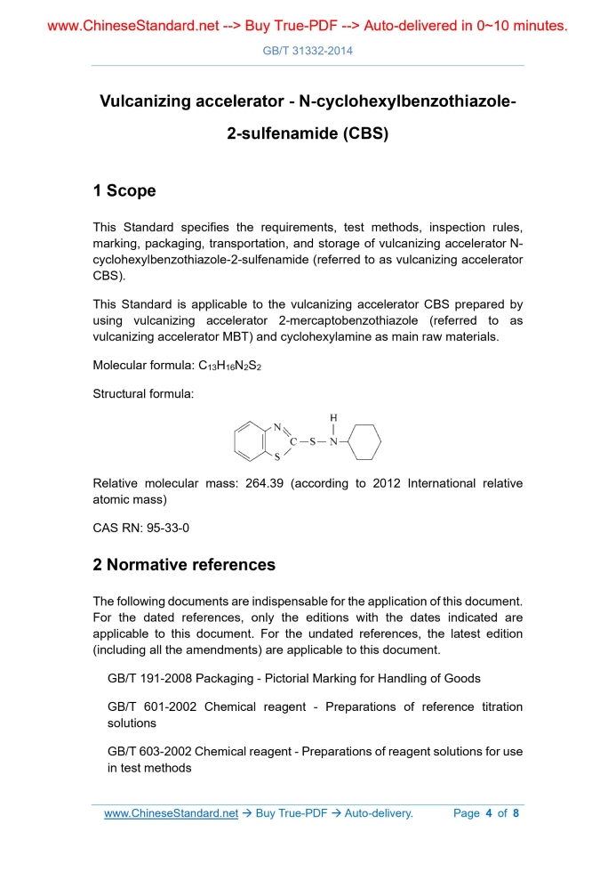 Similar standardsGB/T 31332-2014: Vulcanizing accelerator -- N-cyclohexylbenzothiazole-2-sulfenamide (CBS)---This is an excerpt. Full copy of true-PDF in English version (including equations, symbols, images, flow-chart, tables, and figures etc.), auto-downloaded/delivered in 9 seconds, can be purchased online: https://www.ChineseStandard.net/PDF.aspx/GBT31332-2014NATIONAL STANDARD OF THE PEOPLE’S REPUBLIC OF CHINA ICS 71.100.40 G 71 Vulcanizing accelerator - N-cyclohexylbenzothiazole- 2-sulfenamide (CBS) ISSUED ON: DECEMBER 05, 2014 IMPLEMENTED ON: JUNE 01, 2015 Issued by: General Administration of Quality Supervision, Inspection and Quarantine of the PRC; Standardization Administration of the PRC. Table of ContentsForeword ... 3 1 Scope ... 4 2 Normative references ... 4 3 Requirements ... 5 4 Test methods ... 5 5 Inspection rules ... 7 6 Marking, packaging, transportation, and storage ... 8 Vulcanizing accelerator - N-cyclohexylbenzothiazole- 2-sulfenamide (CBS)1 ScopeThis Standard specifies the requirements, test methods, inspection rules, marking, packaging, transportation, and storage of vulcanizing accelerator N- cyclohexylbenzothiazole-2-sulfenamide (referred to as vulcanizing accelerator CBS). This Standard is applicable to the vulcanizing accelerator CBS prepared by using vulcanizing accelerator 2-mercaptobenzothiazole (referred to as vulcanizing accelerator MBT) and cyclohexylamine as main raw materials. Molecular formula: C13H16N2S2 Structural formula: Relative molecular mass: 264.39 (according to 2012 International relative atomic mass) CAS RN: 95-33-02 Normative referencesThe following documents are indispensable for the application of this document. For the dated references, only the editions with the dates indicated are applicable to this document. For the undated references, the latest edition (including all the amendments) are applicable to this document. GB/T 191-2008 Packaging - Pictorial Marking for Handling of Goods GB/T 601-2002 Chemical reagent - Preparations of reference titration solutions GB/T 603-2002 Chemical reagent - Preparations of reagent solutions for use in test methods The expression and rounding off rules of the test data in this Standard shall comply with the relevant provisions of the 4.3.3 rounded-off value comparison method in GB/T 8170-2008. 4.2 Appearance Visual inspection under natural light. 4.3 Determination of initial melting point It shall be determined according to the provisions of 3.1 of GB/T 11409-2008. 4.4 Determination of heating loss It shall be determined according to the provisions of 3.4 of GB/T 11409-2008. The sample weighing amount is about 2 g (accurate to 0.0001 g). The temperature of electrothermal constant-temperature drying oven is controlled at (70±2)°C. The heating time is 3 h. The difference between the results of two parallel determinations shall not exceed 0.04%. The arithmetic mean of the results of two parallel determinations shall be taken as the determination result. 4.5 Determination of ash It shall be determined according to the provisions of 3.7 of GB/T 11409-2008. The sample weighing amount is about 3 g (accurate to 0.0001 g). The temperature of high-temperature furnace is controlled at (750±25)°C. The difference between the results of two parallel determinations shall not exceed 0.04%. The arithmetic mean of the results of two parallel determinations shall be taken as the determination result. 4.6 Determination of sieve residue It shall be determined according to the provisions of 3.5.2 of GB/T 11409-2008. The difference between the results of two parallel determinations shall not exceed 0.02%. The arithmetic mean of the results of two parallel determinations shall be taken as the determination result. 4.7 Determination of methanol insolubles It shall be determined according to the provisions of 5.5 of GB/T 21184-2007. The difference between the results of two parallel determinations shall not exceed 0.05%. The arithmetic mean of the results of two parallel determinations shall be taken as the determination result. 4.8 Determination of purity and free amine 4.8.1 Determination of purity and free amine (titration method) 5.5 Re-inspection If one item of the exit-factory inspection results does not meet the requirements of this Standard, from twice the package of the same lot of products, re- sampling shall be carried out for re-inspection. Even if only one of the indexes in the re-inspection results does not meet the requirements of this Standard, the lot of products is judged as unqualified products.6 Marking, packaging, transportation, and storage6.1 Marking The vulcanizing accelerator CBS shall have a clear and firm mark on the outer packaging. Its content shall include product name, standard number, manufacturer name, address, production date, lot number, trademark, net quantity, etc. According to the provisions of GB/T 191-2008, MARK the signs such as “avoid sun” and “avoid rain”. 6.2 Packaging The vulcanizing accelerator CBS is packaged using a woven bag lined with plastic bag or a paper-plastic compound bag. The net quantity of each bag is 25 kg. Special packaging shall be in accordance with user requirements. 6.3 Transportation The vulcanizing accelerator CBS, when transported, shall be protected from rain and sun; when handling, lightly loaded and unloaded to prevent impact. 6.4 Storage The vulcanizing accelerator CBS shall be stored in a clean, dry, well-ventilated warehouse. It shall avoid direct sunlight. The distance from the wall shall be greater than 0.5 m. It shall not be close to the water pipes, sewers, and heating devices, to prevent moisture and deterioration. It shall not be close to the fire source. The vulcanizing accelerator CBS, under the transportation and storage conditions in accordance with the provisions of this Standard, from the date of production, shall have a storage period of 6 months. __________ END __________ ......Source: Above contents are excerpted from the 