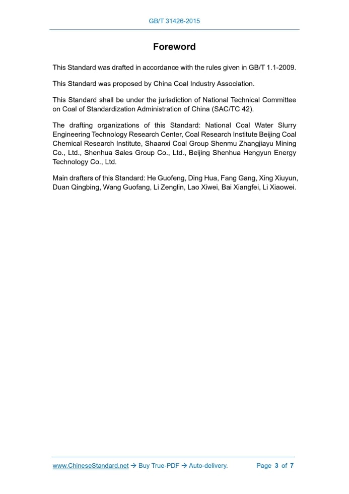 Similar standardsGB/T 31426-2015: Coal water slurry for gasification---This is an excerpt. Full copy of true-PDF in English version (including equations, symbols, images, flow-chart, tables, and figures etc.), auto-downloaded/delivered in 9 seconds, can be purchased online: https://www.ChineseStandard.net/PDF.aspx/GBT31426-2015GB NATIONAL STANDARD OF THE PEOPLE’S REPUBLIC OF CHINA ICS 75.160 D 20 Coal water slurry for gasification 气化水煤浆 Issued on: MAY 15, 2015 Implemented on: JULY 01, 2015 Issued by. General Administration of Quality Supervision, Inspection and Quarantine; Standardization Administration of the People's Republic of China. Table of ContentsForeword ... 3 1 Scope ... 4 2 Normative references ... 4 3 Terms and definitions ... 5 4 Quality requirements ... 5 5 Sampling, inspection and determination ... 6 6 Product marks ... 7ForewordThis Standard was drafted in accordance with the rules given in GB/T 1.1-2009. This Standard was proposed by China Coal Industry Association. This Standard shall be under the jurisdiction of National Technical Committee on Coal of Standardization Administration of China (SAC/TC 42). The drafting organizations of this Standard. National Coal Water Slurry Engineering Technology Research Center, Coal Research Institute Beijing Coal Chemical Research Institute, Shaanxi Coal Group Shenmu Zhangjiayu Mining Co., Ltd., Shenhua Sales Group Co., Ltd., Beijing Shenhua Hengyun Energy Technology Co., Ltd. Main drafters of this Standard. He Guofeng, Ding Hua, Fang Gang, Xing Xiuyun, Duan Qingbing, Wang Guofang, Li Zenglin, Lao Xiwei, Bai Xiangfei, Li Xiaowei. Coal water slurry for gasification1 ScopeThis Standard specifies the terms and definitions, quality requirements, sampling, inspection and determination, product marks of coal water slurry for gasification. This Standard is applicable to coal water slurry for gasification used by wet flow bed.2 Normative referencesThe following referenced documents are indispensable for the application of this document. For dated references, only the edition cited applies. For undated references, the latest edition of the referenced document (including any amendments) applies. GB/T 212, Proximate analysis of coal Obsolete GB/T 219, Determination of fusibility of coal ash GB/T 3058, Determination of arsenic in coal GB/T 3558, Determination of chlorine in coal GB/T 16659, Determination of mercury in coal GB/T 18856.1, Test methods for quality of coal water mixture - Part 1 - Sampling for coal water mixture GB/T 18856.2, Test methods for coal water mixture - Part 2. Determination of mass percentage of solid GB/T 18856.3, Test methods for coal water mixture - Part 3. Sieving method GB/T 18856.4, Test methods for coal water mixture - Part 4. Determination of apparent viscosity GB/T 25209, Commercial coal marking GB/T 25215, Guide for testing methods for coal water mixture ......Source: Above contents are excerpted from the full-copy PDF -- translated/reviewed by: www.ChineseStandard.net / Wayne Zheng et al. Tips & Frequently Asked Questions:Question 1: How long will the true-PDF of English version of GB/T 31426-2015 be delivered?Answer: The full copy PDF of English version of GB/T 31426-2015 can be downloaded in 9 seconds, and it will also be emailed to you in 9 seconds (double mechanisms to ensure the delivery reliably), with PDF-invoice.Question 2: Can I share the purchased PDF of GB/T 31426-2015_English with my colleagues?Answer: Yes. The purchased PDF of GB/T 31426-2015_English will be deemed to be sold to your employer/organization who actually paid for it, including your colleagues and your employer's intranet.Question 3: Does the price include tax/VAT?Answer: Yes. Our tax invoice, downloaded/delivered in 9 seconds, includes all tax/VAT and complies with 100+ countries' tax regulations (tax exempted in 100+ countries) -- See Avoidance of Double Taxation Agreements (DTAs): List of DTAs signed between Singapore and 100+ countriesQuestion 4: Do you accept my currency other than USD?Answer: Yes. www.ChineseStandard.us -- GB/T 31426-2015 -- Click this link and select your country/currency to pay, the exact amount in your currency will be printed on the invoice. Full PDF will also be downloaded/emailed in 9 seconds.How to buy and download a true PDF of English version of GB/T 31426-2015?A step-by-step guide to download PDF of GB/T 31426-2015_EnglishStep 1: Visit website https://www.ChineseStandard.net (Pay in USD), or https://www.ChineseStandard.us (Pay in any currencies such as Euro, KRW, JPY, AUD).Step 2: Search keyword "GB/T 31426-2015". Step 3: Click "Add to Cart". If multiple PDFs are required, repeat steps 2 and 3 to add up to 12 PDFs to cart. Step 4: Select payment option (Via payment agents Stripe or PayPal). Step 5: Customize Tax Invoice -- Fill up your email etc. Step 6: Click "Checkout". Step 7: Make payment by credit card, PayPal, Google Pay etc. After the payment is completed and in 9 seconds, you will receive 2 emails attached with the purchased PDFs and PDF-invoice, respectively. Step 8: Optional -- Go to download PDF. Step 9: Optional -- Click Open/Download PDF to download PDFs and invoice. See screenshots for above steps: Steps 1~3 Steps 4~6 Step 7 Step 8 Step 9 |