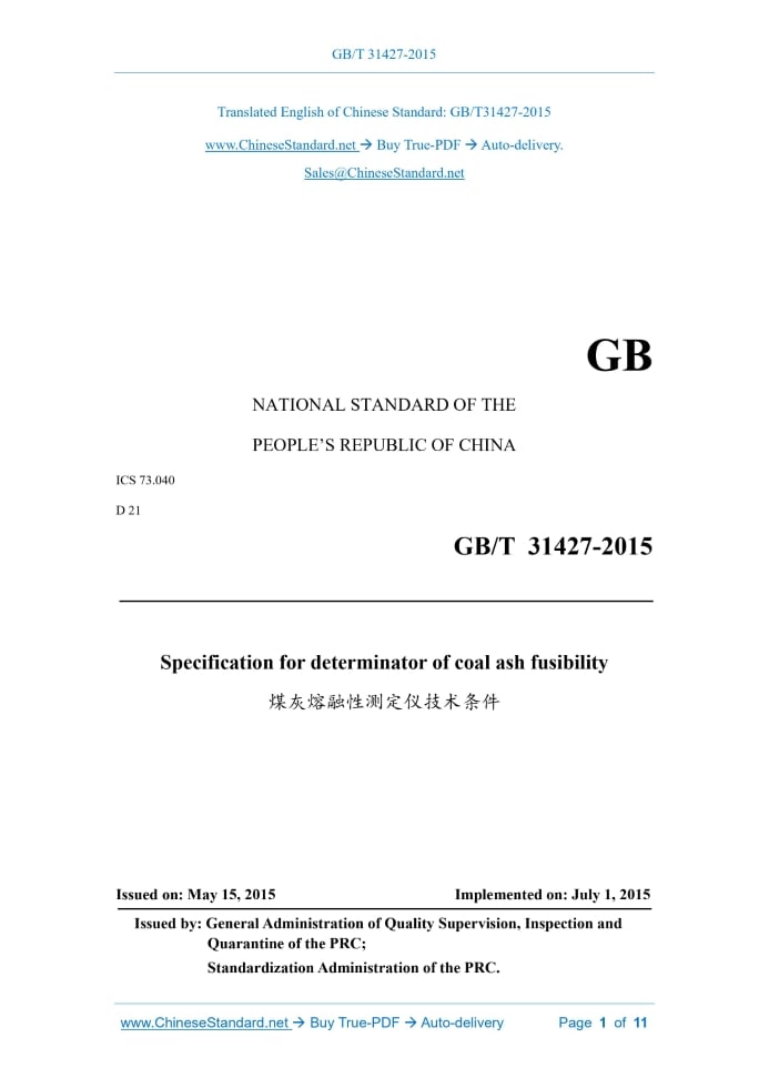 GB/T 31427-2015: Specification for determinator of coal ash fusibility Delivery: 9 seconds. True-PDF full-copy in English & invoice will be downloaded + auto-delivered via email. See step-by-step procedure Status: Valid