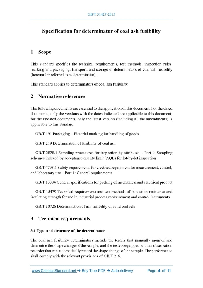 Similar standardsGB/T 31427-2015: Specification for determinator of coal ash fusibility---This is an excerpt. Full copy of true-PDF in English version (including equations, symbols, images, flow-chart, tables, and figures etc.), auto-downloaded/delivered in 9 seconds, can be purchased online: https://www.ChineseStandard.net/PDF.aspx/GBT31427-2015NATIONAL STANDARD OF THE PEOPLE’S REPUBLIC OF CHINA ICS 73.040 D 21 Specification for determinator of coal ash fusibility ISSUED ON: MAY 15, 2015 IMPLEMENTED ON: JULY 1, 2015 Issued by: General Administration of Quality Supervision, Inspection and Quarantine of the PRC; Standardization Administration of the PRC. Table of ContentsForeword ... 3 1 Scope ... 4 2 Normative references ... 4 3 Technical requirements ... 4 4 Inspection methods ... 7 5 Inspection rules ... 8 6 Identification and packaging ... 10 7 Transport and storage ... 11 Specification for determinator of coal ash fusibility1 ScopeThis standard specifies the technical requirements, test methods, inspection rules, marking and packaging, transport, and storage of determinators of coal ash fusibility (hereinafter referred to as determinator). This standard applies to determinators of coal ash fusibility.2 Normative referencesThe following documents are essential to the application of this document. For the dated documents, only the versions with the dates indicated are applicable to this document; for the undated documents, only the latest version (including all the amendments) is applicable to this standard. GB/T 191 Packaging—Pictorial marking for handling of goods GB/T 219 Determination of fusibility of coal ash GB/T 2828.1 Sampling procedures for inspection by attributes -- Part 1: Sampling schemes indexed by acceptance quality limit (AQL) for lot-by-lot inspection GB/T 4793.1 Safety requirements for electrical equipment for measurement, control, and laboratory use—Part 1: General requirements GB/T 13384 General specifications for packing of mechanical and electrical product GB/T 15479 Technical requirements and test methods of insulation resistance and insulating strength for use in industrial process measurement and control instruments GB/T 30726 Determination of ash fusibility of solid biofuels3 Technical requirements3.1 Type and structure of the determinator The coal ash fusibility determinators include the testers that manually monitor and determine the shape change of the sample, and the testers equipped with an observation recorder that can automatically record the shape change of the sample. The performance shall comply with the relevant provisions of GB/T 219. heated according to the procedures specified in GB/T 30726: when the temperature is below 700 °C, the heating rate is 15 °C/min~20 °C/min; when the temperature is above 700 °C, the heating rate is 4 °C/min~6 °C/min. 3.4.4 The atmosphere in the furnace can be controlled as a weak reducing atmosphere or an oxidizing atmosphere. 3.4.5 If adopting the carbon sealing method, the manufacturer should use the furnace tube of the same variety and specification, and provide a reference method for carbon sealing to control the weak reducing atmosphere in the furnace. 3.4.6 There shall be an observation port, through which the shape changes of the sample during the test can be clearly observed. 3.4.7 Temperature of the shell: when the high-temperature furnace works, the shell’s temperature shall be not more than 70 °C; there shall be a high-temperature warning sign. 3.5 Temperature controller 3.5.1 The temperature measurement range shall be 0 °C~1500 °C, and the resolution shall be 1 °C. 3.5.2 The temperature measurement error shall be not more than 5 °C. 3.5.3 The heating rate can be controlled according to 3.4.3. 3.6 Observation recorder 3.6.1 The temperature change during the test and the shape change of the sample at the corresponding temperature can be recorded truthfully. 3.6.2 The test process with a real-time temperature display can be played back. 3.6.3 The test process can be monitored manually. 3.7 Appearance requirements The metal coating and chemically treated surface shall be uniform in color; there shall be no exposed bottom, peeling, blistering, spots, scratches, or scuffing; it shall have good anticorrosion and anti-rust performance. 3.8 Insulation resistance and dielectric strength The insulation resistance between the power terminal of the independent power supply part and the casing of the determinator shall not be less than 20 MΩ. It shall be able to withstand 1500 V, 50 Hz AC for 1 min, without arcing and breakdown.4 Inspection methods4.1 High-temperature furnace 4.1.1 Determination of the maximum heating temperature: the high-temperature furnace shall be heated to the maximum temperature according to the heating program, which shall meet the requirements of 3.4.1. 4.1.2 Determination of the constant temperature zone: control the furnace temperature at 1000 °C, keep the temperature constant for 10 min, and use another set of standard platinum-rhodium platinum thermocouple pyrometers to determine the location and area of the constant temperature zone in the high-temperature furnace; the constant temperature zone shall meet the requirements of 3.4.2. 4.1.3 Determination of the heating rate: turn on the power of the high-temperature furnace, heat up to the maximum temperature according to the heating program, and record the temperature every 5 minutes through the temperature indicating instrument. Calculate the heating rate before and after 900 °C or 700 °C, and the average heating rate within each 10 min shall meet the requirements of 3.4.3. 4.1.4 Inspection of the atmosphere: The atmosphere in the furnace shall be inspected according to the provisions of GB/T 219, which shall meet the requirements of 3.4.4. 4.1.5 Inspection of the observation port: Observe the shape change of the sample from the observation port by visual inspection, which shall meet the requirements of 3.4.6. 4.1.6 Det