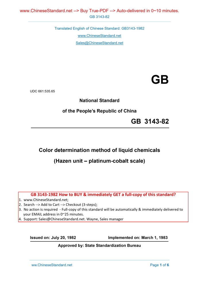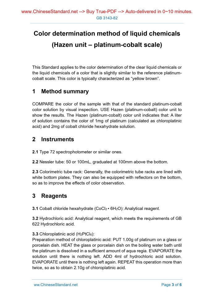 GB/T 3143-1982: Color determination method of liquid chemicals (Hazen unit - Platinum-cobalt scale) Delivery: 9 seconds. True-PDF full-copy in English & invoice will be downloaded + auto-delivered via email. See step-by-step procedure