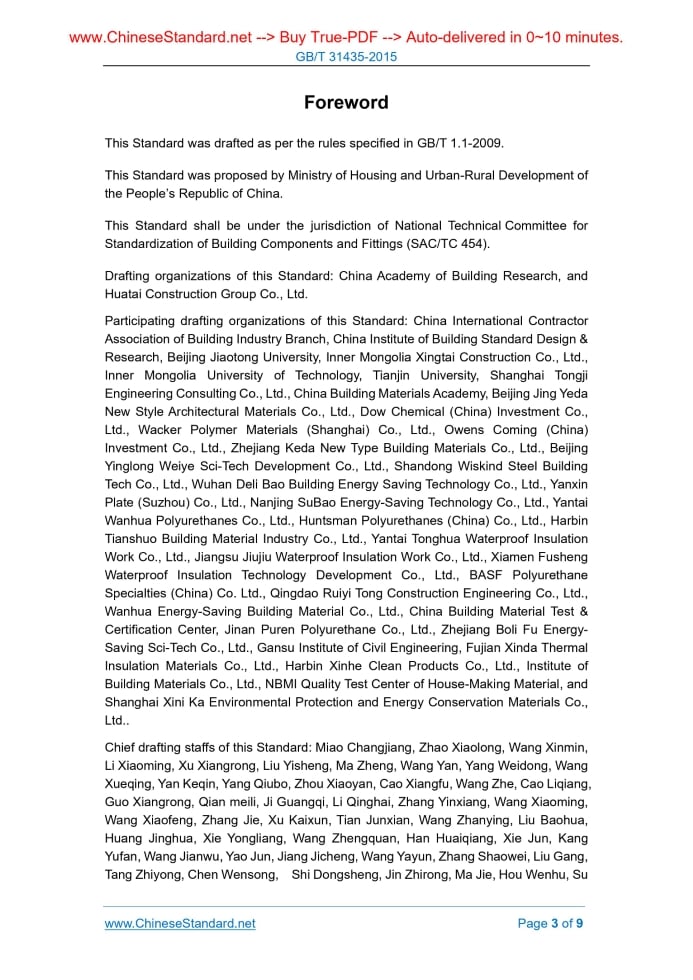Similar standardsGB/T 31435-2015: Safety evaluation methods on the materials of external thermal insulation composite systems---This is an excerpt. Full copy of true-PDF in English version (including equations, symbols, images, flow-chart, tables, and figures etc.), auto-downloaded/delivered in 9 seconds, can be purchased online: https://www.ChineseStandard.net/PDF.aspx/GBT31435-2015 GB NATIONAL STANDARD OF THE PEOPLE’S REPUBLIC OF CHINA ICS 91.100.60 Q 25 Safety Evaluation Methods on the Materials of External Thermal Insulation Composite Systems Issued on: MAY 15, 2015 Implemented on: DECEMBER 1, 2015 Issued by. General Administration of Quality Supervision, Inspection and Quarantine; Standardization Administration of PRC. Table of ContentsForeword ... 3 1 Scope ... 5 2 Normative References ... 5 3 Terms and Definitions ... 6 4 General Rules ... 6 5 Safety Evaluation ... 6 6 Test Methods ... 8ForewordThis Standard was drafted as per the rules specified in GB/T 1.1-2009. This Standard was proposed by Ministry of Housing and Urban-Rural Development of the People’s Republic of China. This Standard shall be under the jurisdiction of National Technical Committee for Standardization of Building Components and Fittings (SAC/TC 454). Drafting organizations of this Standard. China Academy of Building Research, and Huatai Construction Group Co., Ltd. Participating drafting organizations of this Standard. China International Contractor Association of Building Industry Branch, China Institute of Building Standard Design & Research, Beijing Jiaotong University, Inner Mongolia Xingtai Construction Co., Ltd., Inner Mongolia University of Technology, Tianjin University, Shanghai Tongji Engineering Consulting Co., Ltd., China Building Materials Academy, Beijing Jing Yeda New Style Architectural Materials Co., Ltd., Dow Chemical (China) Investment Co., Ltd., Wacker Polymer Materials (Shanghai) Co., Ltd., Owens Coming (China) Investment Co., Ltd., Zhejiang Keda New Type Building Materials Co., Ltd., Beijing Yinglong Weiye Sci-Tech Development Co., Ltd., Shandong Wiskind Steel Building Tech Co., Ltd., Wuhan Deli Bao Building Energy Saving Technology Co., Ltd., Yanxin Plate (Suzhou) Co., Ltd., Nanjing SuBao Energy-Saving Technology Co., Ltd., Yantai Wanhua Polyurethanes Co., Ltd., Huntsman Polyurethanes (China) Co., Ltd., Harbin Tianshuo Building Material Industry Co., Ltd., Yantai Tonghua Waterproof Insulation Work Co., Ltd., Jiangsu Jiujiu Waterproof Insulation Work Co., Ltd., Xiamen Fusheng Waterproof Insulation Technology Development Co., Ltd., BASF Polyurethane Specialties (China) Co. Ltd., Qingdao Ruiyi Tong Construction Engineering Co., Ltd., Wanhua Energy-Saving Building Material Co., Ltd., China Building Material Test & Certification Center, Jinan Puren Polyurethane Co., Ltd., Zhejiang Boli Fu Energy- Saving Sci-Tech Co., Ltd., Gansu Institute of Civil Engineering, Fujian Xinda Thermal Insulation Materials Co., Ltd., Harbin Xinhe Clean Products Co., Ltd., Institute of Building Materials Co., Ltd., NBMI Quality Test Center of House-Making Material, and Shanghai Xini Ka Environmental Protection and Energy Conservation Materials Co., Ltd.. Chief drafting staffs of this Standard. Miao Changjiang, Zhao Xiaolong, Wang Xinmin, Li Xiaoming, Xu Xiangrong, Liu Yisheng, Ma Zheng, Wang Yan, Yang Weidong, Wang Xueqing, Yan Keqin, Yang Qiubo, Zhou Xiaoyan, Cao Xiangfu, Wang Zhe, Cao Liqiang, Guo Xiangrong, Qian meili, Ji Guangqi, Li Qinghai, Zhang Yinxiang, Wang Xiaoming, Wang Xiaofeng, Zhang Jie, Xu Kaixun, Tian Junxian, Wang Zhanying, Liu Baohua, Huang Jinghua, Xie Yongliang, Wang Zhengquan, Han Huaiqiang, Xie Jun, Kang Yufan, Wang Jianwu, Yao Jun, Jiang Jicheng, Wang Yayun, Zhang Shaowei, Liu Gang, Tang Zhiyong, Chen Wensong, Shi Dongsheng, Jin Zhirong, Ma Jie, Hou Wenhu, Su Safety Evaluation Methods on the Materials of External Thermal Insulation Composite Systems1 ScopeThis Standard specifies the terms and definitions, general rules, safety evaluation and test methods on the materials of external thermal insulation composite systems. This Standard is applicable to the safety evaluation on the materials of external thermal insulation composite systems for civil building non-curtain wall.2 Normative ReferencesThe following documents are essential to the application of this document. For the dated documents, only the versions with the dates indicated are applicable to this document; for the undated documents, only the latest version (including all the amendments) are applicable to this document. GB/T 2406.2 Plastics - Determination of Burning Behavior by Oxygen Index - Part 2. Ambient-Temperature Test GB 8624 Classification for Burning Behavior of Building Materials and Products GB/T 20285 Toxic Classification of Fire Effluents Hazard for Materials GB 50325 Code for Indoor Environmental Pollution Control of Civil Building Engineering GB 50404 Technical Code for Rigid Polyurethane Foam Insulation and Waterproof Engineering JG 149 External Thermal Insulation Composite Systems Based on Expanded Polystyrene Panel JG 158 External Thermal Insulating Rendering Systems Made of Mortar with Mineral Binder and Using Expanded Polystyrene Granule as Aggredate JG/T 228 Technical Requirements of External Thermal Insulation with Expanded Polystyrene Panel for in Situ Concrete ......Source: Above contents are excerpted from the full-copy PDF -- translated/reviewed by: www.ChineseStandard.net / Wayne Zheng et al. Tips & Frequently Asked Questions:Question 1: How long will the true-PDF of English version of GB/T 31435-2015 be delivered?Answer: The full copy PDF of English version of GB/T 31435-2015 can be downloaded in 9 seconds, and it will also be emailed to you in 9 seconds (double mechanisms to ensure the delivery reliably), with PDF-invoice.Question 2: Can I share the purchased PDF of GB/T 31435-2015_English with my colleagues?Answer: Yes. The purchased PDF of GB/T 31435-2015_English will be deemed to be sold to your em