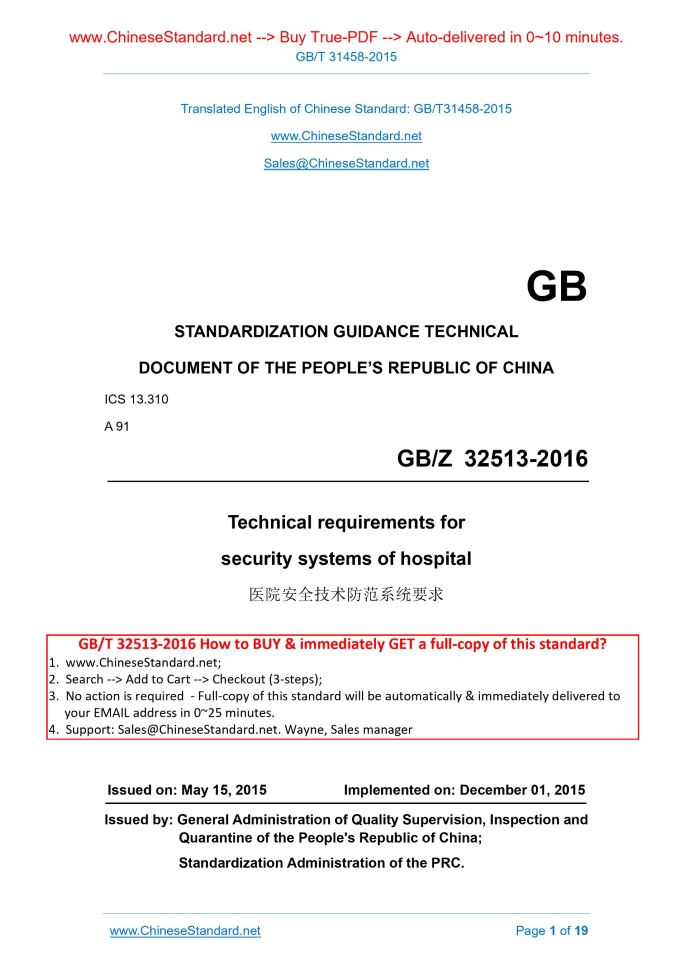 GB/T 31458-2015: Technical requirements for security systems of hospital Delivery: 9 seconds. True-PDF full-copy in English & invoice will be downloaded + auto-delivered via email. See step-by-step procedure Status: Valid