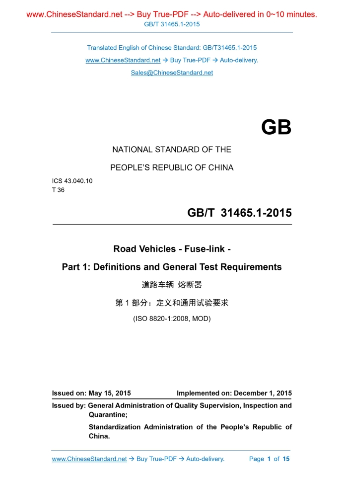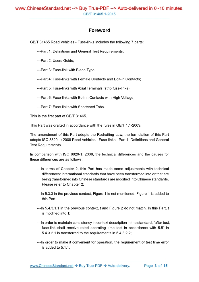 Similar standardsGB/T 31465.1-2015: Road vehicles -- Fuse-link -- Part 1: Definitions and general test requirements---This is an excerpt. Full copy of true-PDF in English version (including equations, symbols, images, flow-chart, tables, and figures etc.), auto-downloaded/delivered in 9 seconds, can be purchased online: https://www.ChineseStandard.net/PDF.aspx/GBT31465.1-2015NATIONAL STANDARD OF THE PEOPLE’S REPUBLIC OF CHINA ICS 43.040.10 T 36 Road Vehicles - Fuse-link - Part 1: Definitions and General Test Requirements (ISO 8820-1:2008, MOD) ISSUED ON: MAY 15, 2015 IMPLEMENTED ON: DECEMBER 1, 2015 Issued by: General Administration of Quality Supervision, Inspection and Quarantine; Standardization Administration of the People’s Republic of China. Table of ContentsForeword ... 3 1 Scope ... 5 2 Normative References ... 5 3 Terms and Definitions ... 6 4 Markings, Labels and Color Codes ... 7 5 Tests and Requirements ... 7 6 Dimensions ... 15ForewordGB/T 31465 Road Vehicles - Fuse-links includes the following 7 parts: ---Part 1: Definitions and General Test Requirements; ---Part 2: Users Guide; ---Part 3: Fuse-link with Blade Type; ---Part 4: Fuse-links with Female Contacts and Bolt-in Contacts; ---Part 5: Fuse-links with Axial Terminals (strip fuse-links); ---Part 6: Fuse-links with Bolt-in Contacts with High Voltage; ---Part 7: Fuse-links with Shortened Tabs. This is the first part of GB/T 31465. This Part was drafted in accordance with the rules in GB/T 1.1-2009. The amendment of this Part adopts the Redrafting Law; the formulation of this Part adopts ISO 8820-1: 2008 Road Vehicles - Fuse-links - Part 1: Definitions and General Test Requirements. In comparison with ISO 8820-1: 2008, the technical differences and the causes for these differences are as follows: ---In terms of Chapter 2, this Part has made some adjustments with technical differences: international standards that have been transformed into or that are being transformed into Chinese standards are modified into Chinese standards. Please refer to Chapter 2; ---In 5.3.3 in the previous context, Figure 1 is not mentioned. Figure 1 is added to this Part. ---In 5.4.3.1.1 in the previous context, t and Figure 2 do not match. In this Part, t is modified into T; ---In order to maintain consistency in context description in the standard, “after test, fuse-link shall receive rated operating time test in accordance with 5.5” in 5.4.3.2.1 is transferred to the requirements in 5.4.3.2.2; ---In order to make it convenient for operation, the requirement of test time error is added to 5.1.1. Road Vehicles - Fuse-link - Part 1: Definitions and General Test Requirements1 ScopeThis Part specifies the terms and general test requirements of fuse link. This Part is applicable to fuse link for road vehicles. This Part is not applicable to accessory sheathing products for vehicle fuse links.2 Normative ReferencesThe following documents are indispensable to the application of this document. In terms of references with a specific date, only versions with a specific date are applicable to this document. In terms of references without a specific date, the latest versions (including all the modification lists) are applicable to this document. GB/T 2423.53 Environmental Testing for Electric and Electronic Products - Part 2: Test Methods - Test Xb: Abrasion of Markings and Letterings Caused by Rubbing of Fingers and Hands (GB/T 2423.53-2005, IEC 60068-2-70: 1995, IDT) GB/T 25085 Road Vehicles - 60 V and 600 V Single-core Cables (GB/T 25085-2010, ISO 6722: 2006, IDT) GB/T 28046.3 Road Vehicles - Environmental Conditions and Testing for Electrical and Electronic Equipment - Part 3: Mechanical Loads (GB/T 28046.3-2011, ISO 16750-3: 2007, MOD) GB/T 28046.5 Road Vehicles - Environmental Conditions and Testing for Electrical and Electronic Equipment - Part 5: Chemical Loads (GB/T 28046.5-2013, ISO 16750-5: 2010, MOD) GB/T 31465.2-2015 Road Vehicles - Fuse-link - Part 2: Users Guide GB/T 31465.3-2015 Road Vehicles - Fuse-link - Part 3: Fuse-link with Blade Type GB/T 31465.4-2015 Road Vehicles - Fuse-link - Part 4: Fuse-links with Female Contacts and Bolt-in Contacts GB/T 31465.5-2015 Road Vehicles - Fuse-link - Part 5: Fuse-links with Axial Terminals NOTE: continuous operating current is lower than the rated current. 3.3 Rated Voltage UR Rated voltage refers to the maximum supply voltage that is applicable to fuse-links. 3.4 Voltage Drop Ud Voltage drop refers to the voltage value which is measured under the stipulated current and at the appointed measuring points. 3.5 Breaking Capacity IB Breaking capacity refers to the current value that fuse-link can normally fuse under stipulated conditions and rated voltage. 3.6 Time Constant Time constant refers to the time that a physical quantity takes to rise from 0 to 1-1/e (for example, 63.2%), and ultimately reach a stable state. Under the stable state, the numerical value is not time t, but 1-e-kt. 3.7 Operating Time Operating time refers to the time, starting from imposing overcurrent, till the current drops to below the appointed value.4 Markings, Labels and Color CodesOn the surface of fuse-links, rated current and voltage shall be clearly and permanently marked. The rated current shall also be represented in the color codes stipulated in other parts of this series of standards. On fuse-link’s insulator, the manufacturer’s name, trademark and code shall be marked.5 Tests and Requirements5.1 Overview 5.1.1 General test conditions If there are no other stipulations, all tests shall be conducted under room temperature If mechanical load test is requested, the demand-side and the supply-side shall negotiate and select test items of GB/T 28046.3. 5.4.2.2 Requirements After the mechanical load test, fuse-link shall comply with the stipulated rated operating time provided in corresponding parts in this series of standards. 5.4.3 Climate load 5.4.3.1 Temperature/humidity cycle 5.4.3.1.1 Test Fuse-link shall r