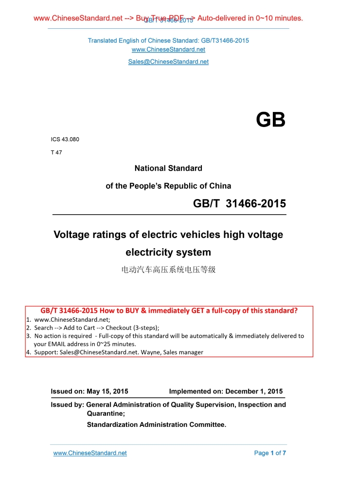 GB/T 31466-2015: Voltage ratings of electric vehicles high voltage electricity system Delivery: 9 seconds. True-PDF full-copy in English & invoice will be downloaded + auto-delivered via email. See step-by-step procedure Status: Valid