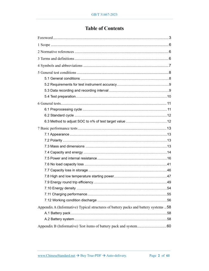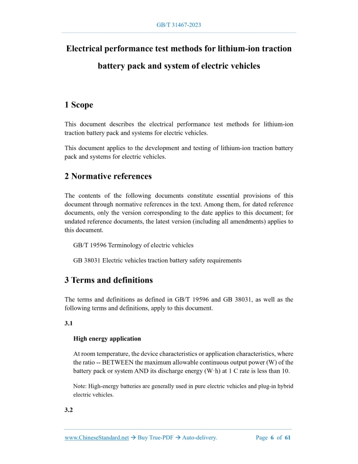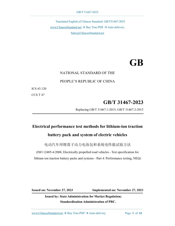 Similar standardsGB/T 31467-2023: Electrical performance test methods for Iithium-ion traction battery pack and system of electric vehicles---This is an excerpt. Full copy of true-PDF in English version (including equations, symbols, images, flow-chart, tables, and figures etc.), auto-downloaded/delivered in 9 seconds, can be purchased online: https://www.ChineseStandard.net/PDF.aspx/GBT31467-2023 GB NATIONAL STANDARD OF THE PEOPLE’S REPUBLIC OF CHINA ICS 43.120 CCS T 47 Replacing GB/T 31467.1-2015, GB/T 31467.2-2015 Electrical performance test methods for lithium-ion traction battery pack and system of electric vehicles (ISO 12405-4.2008, Electrically propelled road vehicles - Test specification for lithium-ion traction battery packs and systems - Part 4.Performance testing, NEQ) Issued on: NOVEMBER 27, 2023 Implemented on: NOVEMBER 27, 2023 Issued by. State Administration for Market Regulation; Standardization Administration of PRC. Table of ContentsForeword... 3 1 Scope... 6 2 Normative references... 6 3 Terms and definitions... 6 4 Symbols and abbreviations... 7 5 General test conditions... 8 5.1 General conditions... 8 5.2 Requirements for test instrument accuracy... 9 5.3 Data recording and recording interval... 9 5.4 Test preparation... 10 6 General tests... 11 6.1 Preprocessing cycle... 11 6.2 Standard cycle... 12 6.3 Method to adjust SOC to n% of test target value... 12 7 Basic performance tests... 13 7.1 Appearance... 13 7.2 Polarity... 13 7.3 Mass and dimensions... 13 7.4 Capacity and energy... 14 7.5 Power and internal resistance... 16 7.6 No load capacity loss... 41 7.7 Capacity loss in storage... 46 7.8 High and low temperature starting power... 47 7.9 Energy round trip efficiency... 49 7.10 Energy density... 54 7.11 Charging performance... 55 7.12 Working condition discharge... 56 Appendix A (Informative) Typical structures of battery packs and battery systems.. 58 A.1 Battery pack... 58 A.2 Battery system... 58 Appendix B (Informative) Test items of battery pack and system... 60 Electrical performance test methods for lithium-ion traction battery pack and system of electric vehicles1 ScopeThis document describes the electrical performance test methods for lithium-ion traction battery pack and systems for electric vehicles. This document applies to the development and testing of lithium-ion traction battery pack and systems for electric vehicles.2 Normative referencesThe contents of the following documents constitute essential provisions of this document through normative references in the text. Among them, for dated reference documents, only the version corresponding to the date applies to this document; for undated reference documents, the latest version (including all amendments) applies to this document. GB/T 19596 Terminology of electric vehicles GB 38031 Electric vehicles traction battery safety requirements3 Terms and definitionsThe terms and definitions as defined in GB/T 19596 and GB 38031, as well as the following terms and definitions, apply to this document. 3.1 High energy application At room temperature, the device characteristics or application characteristics, where the ratio -- BETWEEN the maximum allowable continuous output power (W) of the battery pack or system AND its discharge energy (W·h) at 1 C rate is less than 10. Note. High-energy batteries are generally used in pure electric vehicles and plug-in hybrid electric vehicles. 3.2 High power application At room temperature, the device characteristics or application characteristics, where the ratio -- BETWEEN the maximum allowable continuous output power (W) of the battery pack or system AND its discharge energy (W·h) at 1 C rate is more than or equal to 10. Note. High-power batteries are generally used in hybrid electric vehicles. 3.3 Energy density The electrical energy released per unit mass of a battery pack or system. Note. The unit of energy density is Watt-hour per kilogram (W·h/kg). 3.4 Energy round trip efficiency The ratio -- of the total discharged energy TO the total charged energy of a battery pack or system during testing. Note. The unit of total charging energy and total discharging energy is watt hour (W·h).4 Symbols and abbreviationsThe following symbols and abbreviations apply to this document. BCU. Battery Control Unit FS. Full Scale RT. Room Temperature SOC. State-of-Charge Imax (T). The maximum allowable continuous discharge current under a certain test environment temperature T I'max (SOC, T, t). The maximum allowable discharge current under a certain SOC, test environment temperature T, pulse duration t n C. Current rate, whose value is equal to n times of 1h discharge capacity η. Efficiency5 General test conditions5.1 General conditions 5.1.1 Unless otherwise specified, the test is conducted at room temperature (RT) of 25 °C ± 2 °C, relative humidity of 10% ~ 90%, atmospheric pressure of 86 kPa ~ 106 kPa. 5.1.2 The test sample handover needs to include the necessary operating documents, as well as the interface components required to connect to the test equipment, such as connectors, plugs, including cooling interfaces. See Appendix A for the typical structure of the battery pack and battery system. The manufacturer needs to provide safe operating limits for the battery pack or system, to ensure the safety of the entire test. 5.1.3 When the test target environment temperature changes, the test object shall complete the environmental adaptation process before conducting the test. if there is no active cooling within 1 hour and the difference between the battery cell temperature and the target temperature does not exceed 2 °C, the environment adaptation process is completed. 5.1.4 If the battery pack or system is not suitable for certain tests due to some reasons (such as size or mass), the subsystem of the battery pack or system can be used as the test object to conduct all or part of the test, after agreement between the supplier and the buyer. The subsystem used as t