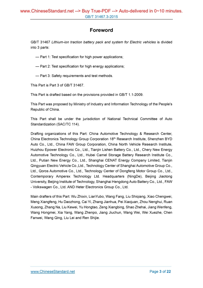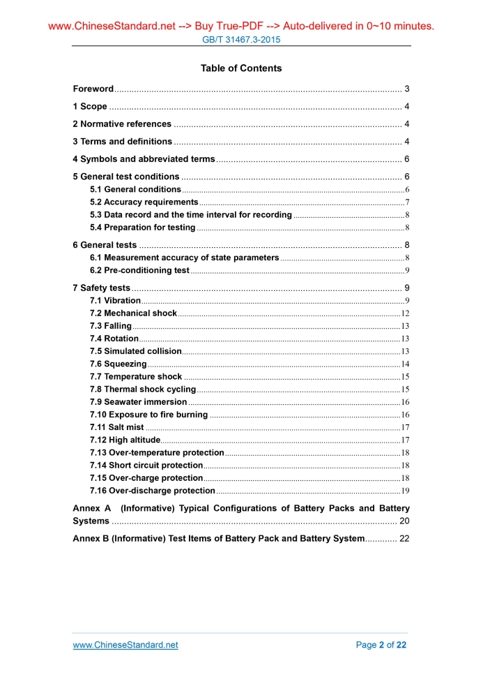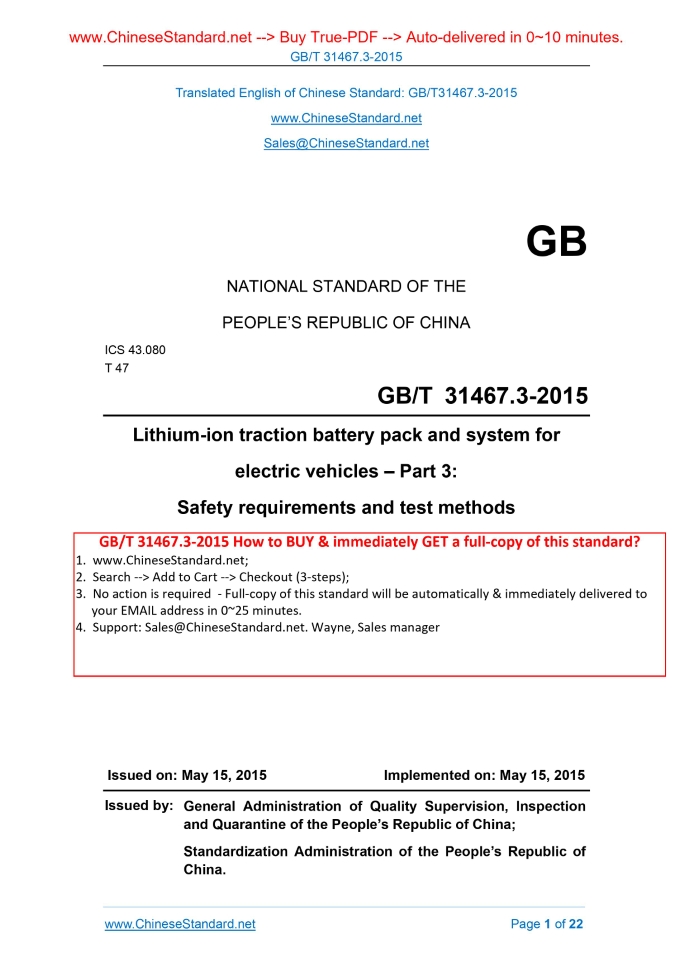 Similar standardsGB/T 31467.3-2015: [Including 2017-XG1 Modification List] Lithium-ion traction battery pack and system for electric vehicles -- Part 3: Safety requirements and test methods---This is an excerpt. Full copy of true-PDF in English version (including equations, symbols, images, flow-chart, tables, and figures etc.), auto-downloaded/delivered in 9 seconds, can be purchased online: https://www.ChineseStandard.net/PDF.aspx/GBT31467.3-2015 GB NATIONAL STANDARD OF THE PEOPLE’S REPUBLIC OF CHINA ICS 43.080 T 47 Lithium-ion traction battery pack and system for electric vehicles – Part 3.Safety requirements and test methods (ISO 12405-3.2014, Electrically propelled road vehicles – Test specification for lithium-ion traction battery packs and systems – Part 3.Safety performance requirements, NEQ) [Including 2017 Modification List] Issued on: MAY 15, 2015 Implemented on: MAY 15, 2015 Issued by. General Administration of Quality Supervision, Inspection and Quarantine of the People’s Republic of China; Standardization Administration of the People’s Republic of China. Table of ContentsForeword... 3 1 Scope... 4 2 Normative references... 4 3 Terms and definitions... 4 4 Symbols and abbreviated terms... 6 5 General test conditions... 6 6 General tests... 8 7 Safety tests... 9 Annex A (Informative) Typical Configurations of Battery Packs and Battery Systems ... 22 Annex B (Informative) Test Items of Battery Pack and Battery System... 24 No. 1 Modification list of GB/T 31467.3-2015 “Lithium-ion traction battery pack and system for electric vehicles - Part 3.Safety requirements and test methods”... 261 ScopeThis Part of GB/T 31467 specifies test procedures and safety requirements for lithium-ion battery packs and systems to be used in electrically propelled vehicles. This Part of GB/T 31467 is applicable to lithium-ion battery packs and systems installed in electrically propelled vehicles. For Ni-MH battery packs or systems, this standard can be served as reference.2 Normative referencesThe following documents are indispensable for application of this document. For the dated documents so quoted, only the dated versions apply to this document. For the undated documents so quoted, the latest versions (including all modification sheets) apply to this document. GB 4208 Degrees of protection provided by enclosure (IP code) GB/T 18384.1 Electric vehicles - Safety specification - Part 1.On-board energy storage GB/T 18384.3 Electric vehicles-Safety specification - Part 3.Protection of persons against electric hazards GB/T 19596 Terminology of electric vehicles GB/T 28046.1-2011 Road vehicles - Environmental conditions and testing for electrical and electronic equipment - Part 1.General GB/T 31467.1-2015 Lithium-ion traction battery pack and system for Electric vehicles - Part 1.Test specification for high power applications GB/T 31467.2-2015 Lithium-ion traction battery pack and system for electric vehicles - Part 2.Test specification for high energy applications3 Terms and definitionsFor the purpose of this document, the terms and definitions given in GB/T 19596 AND the following apply. 3.1 battery electronics Electronic device that collects and possibly monitors thermal or electric data of cells or cell assemblies. It may contain electronics for cell balancing, if necessary. Note. The battery electronics can include a cell controller. The functionality of cell balancing can be controlled by the cell electronics or it can be controlled by the BCU. 3.2 battery control unit; BCU Electronic device that controls, manage, detects or calculates electric and thermal functions of the battery system that provides communication between the battery system and other vehicle controllers. 3.3 rated capacity Total number of ampere-hours that can be withdrawn from battery pack or system for a specified set of test conditions. 3.4 battery pack Energy storage device that includes battery pack(s), battery management modules (BCU excluded), battery containers and accessories. It includes the units which can obtain and output power from external systems. 3.5 battery system Energy storage device that includes one or more of battery packs or accessories (management system, high voltage circuit, low voltage circuit, heat management devices and mechanical assemblies) 3.6 high voltage A voltage with the maximum working voltage greater than 30 V a.c. (rms) and lower than or equal to 1000 V a.c. (rms), or greater than 60 V d.c. and lower than or equal to 1500 V d.c. 3.7 low voltage A voltage with the maximum working voltage greater than 30 V a.c. (rms) or not greater than 60 V d.c.4 Symbols and abbreviated termsFor the purpose of this document, the following symbols and abbreviated terms apply. nC. Current multiple-rate. It is equal to n time(s) of discharge capacity for 1h (unit. A); SOC. State of charge under room temperature (state of charge).5 General test conditions5.1 General conditions 5.1.1 Unless otherwise specified, the test temperature is 25°C±5°C and the test humidity is 15%~90%. The room temperature referred in this standard is 25°C±2°C. 5.1.2 A battery pack or system shall fulfill the relevant requirements in GB/T 18384.1 and GB/T 18384.3. 5.1.3 The necessary documentation for operation and needed interfaces connection to the test equipment (i.e. connectors, plug including cooling) shall be delivered together with the battery pack or system. The typical configuration of battery pack or system is shown in Annex A. The manufacturers shall prescribe the working limits of battery pack or system to ensure the safety of overall test process. 5.1.4 The protection level of battery pack and system shall fulfill the relevant requirements given in GB 4208. 5.1.5 As to the battery pack or system, the insulating resistance test shall be performed before starting all the tests. The test positions shall be at the positive electrode and casing OR the negative electrode and casing. The insulating resistance 
