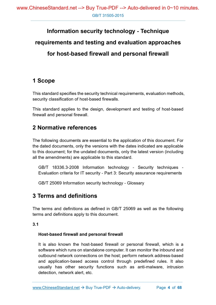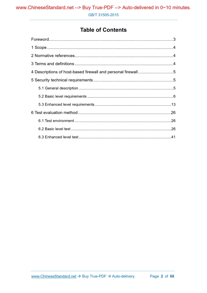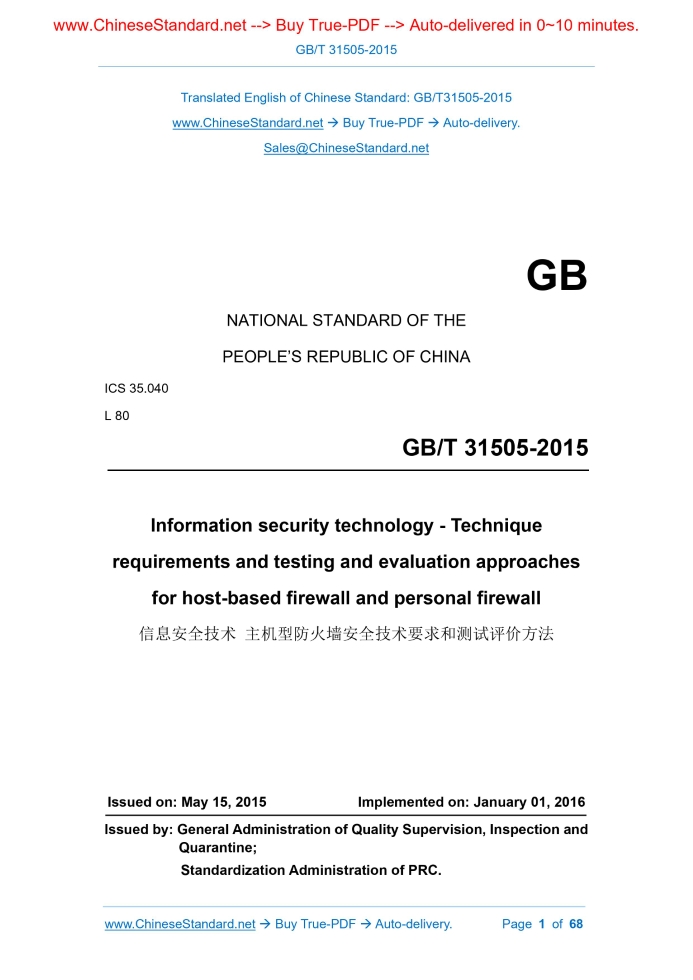 Similar standardsGB/T 31505-2015: [Replaced by GB/T 20281-2020] Information security technology -- Technique requirements and testing and evaluation approaches for host-based firewall and personal firewall---This is an excerpt. Full copy of true-PDF in English version (including equations, symbols, images, flow-chart, tables, and figures etc.), auto-downloaded/delivered in 9 seconds, can be purchased online: https://www.ChineseStandard.net/PDF.aspx/GBT31505-2015 GB NATIONAL STANDARD OF THE PEOPLE’S REPUBLIC OF CHINA ICS 35.040 L 80 Information security technology - Technique requirements and testing and evaluation approaches for host-based firewall and personal firewall Issued on. MAY 15, 2015 Implemented on. JANUARY 01, 2016 Issued by. General Administration of Quality Supervision, Inspection and Quarantine; Standardization Administration of PRC. Table of ContentsForeword... 3 1 Scope... 4 2 Normative references... 4 3 Terms and definitions... 4 4 Descriptions of host-based firewall and personal firewall... 5 5 Security technical requirements... 5 5.1 General description... 5 5.2 Basic level requirements... 6 5.3 Enhanced level requirements... 13 6 Test evaluation method... 26 6.1 Test environment... 26 6.2 Basic level test... 26 6.3 Enhanced level test... 41ForewordThis standard was drafted in accordance with the rules issued by GB/T 1.1- 2009. This standard was proposed by and shall be under the jurisdiction of the National Information Security Standardization Technical Committee (SAC/TC 260). Drafting organizations of this standard. Computer Information System Security Product Quality Supervision and Inspection Center of the Ministry of Public Security, China Electronic Technology Standardization Research Institute, Beijing Venus Technology Co., Ltd., the Third Research Institute of the Ministry of Public Security. The main drafters of this standard. Lu Zhen, Gu Jian, Wei Xiang, Yu You, Deng Qi, Luo Fengying, Xu Yuna, Zhang Xiaoxiao, Wu Qicong. Information security technology - Technique requirements and testing and evaluation approaches for host-based firewall and personal firewall1 ScopeThis standard specifies the security technical requirements, evaluation methods, security classification of host-based firewalls. This standard applies to the design, development and testing of host-based firewall and personal firewall.2 Normative referencesThe following documents are essential to the application of this document. For the dated documents, only the versions with the dates indicated are applicable to this document; for the undated documents, only the latest version (including all the amendments) are applicable to this standard. GB/T 18336.3-2008 Information technology - Security techniques - Evaluation criteria for IT security - Part 3.Security assurance requirements GB/T 25069 Information security technology - Glossary3 Terms and definitionsThe terms and definitions as defined in GB/T 25069 as well as the following terms and definitions apply to this document. 3.1 Host-based firewall and personal firewall It is also known the host-based firewall or personal firewall, which is a software which runs on standalone computer. 3.2 Security policy It refers to provisions and policies related to management and protection of security domain routines.4 Descriptions of host-based firewall and personal firewallThe host-based firewall and personal firewall is installed in the form of software on the end user's computer (including personal computers and servers), to prevent threats from the outside to the inside and from the inside to the outside. The host-based firewall and personal firewall can not only monitor and control the network-level data flow, but also monitor and control the program, to compensate the insufficiency of traditional defense methods such as gateway firewall and antivirus software. Generally, the host-based firewall and personal firewall on the server can also perform unified control over all nodes; implement unified security policies and responses.5 Security technical requirements5.1 General description 5.1.1 Classification of security technical requirements This standard divides the security technical requirements of host-based firewall and personal firewall into two major categories. 5.1.2 Security level This standard divides the level of security function requirements according to the strength of the host-based firewall security function; divides the level of security assurance requirements according to GB/T 18336.3-2008. 5.2 Basic level requirements 5.2.1 Security function requirements 5.2.1.2 Security policy revision Products shall provide standardized security policies, which can be revised by users. 5.2.1.3 Application network access control The security function of the product shall be able to control the permission of each application on the host to use the network; the control of the application's access to the network shall include the following three methods. 5.2.1.5 Identity authentication 5.2.1.5.1 Basic authentication Before performing any functions related to the administrator, the product shall authenticate the user's identity. 5.2.1.5.2 Authentication failure handling The product shall provide certain authentication failure handling measures, to prevent violent code cracking. The product shall have a security audit function; the specific technical requirements are as follows. 5.2.2 Security assurance requirements 5.2.2.1 Configuration management 5.2.2.1.1 Version number Developers shall provide unique identifiers for different versions of the product. 5.2.2.3 Development 5.2.2.3.1 Description of informal function specification The developer shall provide a functional specification, which shall meet the following requirements. 5.2.2.3.3 Informal correspondence verification The developer shall provide a correspondence analysis between all adjacent pairs of product security function representations. For each adjacent pair represented by the product security