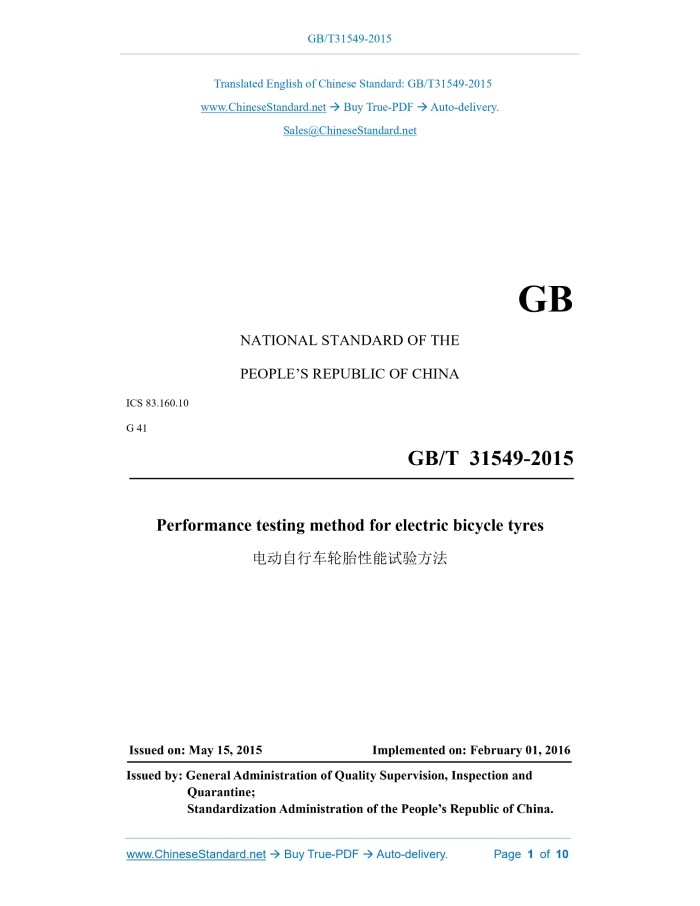 GB/T 31549-2015: Performance testing method for electric bicycle tyres Delivery: 9 seconds. True-PDF full-copy in English & invoice will be downloaded + auto-delivered via email. See step-by-step procedure Status: Valid