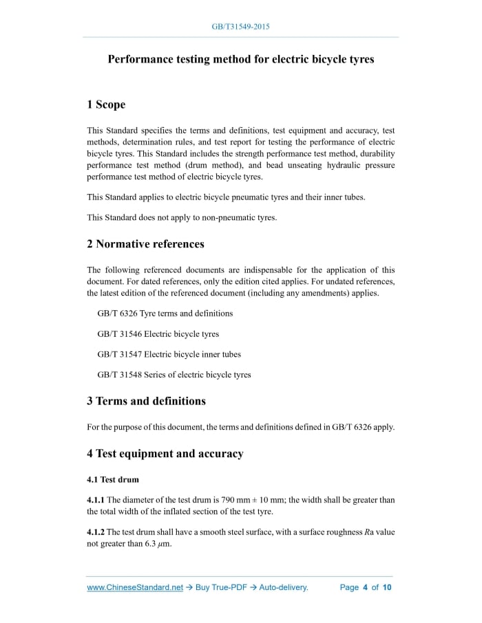 Similar standardsGB/T 31549-2015: Performance testing method for electric bicycle tyres---This is an excerpt. Full copy of true-PDF in English version (including equations, symbols, images, flow-chart, tables, and figures etc.), auto-downloaded/delivered in 9 seconds, can be purchased online: https://www.ChineseStandard.net/PDF.aspx/GBT31549-2015GB NATIONAL STANDARD OF THE PEOPLE’S REPUBLIC OF CHINA ICS 83.160.10 G 41 GB/T 31549-2015 Performance testing method for electric bicycle tyres ISSUED ON: MAY 15, 2015 IMPLEMENTED ON: FEBRUARY 01, 2016 Issued by: General Administration of Quality Supervision, Inspection and Quarantine; Standardization Administration of the People’s Republic of China. Table of ContentsForeword ... 3 1 Scope ... 4 2 Normative references ... 4 3 Terms and definitions ... 4 4 Test equipment and accuracy ... 4 5 Test methods ... 5 6 Determination rules ... 8 7 Test report ... 9 Performance testing method for electric bicycle tyres1 ScopeThis Standard specifies the terms and definitions, test equipment and accuracy, test methods, determination rules, and test report for testing the performance of electric bicycle tyres. This Standard includes the strength performance test method, durability performance test method (drum method), and bead unseating hydraulic pressure performance test method of electric bicycle tyres. This Standard applies to electric bicycle pneumatic tyres and their inner tubes. This Standard does not apply to non-pneumatic tyres.2 Normative referencesThe following referenced documents are indispensable for the application of this document. For dated references, only the edition cited applies. For undated references, the latest edition of the referenced document (including any amendments) applies. GB/T 6326 Tyre terms and definitions GB/T 31546 Electric bicycle tyres GB/T 31547 Electric bicycle inner tubes GB/T 31548 Series of electric bicycle tyres3 Terms and definitionsFor the purpose of this document, the terms and definitions defined in GB/T 6326 apply.4 Test equipment and accuracy4.1 Test drum 4.1.1 The diameter of the test drum is 790 mm ± 10 mm; the width shall be greater than the total width of the inflated section of the test tyre. 4.1.2 The test drum shall have a smooth steel surface, with a surface roughness Ra value not greater than 6.3 μm. 4.1.3 The loading capacity of the loading device shall meet the test requirements, and its accuracy is ±2 % of the full scale. 4.1.4 The speed capability of the test drum shall meet the test requirements, and its accuracy is ±2 km/h. 4.1.5 Obstacles: rectangular iron blocks with a surface roughness Ra value not greater than 6.3 μm, width 10 mm ± 0.1 mm, height 5 mm ± 0.1 mm, angular curvature radius 1.0 mm ± 0.05 mm, quantity 2. 4.1.6 The obstacles are installed on the outer circumference of the drum at equidistant and symmetrical intervals, parallel to the axis of the drum, and the length is equal to the width of the drum. 4.2 Strength testing machine 4.2.1 The testing machine shall be equipped with a cylindrical steel rod of sufficient length, one end of which is a hemispherical indenter with a diameter of 8.0 mm ± 0.1 mm. 4.2.2 The loading capacity of the loading device of the testing machine shall not be greater than 2000 kg. 4.2.3 The display accuracy of displacement and pressure of the indenter is ±1 % of the full scale. The speed accuracy of movement of the indenter is ±2.5 mm/min. 4.3 Pressure gauge The pressure gauge display accuracy is ±2 % of the full scale. 4.4 Conduit and hydraulic pressure source 4.4.1 The conduit is a pressure-resistant pipe with an inner diameter of more than 3 mm and a length of less than 4 m. 4.4.2 The system hydraulic pressure shall remain stable. 4.5 Test rim 4.5.1 The test rim adopts the measurement rim specified in GB/T 31548. 4.5.2 Hydraulic pressure test rims may also use designated rims according to the agreement between the supply and demand parties.5 Test methods5.1 Strength test 5.1.2.2 If the indenter touches the rim, the tyre is not punctured through, and the minimum damage energy value is not reached, this point shall be regarded as reaching the minimum damage energy. 5.1.2.3 The damage energy of a tyre is the arithmetic mean of the damage energy measured at each test point. 5.2 Durability test 5.2.1 Test conditions 5.2.1.1 The appearance quality of the test tyre shall comply with the provisions of GB/T 31546 and GB/T 31547. 5.2.1.2 Install the test tyre on the measurement rim specified in GB/T 31548, and inflate it with the air pressure specified in GB/T 31548. 5.2.1.3 Park the test tyre and rim assembly at a laboratory temperature of 25 ℃ ± 10 ℃ for at least 3 hours. 5.2.1.4 The test load shall be kept stable throughout the test process. 5.2.1.5 During the entire test process, the test temperature shall be maintained at 25 ℃ ± 10 ℃, and the temperature measurement shall be performed at a position approximately 1 m away from the test tyre. 5.2.2 Test procedures 5.2.2.1 Adjust the tyre pressure after parking to the air pressure specified in GB/T 31548. 5.2.2.2 Install the test tyre and rim assembly prepared according to the above conditions on the test shaft so that it is perpendicular to the outer surface of the test drum, and apply the load specified in GB/T 31548. 5.2.2.3 Start the drum to drive the tyre to rotate, and reach the test speed of 40 km/h ± 2 km/h within 5 minutes. 5.2.2.4 After the test, measure the tyre pressure immediately and check the appearance of the tyre. 5.3 Bead unseating hydraulic pressure test 5.3.1 Test conditions 5.3.1.1 The appearance quality of the test tyre shall comply with the provisions of GB/T 31546 and GB/T 31547. 5.3.1.2 Install the test tyre on the test rim specified in 4.5, inflate it with the air pressure specified in GB/T 31548, and park it for at least 3 hours at a laboratory temperature of 25 °C ± 10 °C. 5.3.2 Test procedures 5.3.2.1 Install the inflated and parked test tyre and rim a