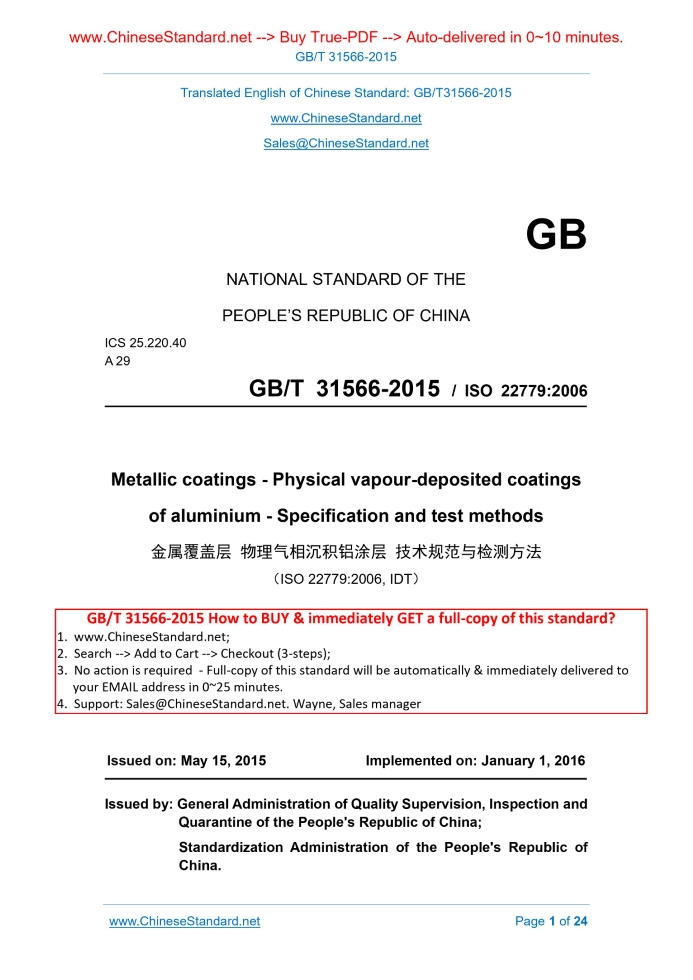GB/T 31566-2015: Metallic coatings -- Physical vapour-deposited coatings of aluminium -- Specification and test methods Delivery: 9 seconds. True-PDF full-copy in English & invoice will be downloaded + auto-delivered via email. See step-by-step procedure Status: Valid