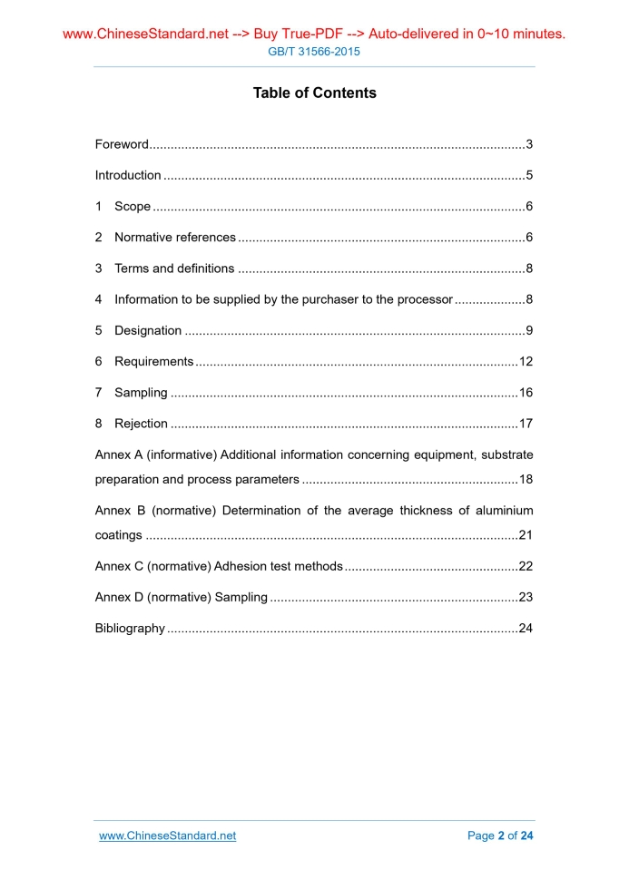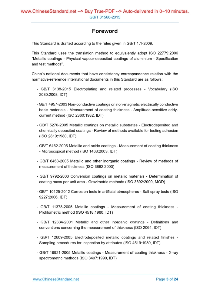 Similar standardsGB/T 31566-2015: Metallic coatings -- Physical vapour-deposited coatings of aluminium -- Specification and test methods---This is an excerpt. Full copy of true-PDF in English version (including equations, symbols, images, flow-chart, tables, and figures etc.), auto-downloaded/delivered in 9 seconds, can be purchased online: https://www.ChineseStandard.net/PDF.aspx/GBT31566-2015 GB NATIONAL STANDARD OF THE PEOPLE’S REPUBLIC OF CHINA ICS 25.220.40 A 29 GB/T 31566-2015 / ISO 22779.2006 Metallic coatings - Physical vapour-deposited coatings of aluminium - Specification and test methods (ISO 22779.2006, IDT) Issued on: MAY 15, 2015 Implemented on: JANUARY 1, 2016 Issued by. General Administration of Quality Supervision, Inspection and Quarantine of the People's Republic of China; Standardization Administration of the People's Republic of China. Table of ContentsForeword ... 3 Introduction ... 5 1 Scope ... 6 2 Normative references ... 6 3 Terms and definitions ... 8 4 Information to be supplied by the purchaser to the processor ... 8 5 Designation ... 9 6 Requirements ... 12 7 Sampling ... 16 8 Rejection ... 17 Annex A (informative) Additional information concerning equipment, substrate preparation and process parameters ... 18 Annex B (normative) Determination of the average thickness of aluminium coatings ... 21 Annex C (normative) Adhesion test methods ... 22 Annex D (normative) Sampling ... 23 Bibliography ... 24ForewordThis Standard is drafted according to the rules given in GB/T 1.1-2009. This Standard uses the translation method to equivalently adopt ISO 22779.2006 “Metallic coatings - Physical vapour-deposited coatings of aluminium - Specification and test methods”. China’s national documents that have consistency correspondence relation with the normative-reference international documents in this Standard are as follows. - GB/T 3138-2015 Electroplating and related processes - Vocabulary (ISO 2080.2008, IDT) - GB/T 4957-2003 Non-conductive coatings on non-magnetic electrically conductive basis materials - Measurement of coating thickness - Amplitude-sensitive eddy- current method (ISO 2360.1982, IDT) - GB/T 5270-2005 Metallic coatings on metallic substrates - Electrodeposited and chemically deposited coatings - Review of methods available for testing adhesion (ISO 2819.1980, IDT) - GB/T 6462-2005 Metallic and oxide coatings - Measurement of coating thickness - Microscopical method (ISO 1463.2003, IDT) - GB/T 6463-2005 Metallic and other inorganic coatings - Review of methods of measurement of thickness (ISO 3882.2003) - GB/T 9792-2003 Conversion coatings on metallic materials - Determination of coating mass per unit area - Gravimetric methods (ISO 3892.2000, MOD) - GB/T 10125-2012 Corrosion tests in artificial atmospheres - Salt spray tests (ISO 9227.2006, IDT) - GB/T 11378-2005 Metallic coatings - Measurement of coating thickness - Profilometric method (ISO 4518.1980, IDT) - GB/T 12334-2001 Metallic and other inorganic coatings - Definitions and conventions concerning the measurement of thickness (ISO 2064, IDT) - GB/T 12609-2005 Electrodeposited metallic coatings and related finishes - Sampling procedures for inspection by attributes (ISO 4519.1980, IDT) - GB/T 16921-2005 Metallic coatings - Measurement of coating thickness - X-ray spectrometric methods (ISO 3497.1990, IDT) - GB/T 19349-2012 Metallic and other inorganic coatings - Pretreatments of iron or steel to reduce the risk of hydrogen embrittlement (ISO 9587.2007, IDT) - GB/T 19350-2012 Metallic and other inorganic coatings - Post-coating treatments of iron or steel to reduce the risk of hydrogen embrittlement (ISO 9588.2007, IDT) - GB/T 19822-2005 Specification for hard anodic oxidation coatings on aluminium and its alloys (ISO 10074.1994, IDT) - GB/T 20015-2005 Metallic and other inorganic coatings - Automated controlled shot-peening of metallic articles prior to nickel, autocatalytic nickel or chromium plating, or as a final finish (ISO 12686.1999, IDT) - GB/T 20018-2005 Metallic and non-metallic coatings - Measurement of thickness - Beta backscatter method (ISO 3543.2000, IDT) - GB/T 20631.2-2006 Specifications for pressure-sensitive adhesive tapes for electrical purposes - Part 2. Methods of test (IEC 60454.1994, IDT) - GB/T 31563-2015 Metallic coatings - Measurement of coating thickness - Scanning electron microscope method (ISO 9220.1988, MOD) This Standard is proposed by China Machinery Industry Federation. This Standard shall be under the jurisdiction of National Technical Committee on Metallic and Nonmetallic Coatings of Standardization Administration of China (SAC/TC 57). Main drafting organizations of this Standard. Lanzhou Institute of Chemical Physics of Chinese Academy of Sciences, Naval University of Engineering of Chinese People’s Liberation Army, Chongqing Institute of Measurement and Quality Testing, Wuhan Material Protection Institute, Dongguan Yi’an Technology Co., Ltd., Shenzhen Fasite Precision Technology Co., Ltd. Main drafters of this Standard. Gao Xiaoming, Jiang Dong, Weng Lijun, Chen Debin, Yu Xiang, Gao Zhengyuan, Jia Jianxin, Li Weirong and Zhang Jun. Metallic coatings - Physical vapour-deposited coatings of aluminium - Specification and test methods1 ScopeThis Standard specifies requirements for aluminium coatings applied by physical vapour deposition techniques to mild steels, low-alloy steels, high-strength steels, corrosion-resisting steels, aluminium alloys, titanium alloys and other materials, as appropriate. Physical vapour-deposited coatings of aluminium are not suitable for steels having tensile strengths greater than 1 400 MPa, because of the possibility of hydrogen embrittlement due to corrosion in service or storage, or as a result of excessive cathodic protection. WARNING. The use of this Standard may involve hazardous materials, operations and equipment. This Standard does not address all the safety problems associated with its use. It is the responsibil