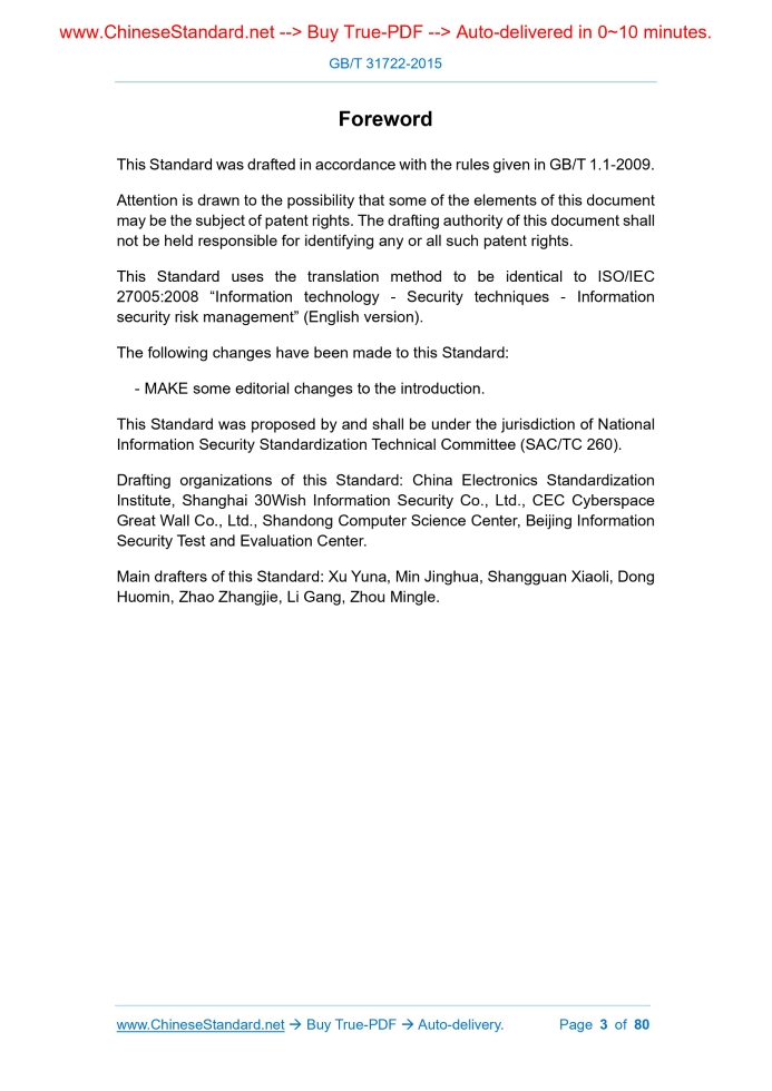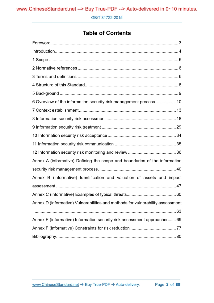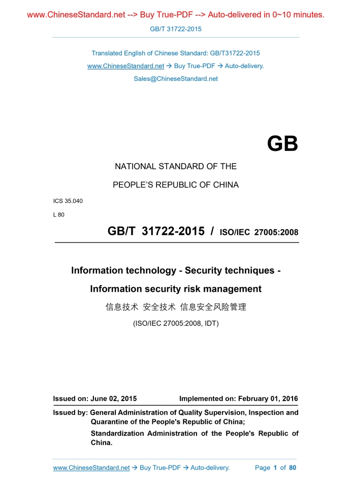 Similar standardsGB/T 31722-2015: Information technology -- Security techniques -- Information security risk management---This is an excerpt. Full copy of true-PDF in English version (including equations, symbols, images, flow-chart, tables, and figures etc.), auto-downloaded/delivered in 9 seconds, can be purchased online: https://www.ChineseStandard.net/PDF.aspx/GBT31722-2015 NATIONAL STANDARD OF THE PEOPLE’S REPUBLIC OF CHINA ICS 35.040 L 80 GB/T 31722-2015 / ISO/IEC 27005.2008 Information technology - Security techniques - Information security risk management (ISO/IEC 27005.2008, IDT) Issued on. JUNE 02, 2015 Implemented on. FEBRUARY 01, 2016 Issued by. General Administration of Quality Supervision, Inspection and Quarantine of the People's Republic of China; Standardization Administration of the People's Republic of China. Table of ContentsForeword... 3 Introduction... 4 1 Scope... 6 2 Normative references... 6 3 Terms and definitions... 6 4 Structure of this Standard... 8 5 Background... 9 6 Overview of the information security risk management process... 10 7 Context establishment... 13 8 Information security risk assessment... 18 9 Information security risk treatment... 29 10 Information security risk acceptance... 34 11 Information security risk communication... 35 12 Information security risk monitoring and review... 36 Annex A (informative) Defining the scope and boundaries of the information security risk management process... 40 Annex B (informative) Identification and valuation of assets and impact assessment... 47 Annex C (informative) Examples of typical threats... 60 Annex D (informative) Vulnerabilities and methods for vulnerability assessment ... 63 Annex E (informative) Information security risk assessment approaches... 69 Annex F (informative) Constraints for risk reduction... 77 Bibliography... 80ForewordThis Standard was drafted in accordance with the rules given in GB/T 1.1-2009. Attention is drawn to the possibility that some of the elements of this document may be the subject of patent rights. The drafting authority of this document shall not be held responsible for identifying any or all such patent rights. This Standard uses the translation method to be identical to ISO/IEC 27005.2008 “Information technology - Security techniques - Information security risk management” (English version). The following changes have been made to this Standard. - MAKE some editorial changes to the introduction. This Standard was proposed by and shall be under the jurisdiction of National Information Security Standardization Technical Committee (SAC/TC 260). Drafting organizations of this Standard. China Electronics Standardization Institute, Shanghai 30Wish Information Security Co., Ltd., CEC Cyberspace Great Wall Co., Ltd., Shandong Computer Science Center, Beijing Information Security Test and Evaluation Center. Main drafters of this Standard. Xu Yuna, Min Jinghua, Shangguan Xiaoli, Dong Huomin, Zhao Zhangjie, Li Gang, Zhou Mingle.1 ScopeThis Standard provides guidelines for information security risk management. This Standard supports the general concepts specified in GB/T 22080 and is designed to assist the satisfactory implementation of information security based on a risk management approach.2 Normative referencesThe following referenced documents are indispensable for the application of this document. For dated references, only the edition cited applies. For undated references, the latest edition of the referenced document (including any amendments) applies. GB/T 22080-2008 Information technology - Security techniques - Information security management systems - Requirements (ISO/IEC 27001.2005, IDT)3 Terms and definitionsFor the purposes of this document, the terms and definitions given in GB/T 22080-2008, GB/T 22081-2008 and the following apply. Exchange or sharing of information about risk between the decision-maker and other stakeholders.4 Structure of this StandardThis Standard contains the description of the information security risk management process and its activities. Some of this guidance may not be suitable in all cases and so other ways of performing the action may be more appropriate. Output. Identifies any information derived after performing the activity.5 BackgroundThe information security risk management process can be applied to the organization as a whole, any discrete part of the organization (e.g. a department, a physical location, a service), any information system, existing or planned or particular aspects of control (e.g. business continuity planning).6 Overview of the information security risk management processThe context is established first. Then a risk assessment is conducted. If this provides sufficient information to effectively determine the actions required to modify the risks to an acceptable level then the task is complete and the risk treatment follows.7 Context establishmentDepending on the scope and objectives of the risk management, different approaches can be applied. The approach might also be different for each iteration.8 Information security risk assessmentIt is up to the organization to select its own approach to risk assessment based on the objectives and the aim of the risk assessment. Input. Information on threats obtained from incident reviewing, asset owners, users and other sources, including external threat catalogues.9 Information security risk treatmentThere are four options available for risk treatment. risk reduction (see 9.2), risk retention (see 9.3), risk avoidance (see 9.4) and risk transfer (see 9.5). Action. The activity or condition that gives rise to the particular risk should be avoided.10 Information security risk acceptanceRisk treatment plans should describe how assessed risks are to be treated to meet risk acceptance criteria (see 7.2 - Risk acceptance criteria). It is important for responsible managers to review and approve proposed risk treatment plans and resulting residual risks, and record any co