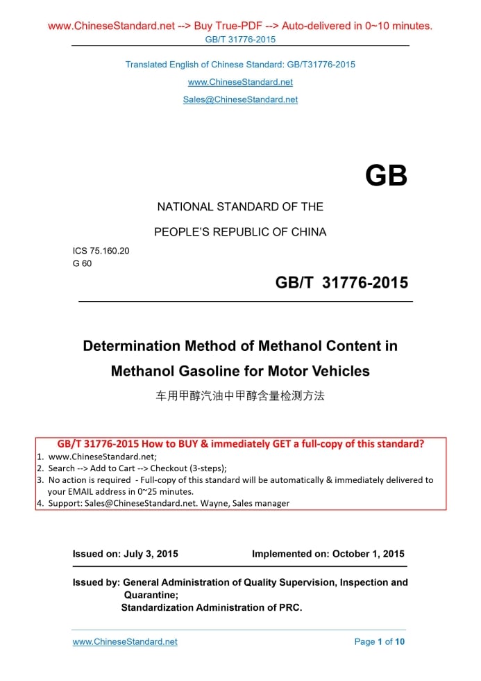 GB/T 31776-2015: Determination Method of Methanol Content in Methanol Gasoline for Motor Vehicles Delivery: 9 seconds. True-PDF full-copy in English & invoice will be downloaded + auto-delivered via email. See step-by-step procedure Status: Valid