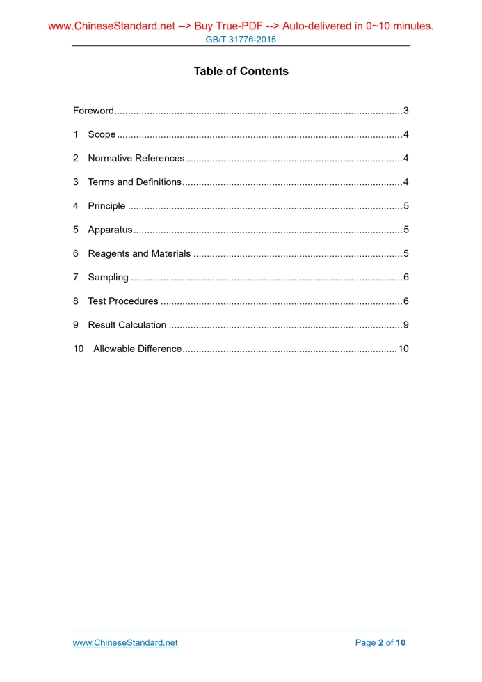Similar standardsGB/T 31776-2015: Determination Method of Methanol Content in Methanol Gasoline for Motor Vehicles---This is an excerpt. Full copy of true-PDF in English version (including equations, symbols, images, flow-chart, tables, and figures etc.), auto-downloaded/delivered in 9 seconds, can be purchased online: https://www.ChineseStandard.net/PDF.aspx/GBT31776-2015GB NATIONAL STANDARD OF THE PEOPLE’S REPUBLIC OF CHINA ICS 75.160.20 G 60 Determination Method of Methanol Content in Methanol Gasoline for Motor Vehicles Issued on: JULY 3, 2015 Implemented on: OCTOBER 1, 2015 Issued by. General Administration of Quality Supervision, Inspection and Quarantine; Standardization Administration of PRC. Table of ContentsForeword ... 3 1 Scope ... 4 2 Normative References ... 4 3 Terms and Definitions ... 4 4 Principle ... 5 5 Apparatus ... 5 6 Reagents and Materials ... 5 7 Sampling ... 6 8 Test Procedures ... 6 9 Result Calculation ... 9 10 Allowable Difference ... 10ForewordThis Standard was drafted as per the rules specified in GB/T 1.1-2009. This Standard was proposed by and under the jurisdiction of National Technical Committee for Standardization of Methanol-Ether Fuel (SAC/TC 414). Drafting organizations of this Standard. National Coal and Coal Chemical Product Quality Supervision and Inspection Center, Shanxi Wharton Co., Ltd., Shanxi Alcohol and Ether Clean Fuel Technical Center, Shaanxi Yanchang Zhongli New Energy Co., Ltd., Beijing Xiongtaoweiye Energy Technology Co., Ltd., Kailuan Energy Chemical Company Limited, and Zhongrunyou New Energy Co., Ltd.. Chief drafting staffs of this Standard. Li Yanru, Wu Yuequ, Xu Ying, Chang Yonglong, Li Jingsheng, Wang Yongmiao, Cui Jianfang, Wang Julin, Zhang Fading, and Fan Shouwei. Determination Method of Methanol Content in Methanol Gasoline for Motor Vehicles Warning. personnel using this Standard shall have hands-on experience in formal laboratory. This Standard doesn’t address all possible safety issues. Users shall assume the responsibilities to take appropriate safety and preventative measures, and ensure the compliance with the relevant national regulations.1 ScopeThis Standard specifies the terms and definitions, principle, apparatus, reagents and materials, sampling, test procedures, result calculation and allowable differences for the determination method of methanol content in methanol gasoline for motor vehicles. This Standard is not applicable to the determination of methanol content (volume fraction) in the ethanol-free methanol gasoline for motor vehicles.2 Normative ReferencesThe following documents are essential to the application of this document. For the dated documents, only the versions with the dates indicated are applicable to this document; for the undated documents, only the latest version (including all the amendments) are applicable to this document. GB/T 4756 Method for Manual Sampling of Petroleum Liquids GB/T 9722 Chemical Reagent - General Rules for the Gas Chromatography GB 17930 Gasoline for Motor Vehicles GB/T 22030 Blend stocks of Ethanol Gasoline for Motor Vehicles3 Terms and DefinitionsThe following terms and definitions are applicable to this document. 3.1 Component oil 6.2 Absolute ethanol. chromatographically pure. 6.3 Component oil. conform to GB 17930 or GB/T 22030. 6.4 Carrier gas. nitrogen with purity no less than 99.99% (volume fraction). 6.5 Fuel gas. hydrogen with purity no less than 99.99% (volume fraction). 6.6 Air. air generator. 6.7 Separator-funnel. pear-shaped, 250mL. 6.8 Pipette. 50mL, 20mL, 10mL, 5mL, 1mL. 6.9 Measuring pipette. 10mL, sub-scale value 0.1mL. 6.10 Measuring pipette. 1mL, sub-scale value 0.01mL. 6.11 Preparation of chromatography column. inject the 60 mesh ~80 mesh Porapak T packed column into the chromatography column with length 1m, and inner diameter 3mm; gently shake during the adding process, so that the filling materials can be filled tightly; both ends of the column shall reserve 2cm, where the glass wool shall be filled, so that ensure the filling materials can’t overflow. Prior to use, conduct the aging operation against the column when the column box temperature is at 180°C till the instrument baseline is stable.7 Sampling7.1 Sampling as per the procedure stipulated in GB/T 4765, take 2L of sample for inspection and retention sample use. 7.2 Sample shall be stored at 0°C~5°C. 7.3 Before analysis, shake the sample thoroughly to see if the sample has significant phase separation. If so, discard the sample; re-sampling is required.8 Test Procedures8.1 Sample preparation When analyzing, the sample, internal standard substance (6.2), distilled water and the container weighing the sample are required to be equilibrated at certain temperature. 8.2 Chromatographic analysis ......Source: Above contents are excerpted from the full-copy PDF -- translated/reviewed by: www.ChineseStandard.net / Wayne Zheng et al. Tips & Frequently Asked Questions:Question 1: How long will the true-PDF of English version of GB/T 31776-2015 be delivered?Answer: The full copy PDF of English version of GB/T 31776-2015 can be downloaded in 9 seconds, and it will also be emailed to you in 9 seconds (double mechanisms to ensure the delivery reliably), with PDF-invoice.Question 2: Can I share the purchased PDF of GB/T 31776-2015_English with my colleagues?Answer: Yes. The purchased PDF of GB/T 31776-2015_English will be deemed to be sold to your employer/organization who actually paid for it, including your colleagues and your employer's intranet.Question 3: Does the price include tax/VAT?Answer: Yes. Our tax invoice, downloaded/delivered in 9 seconds, includes all tax/VAT and complies with 100+ countries' tax regulations (tax exempted in 100+ countries) -- See Avoidance of Double Taxation Agreements (DTAs): List of DTAs signed between Singapore and 100+ countriesQuestion 4: Do you accept my currency other than USD?Answer: Yes. www.ChineseStandard.us -- GB/T 31776-2015 -- Click this link and s