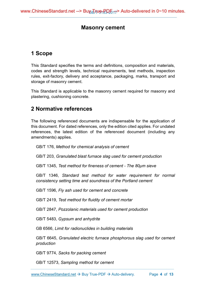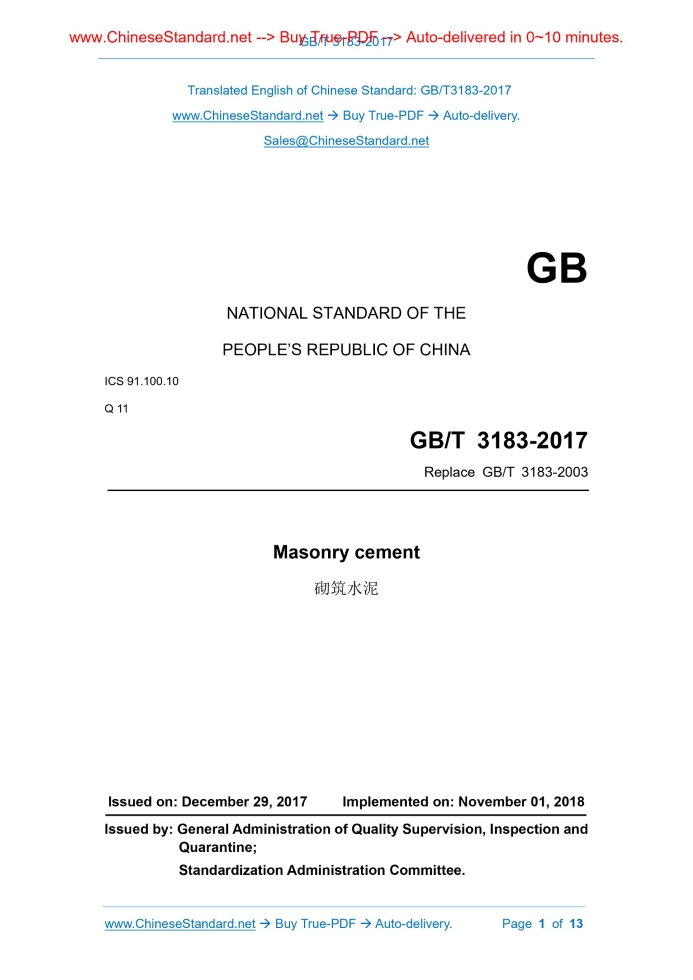 GB/T 3183-2017: Masonry cement Delivery: 9 seconds. True-PDF full-copy in English & invoice will be downloaded + auto-delivered via email. See step-by-step procedure Status: Valid GB/T 3183: Historical versions