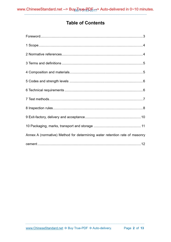 GB/T 3183-2017: Masonry cement---This is an excerpt. Full copy of true-PDF in English version (including equations, symbols, images, flow-chart, tables, and figures etc.), auto-downloaded/delivered in 9 seconds, can be purchased online: https://www.ChineseStandard.net/PDF.aspx/GBT3183-2017GB NATIONAL STANDARD OF THE PEOPLE’S REPUBLIC OF CHINA ICS 91.100.10 Q 11 Replace GB/T 3183-2003 Masonry cement 砌筑水泥 Issued on: DECEMBER 29, 2017 Implemented on: NOVEMBER 01, 2018 Issued by. General Administration of Quality Supervision, Inspection and Quarantine; Standardization Administration Committee. Table of ContentsForeword ... 3 1 Scope ... 4 2 Normative references ... 4 3 Terms and definitions ... 5 4 Composition and materials... 5 5 Codes and strength levels ... 6 6 Technical requirements ... 6 7 Test methods ... 7 8 Inspection rules ... 8 9 Exit-factory, delivery and acceptance ... 10 10 Packaging, marks, transport and storage ... 11 Annex A (normative) Method for determining water retention rate of masonry cement ... 12 Masonry cement1 ScopeThis Standard specifies the terms and definitions, composition and materials, codes and strength levels, technical requirements, test methods, inspection rules, exit-factory, delivery and acceptance, packaging, marks, transport and storage of masonry cement. This Standard is applicable to the masonry cement required for masonry and plastering, cushioning concrete.2 Normative referencesThe following referenced documents are indispensable for the application of this document. For dated references, only the edition cited applies. For undated references, the latest edition of the referenced document (including any amendments) applies. GB/T 176, Method for chemical analysis of cement GB/T 203, Granulated blast furnace slag used for cement production GB/T 1345, Test method for fineness of cement - The 80μm sieve GB/T 1346, Standard test method for water requirement for normal consistency setting time and soundness of the Portland cement GB/T 1596, Fly ash used for cement and concrete GB/T 2419, Test method for fluidity of cement mortar GB/T 2847, Pozzolanic materials used for cement production GB/T 5483, Gypsum and anhydrite GB 6566, Limit for radionuclides in building materials GB/T 6645, Granulated electric furnace phosphorous slag used for cement production GB/T 9774, Sacks for packing cement GB/T 12573, Sampling method for cement Setting time, boiling stability are tested according to GB/T 1346. 7.5 Water retention rate Water retention rate is tested according to the method specified in Annex A. 7.6 Strength Strength is tested according to GB/T 17671. The water consumption of cement mortar is determined according to the fluidity of the mortar to reach 180mm~190mm. The fluidity of the mortar is tested according to GB/T 2419, of which the preparation of rubber sand is according to GB/T 17671. When the strength of the cement is low, it is not easy to demold the mold after 24 h after molding, and the curing time can be extended appropriately. However, the total moisture maintenance time must not exceed 48h and shall be recorded. 7.7 Radioactivity Radioactivity is tested according to GB 6566.8 Inspection rules8.1 Batching and sampling 8.1.1 Batching Cement is batched and sampled according to the same strength level before leaving the factory. Bagged cement and bulk cement shall be batched and sampled separately. The cement batch number is according to the annual production capacity of the cement enterprise. Each batch number is a sampling unit. - annual production capacity of 60×104t or more, no more than 1000t for a batch number; - annual production capacity of 30×104t ~ 60×104t, no more than 600t for a batch number; - annual production capacity of 10×104t ~ 30×104t, no more than 400t for a batch number; - annual production capacity of 10×104t or less, no more than 200t for a batch number. When the capacity of the bulk cement transport vehicle exceeds the tonnage of the factory batch number specified by the factory, the quantity of the batch 8.3.2.2 The product is rejected when the inspection results fail to meet any technical requirements of Clause 6. 8.4 Inspection report The inspection report shall at least include the exit-factory batch number, exit- factory inspection items, cement components, gypsum type, main components and dosage of grinding aids, and other technical requirements stipulated in the contract. When requested by the user, the producer shall send the inspection results except for the 28d strength within 11d from the date of cement release. Report the inspection results of 28d strength.9 Exit-factory, delivery and acceptance9.1 Exit-factory It is confirmed that the technical indicators and packaging of cement meet the requirements before leaving the factory. 9.2 Delivery and acceptance 9.2.1 The cement quality acceptance at the time of delivery can be either based on the inspection results of the physical samples or the inspection report of the cement of the same batch. The method of acceptance is agreed upon by the purchaser and the supplier, which shall be stated in the contract or agreement. The supplier has the responsibility to inform the purchaser of the acceptance method. When there is no written contract or agreement, or the acceptance method is not specified in the contract or agreement, the supplier shall indicate on the invoice that the “inspection report of the cement of the same batch of the factory is the basis for acceptance”. 9.2.2 When the inspection result of the physical sample is taken as the basis for acceptance, the purchaser and the supplier shall jointly sample and seal before delivery or at the place of delivery. The sampling method is carried out in accordance with the provisions of GB/T 12573. Take 24 kg of sample and dilute into two equal parts. One is kept by the supplier for 40d, and the other is inspected by the purchaser according to the items and methods specified in this Standard. Within 