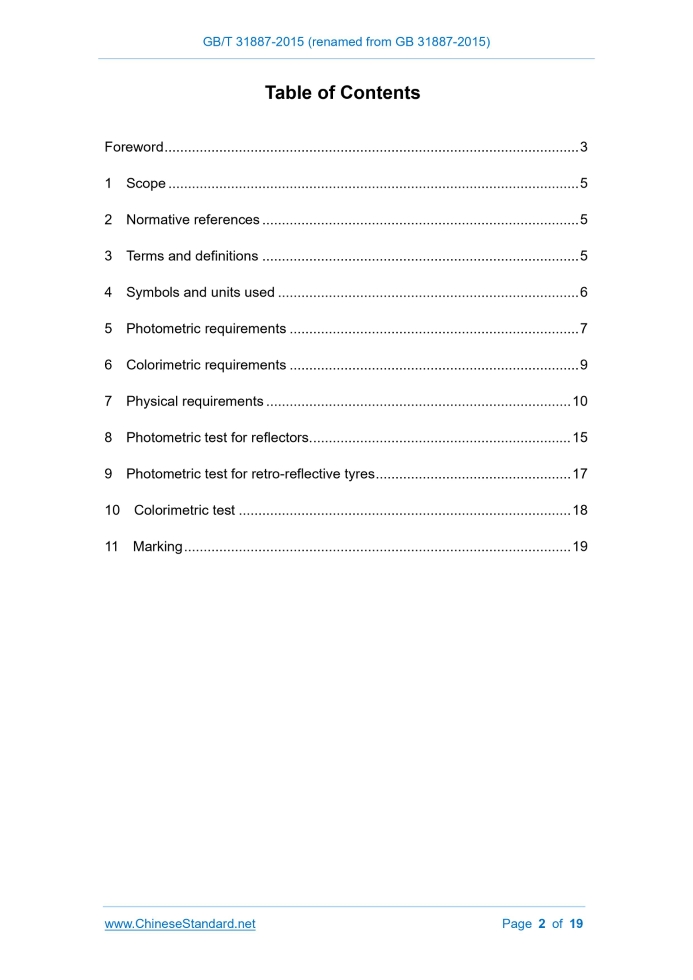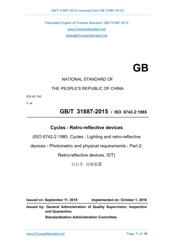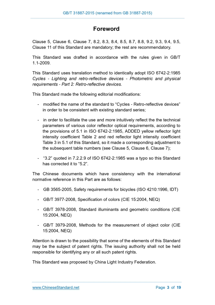 Similar standardsGB/T 31887-2015: Cycles -- Retro-reflective devices---This is an excerpt. Full copy of true-PDF in English version (including equations, symbols, images, flow-chart, tables, and figures etc.), auto-downloaded/delivered in 9 seconds, can be purchased online: https://www.ChineseStandard.net/PDF.aspx/GBT31887-2015GB NATIONAL STANDARD OF THE PEOPLE’S REPUBLIC OF CHINA ICS 43.150 Y 14 GB/T 31887-2015 / ISO 6742-2:1985 Cycles - Retro-reflective devices (ISO 6742-2:1985, Cycles - Lighting and retro-reflective devices - Photometric and physical requirements - Part 2: Retro-reflective devices, IDT) ISSUED ON: SEPTEMBER 11, 2015 IMPLEMENTED ON: OCTOBER 1, 2016 Issued by: General Administration of Quality Supervision, Inspection and Quarantine; Standardization Administration Committee. Table of ContentsForeword ... 3 1 Scope ... 5 2 Normative references ... 5 3 Terms and definitions ... 5 4 Symbols and units used ... 6 5 Photometric requirements ... 7 6 Colorimetric requirements ... 9 7 Physical requirements ... 10 8 Photometric test for reflectors ... 15 9 Photometric test for retro-reflective tyres ... 17 10 Colorimetric test ... 18 11 Marking ... 19ForewordClause 5, Clause 6, Clause 7, 8.2, 8.3, 8.4, 8.5, 8.7, 8.8, 9.2, 9.3, 9.4, 9.5, Clause 11 of this Standard are mandatory; the rest are recommendatory. This Standard was drafted in accordance with the rules given in GB/T 1.1-2009. This Standard uses translation method to identically adopt ISO 6742-2:1985 Cycles - Lighting and retro-reflective devices - Photometric and physical requirements - Part 2: Retro-reflective devices. This Standard made the following editorial modifications: - modified the name of the standard to “Cycles - Retro-reflective devices” in order to be consistent with existing standard series; - in order to facilitate the use and more intuitively reflect the the technical parameters of various color reflector optical requirements, according to the provisions of 5.1 in ISO 6742-2:1985, ADDED yellow reflector light intensity coefficient Table 2 and red reflector light intensity coefficient Table 3 in 5.1 of this Standard, so it made a corresponding adjustment to the subsequent table numbers (see Clause 5, Clause 6, Clause 7); - “3.2” quoted in 7.2.2.9 of ISO 6742-2:1985 was a typo so this Standard has corrected it to “5.2”. The Chinese documents which have consistency with the international normative reference in this Part are as follows: - GB 3565-2005, Safety requirements for bicycles (ISO 4210:1996, IDT) - GB/T 3977-2008, Specification of colors (CIE 15:2004, NEQ) - GB/T 3978-2008, Standard illuminants and geometric conditions (CIE 15:2004, NEQ) - GB/T 3979-2008, Methods for the measurement of object color (CIE 15:2004, NEQ) Attention is drawn to the possibility that some of the elements of this Standard may be the subject of patent rights. The issuing authority shall not be held responsible for identifying any or all such patent rights. This Standard was proposed by China Light Industry Federation. Cycles - Retro-reflective devices1 ScopeThis Standard specifies photometric and physical requirements for retro-reflective devices for fitting to cycles. This Standard is applicable to retro-reflective devices intended to be used on public roads and, in particular, for use on cycles made in compliance with ISO 4210.2 Normative referencesThe following referenced documents are indispensable for the application of this document. For dated references, only the edition cited applies. For undated references, the latest edition of the referenced document (including any amendments) applies. ISO 3768, Metallic coatings - Neutral salt spray test (NSS test) ISO 4210, Cycles - Safety requirements of bicycles IEC Publication No.50 (45), International Electrotechnical Vocabulary - Lighting CIE Publication No.15, Colorimetry: Official recommendations of the International Commission on Illumination (CIE)3 Terms and definitionsFor the purposes of this document, the definitions given below, together with those in IEC Publication No. 50(45) apply. 3.1 retro-reflective device; reflector An assembly ready for use and comprising one or more retro-reflecting optical units. 3.2 wide angle reflector Device providing retro-reflection through horizontal entrance angles of not less than 50° on either side of the reference axis. the inflated tyre by abrasion with a wet, steel-bristle brush, tyre material will be removed with the retro-reflective material. 7.2.2.6 Impact resistance When tested by the following method the retro-reflective material shall show no cracking or separation from the tyre outside a distance of half the width of the material from the point of impact. Condition the test sample for 1 hat -20±5°C. Immediately after removal from the cold storage, place the sample on a solid support base and subject the retro-reflective area to an impact from a 25 mm diameter solid steel ball dropped from a height of 2 m. 7.2.2.6 Resistance to corrosion After being tested by the method specified in ISO 3768 there shall be no evidence of corrosion of the retro-reflective material that would result in failure to meet 75% of the CIL values in table 5, at α = 0°12’ or 0°20’ and β = -4°. The duration of the test shall be 50 h comprising two periods of exposure of 24 h each, separated by an interval of 2 h during which time the sample is allowed to dry. 7.2.2.7 Resistance to fuel Lightly rub the retro-reflective area of the test sample with a cotton cloth soaked in a test fuel composed of 70% n-heptane and 30% toluene (by volume). After 5 min clean the retro-reflective area by washing in a detergent solution and rinse in clean water. 7.2.2.8 Resistance to lubricating oil Lightly rub the retro-reflective area of the test sample with a cotton cloth soaked in a detergent lubricating oil. After 5 min wipe the area clean with a mild aliphatic solvent such as heptane and follow by washing with a neutral detergent and rinsing in