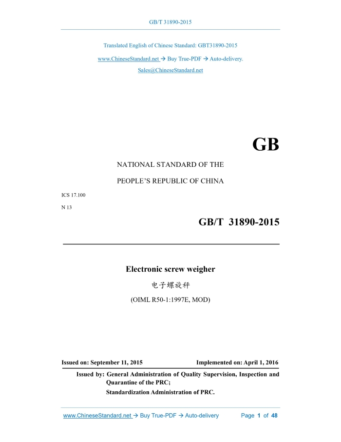 GB/T 31890-2015: Electronic screw weigher Delivery: 9 seconds. True-PDF full-copy in English & invoice will be downloaded + auto-delivered via email. See step-by-step procedure Status: Valid