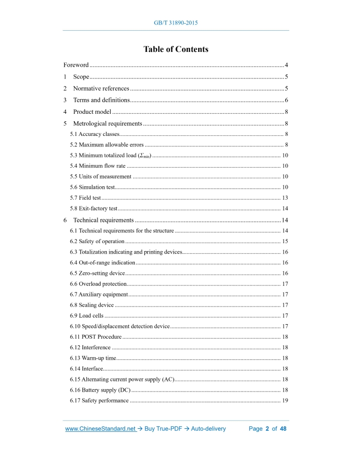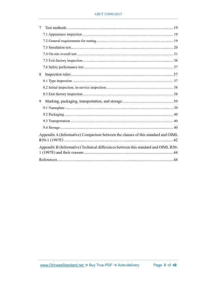 Similar standardsGB/T 31890-2015: Electronic screw weigher---This is an excerpt. Full copy of true-PDF in English version (including equations, symbols, images, flow-chart, tables, and figures etc.), auto-downloaded/delivered in 9 seconds, can be purchased online: https://www.ChineseStandard.net/PDF.aspx/GBT31890-2015GB NATIONAL STANDARD OF THE PEOPLE’S REPUBLIC OF CHINA ICS 17.100 N 13 Electronic screw weigher (OIML R50-1.1997E, MOD) Issued on. SEPTEMBER 11, 2015 Implemented on. APRIL 1, 2016 Issued by. General Administration of Quality Supervision, Inspection and Quarantine of the PRC; Standardization Administration of PRC. Table of ContentsForeword... 4 1 Scope... 5 2 Normative references... 5 3 Terms and definitions... 6 4 Product model... 8 5 Metrological requirements... 8 5.1 Accuracy classes... 8 5.2 Maximum allowable errors... 8 5.3 Minimum totalized load (Σmin)... 10 5.4 Minimum flow rate... 10 5.5 Units of measurement... 10 5.6 Simulation test... 10 5.7 Field test... 13 5.8 Exit-factory test... 14 6 Technical requirements... 14 6.1 Technical requirements for the structure... 14 6.2 Safety of operation... 15 6.3 Totalization indicating and printing devices... 16 6.4 Out-of-range indication... 16 6.5 Zero-setting device... 16 6.6 Overload protection... 17 6.7 Auxiliary equipment... 17 6.8 Sealing device... 17 6.9 Load cells... 17 6.10 Speed/displacement detection device... 17 6.11 POST Procedure... 18 6.12 Interference... 18 6.13 Warm-up time... 18 6.14 Interface... 18 6.15 Alternating current power supply (AC)... 18 6.16 Battery supply (DC)... 18 6.17 Safety performance... 19 7 Test methods... 19 7.1 Appearance inspection... 19 7.2 General requirements for testing... 19 7.3 Simulation test... 20 7.4 On-site overall test... 31 7.5 Exit-factory inspection... 36 7.6 Safety performance test... 37 8 Inspection rules... 37 8.1 Type inspection... 37 8.2 Initial inspection, in-service inspection... 38 8.3 Exit-factory inspection... 38 9 Marking, packaging, transportation, and storage... 39 9.1 Nameplate... 39 9.2 Packaging... 40 9.3 Transportation... 40 9.4 Storage... 40 Appendix A (Informative) Comparison between the clauses of this standard and OIML R50-1 (1997E)... 42 Appendix B (Informative) Technical differences between this standard and OIML R50- 1 (1997E) and their reasons... 44 References... 48ForewordThis standard is drafted in accordance with the rules given in GB/T 1.1-2009. This standard is redrafted and modified in relation to the International Recommendation of OIML R50-1 “Continuous totalizing automatic weighing instruments (belt weighers) - Part 1.Metrological and technical requirements - Tests” (1997E). Since the current management mode of measuring products in China is different from the international ones, this standard has more adjustments in structure compared with R50 International Recommendations. For the convenience of comparison, a comparative list of the clauses of this standard to the clauses of International Recommendation is given in informative appendix A. Due to the legal requirements of China and the special needs of the industry, this standard has been modified when international recommendations are adopted. These technical differences are indicated by a single vertical line in the margin of the clause to which they refer. A list of technical differences and their reasons is given in Appendix B for reference. This standard is proposed by China National Light Industry Council. This standard shall be under the jurisdiction of China Weighing Instrument Standardization Technical Committee (SAC/TC97). Drafting organizations of this standard. Saimo Electric Co., Ltd., Jiangsu Institute of Metrology, Nanjing San’ai Industrial Control Co., Ltd., Tongling City SSS Electronics Co., Ltd. The main drafters of this standard. Li Da, He Fusheng, Hu Qiang, Lu Qinsheng, Xu Housheng. Electronic screw weigher1 ScopeThis standard specifies the terms, product models, requirements, test methods, inspection rules, marking, packaging, transportation, and storage of electronic screw weighers (also known as screw reamer scales, screw feeder scales, hereinafter referred to as “screw weighers”).2 Normative referencesThe following documents are essential to the application of this document. For the dated documents, only the versions with the dates indicated are applicable to this document; for the undated documents, only the latest version (including all the amendments) is applicable to this standard. GB/T 191 Packaging - Pictorial marking for handling of goods (GB/T 191-2008, ISO 780.1997, MOD)3 Terms and definitionsThe terms and definitions defined in GB/T 14250-2008 and the followings apply to this document. The intrinsic error of a screw weigher that is determined before the performance test and durability test.4 Product modelIt shall be compiled according to GB/T 26389-2011.5 Metrological requirementsIn the temperature range of -10 °C~+40 °C, the screw weigher shall meet the corresponding metrological requirements and technical requirements.6 Technical requirementsFor a screw weigher, there shall be no accidental failure or control component maladjustment that is not obvious and may interfere with the metrological performance and normal function of the screw weigher.7 Test methodsIt shall be kept free of moisture condensation on the weighing unit of the screw weigher under test. The electrostatic discharge test shall be carried out according to GB/T 17626.2, and the test level shall be level 3.8 Inspection rulesFor type inspection, 1 test prototype shall be randomly selected from the qualified products, and the sampling base shall not be less than 3. The initial inspection of a screw weigher shall be carried out after the on-site installation is completed, and the in-service inspection shall be carried out regularly according to its use requirements.9 Marking, packaging, transportation, and storageUnder normal conditions of use, descriptive signs shall be firm an